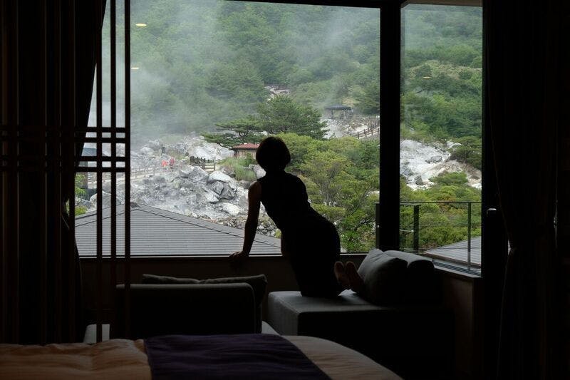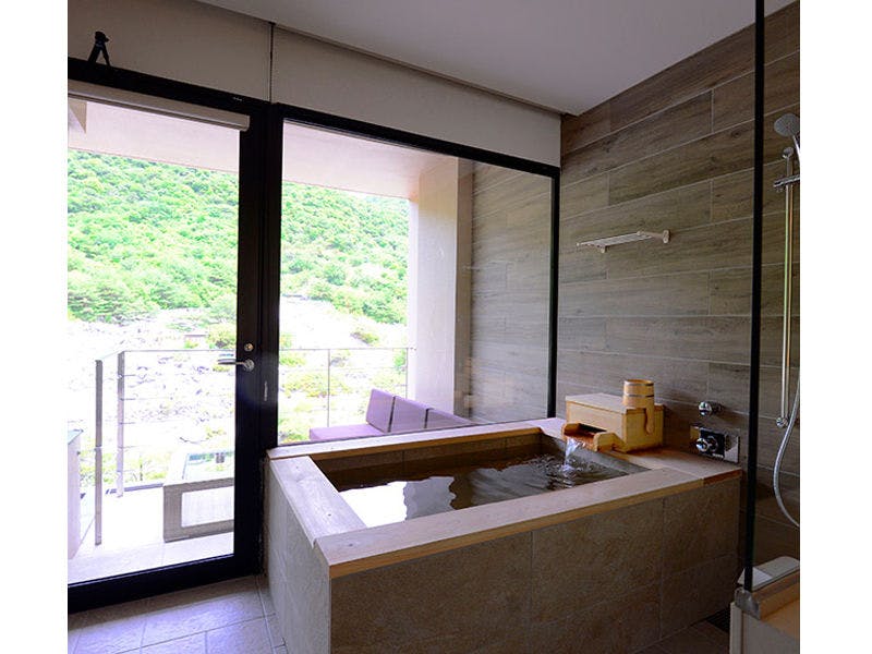 地獄谷眺望で、客室内に源泉掛け流し100%とまでは行きませんが、温泉半露天風呂のバスルームにテラス、ウオークインクローゼットや開閉式デスク型ドレッサーなど機能性もある60平米(テラス含む)以上の和洋室です。