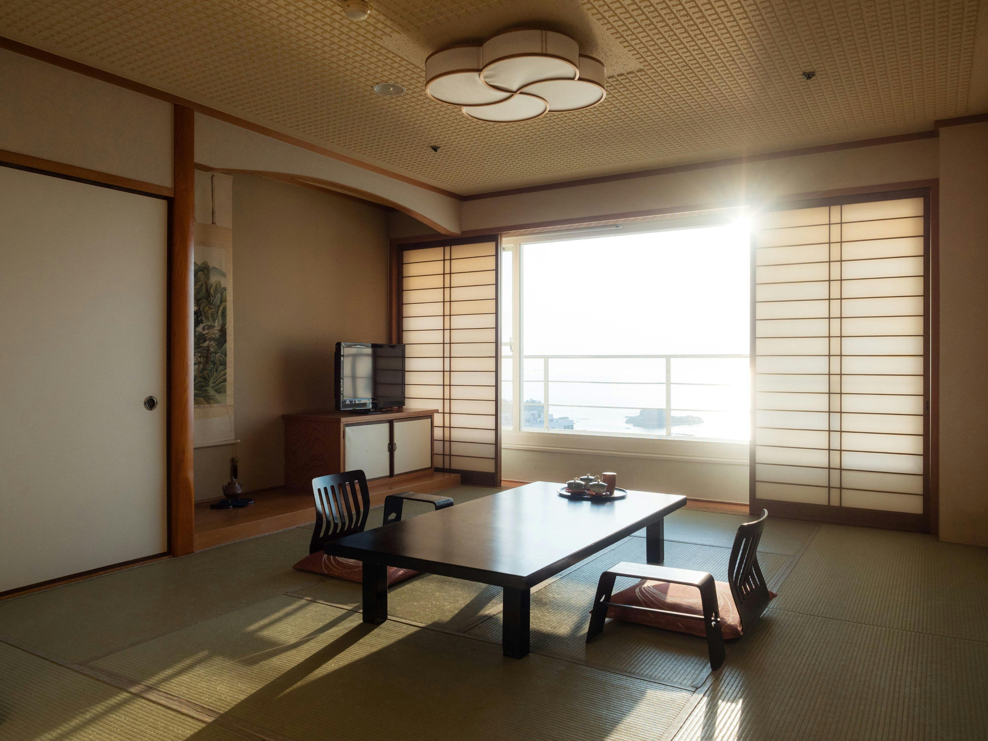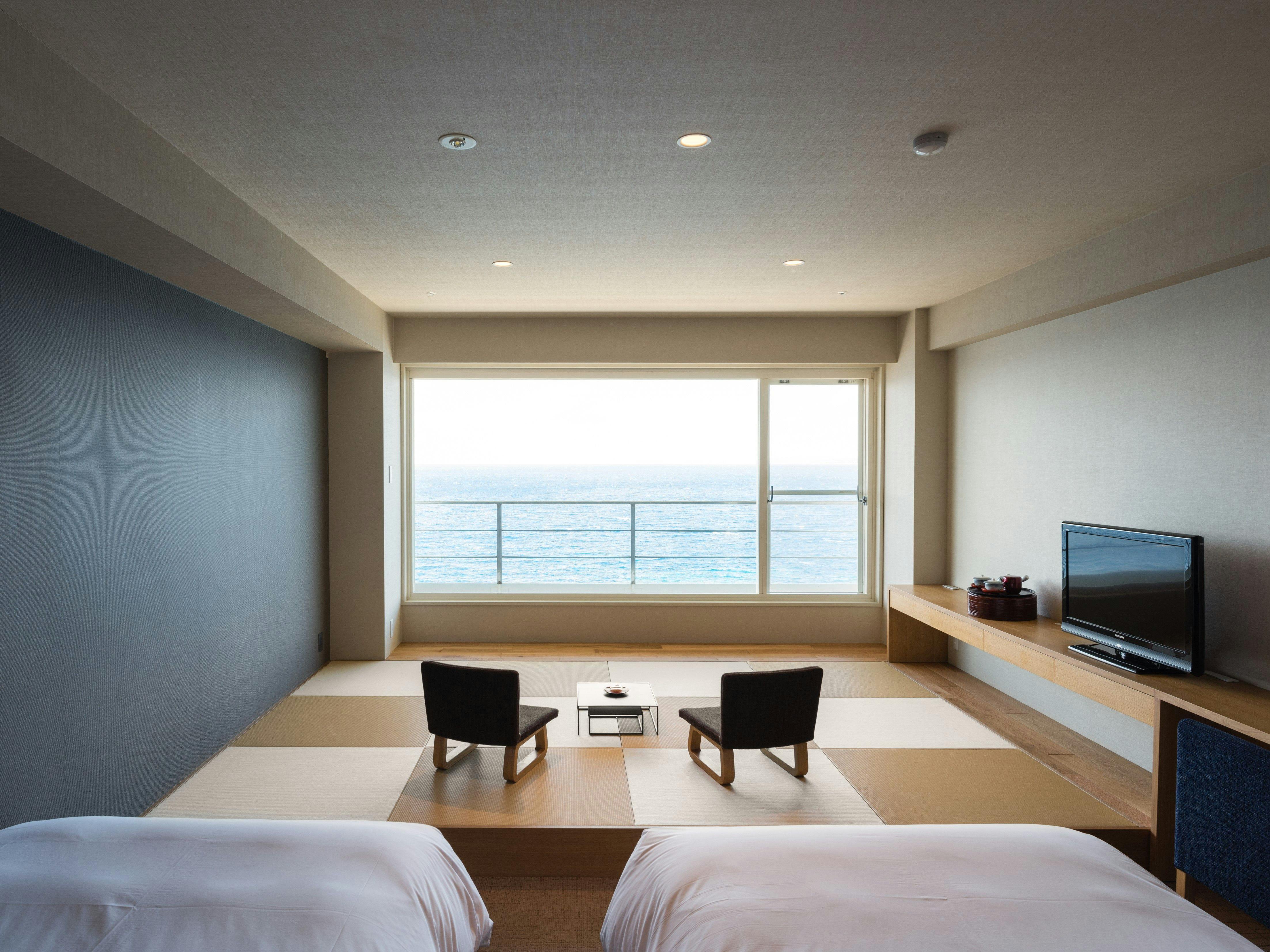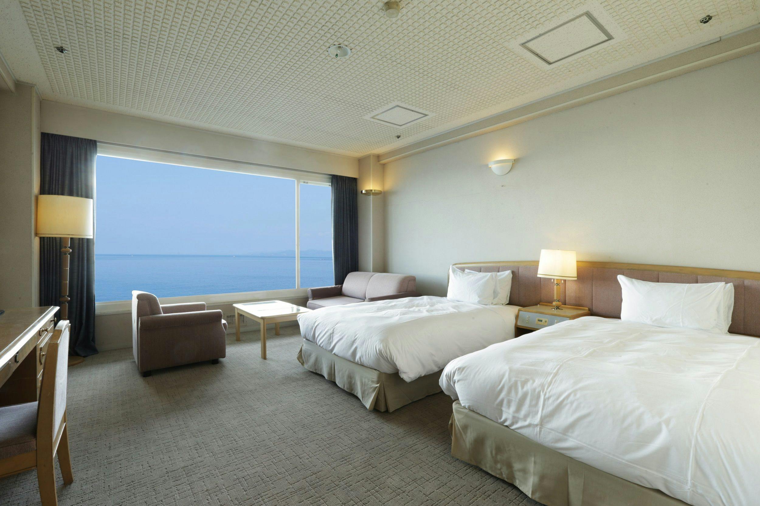 ■特記事項:正面に太平洋を臨む畳小上り付きのデラックスツインルームでございます。(ベッド2台+敷布団2枚)
