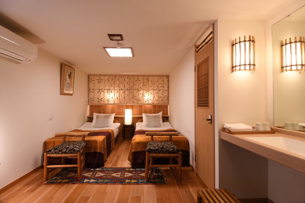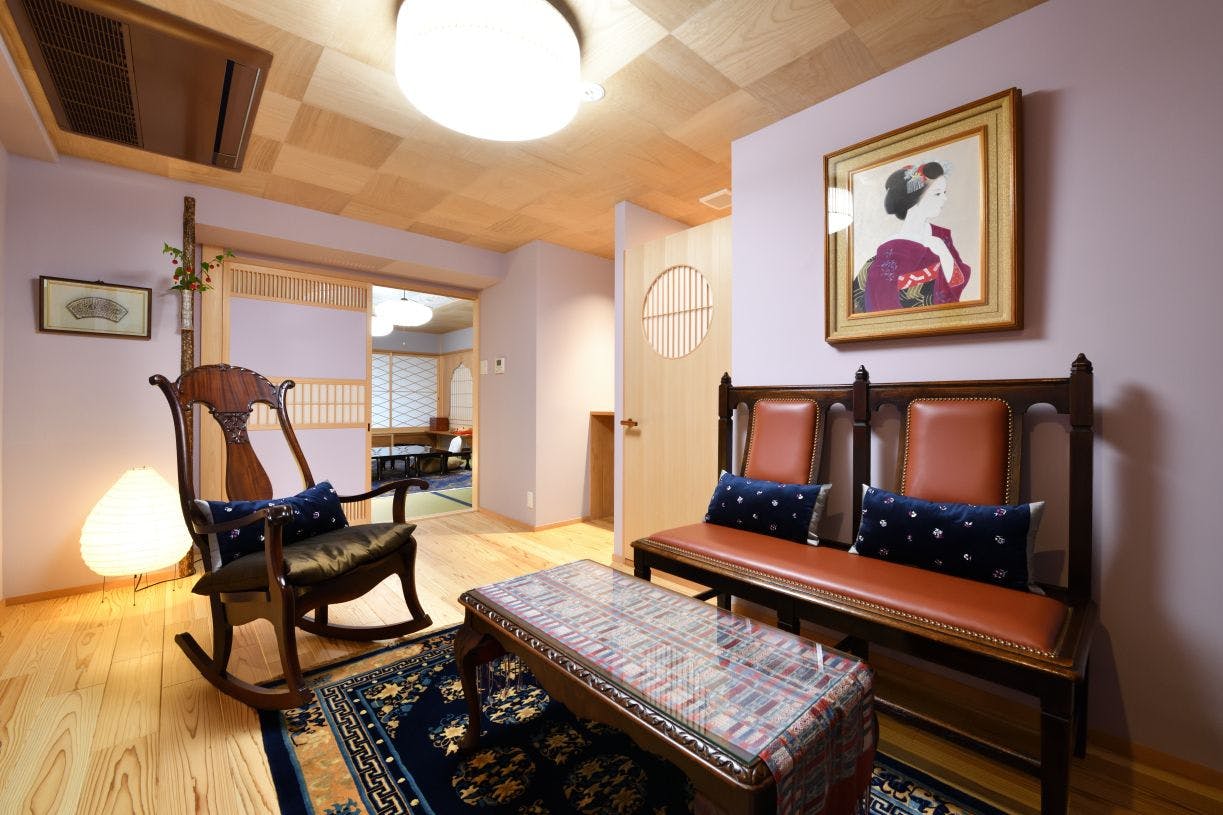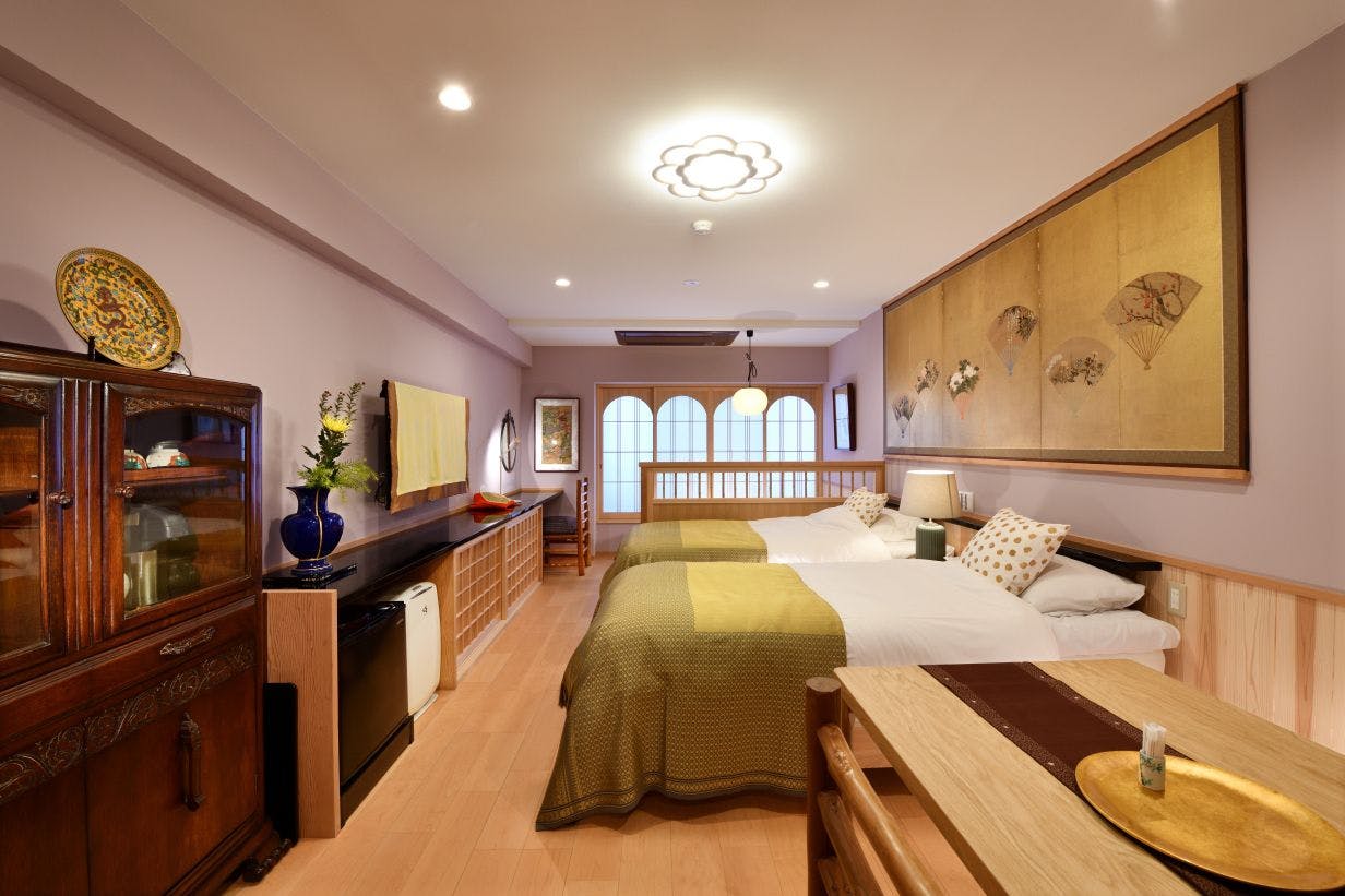 新館の広々とした和洋室をご用意致します。坪庭付で和風情緒が味わえます。最大7名様(ベッド2名+布団5名)までご利用可能ですので、3世代のご利用に最適です。無線LANがあるので、インターネット可能です。※小型犬同伴などの条件がある方のお受入はいたしかねます。それぞれ該当するプランからご予約お願いいたします。