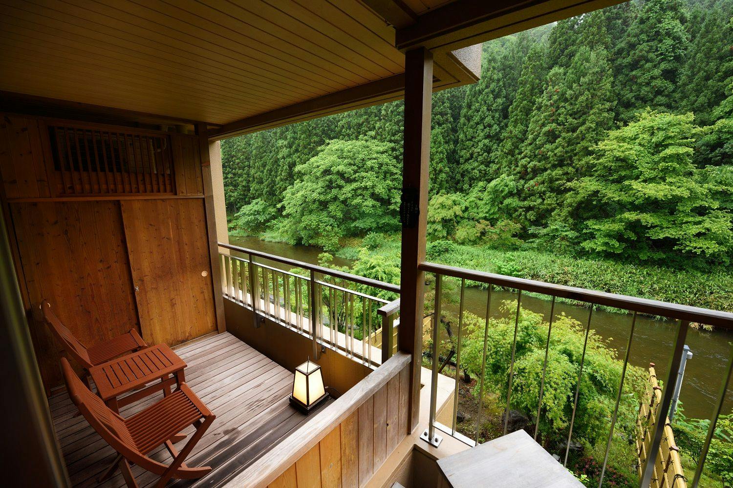 ・庭園と川が楽しめるバルコニーとチェア。