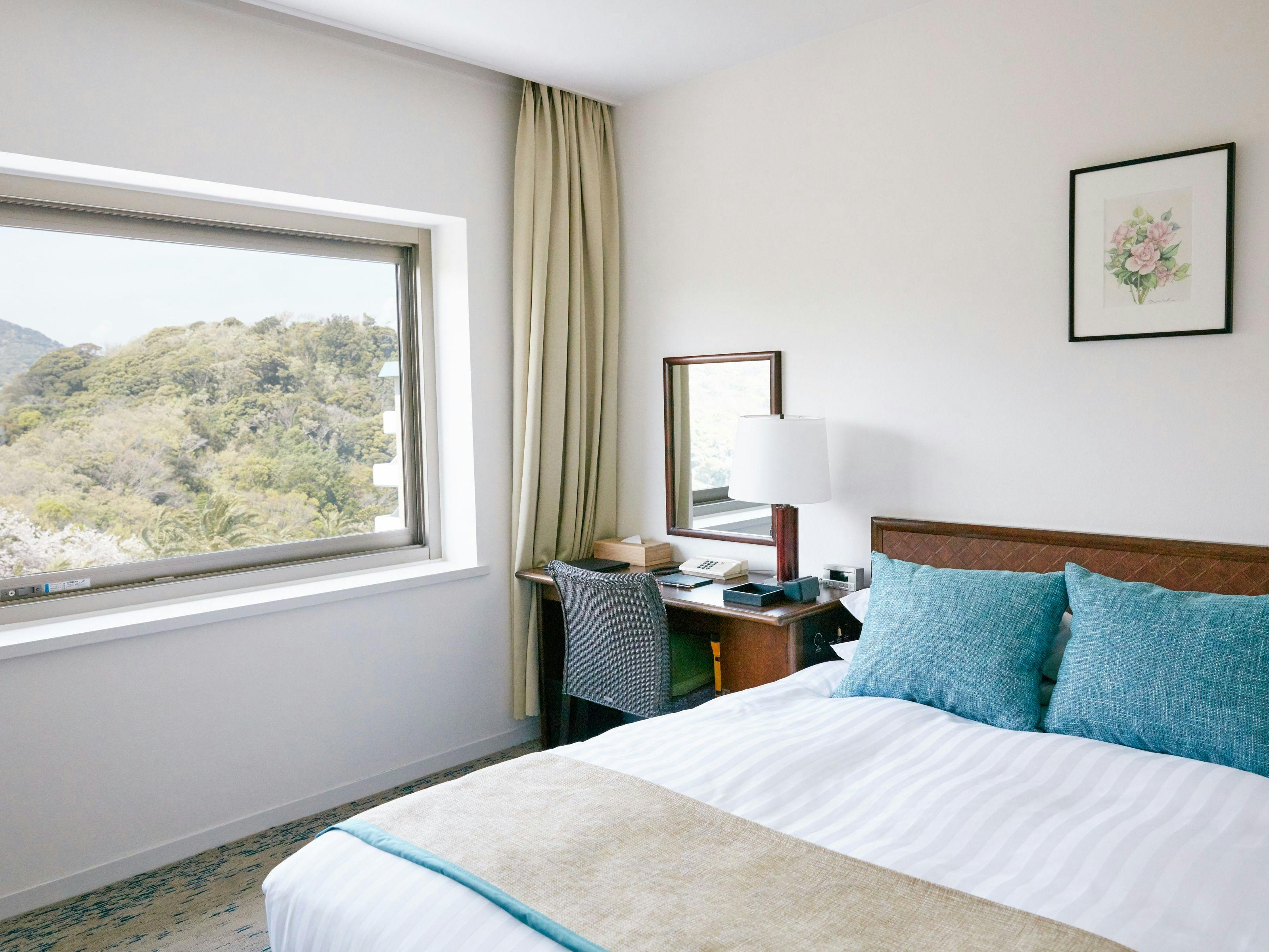 バルコニーの付いたツインルーム。窓を開けると、さわやかな潮風が磯の香りを運んできます。バルコニーに出ると右手に海がご覧頂ける、パーシャル・オーシャンビューでございます。●3名様以上はツインにエキストラベッドの追加となります。