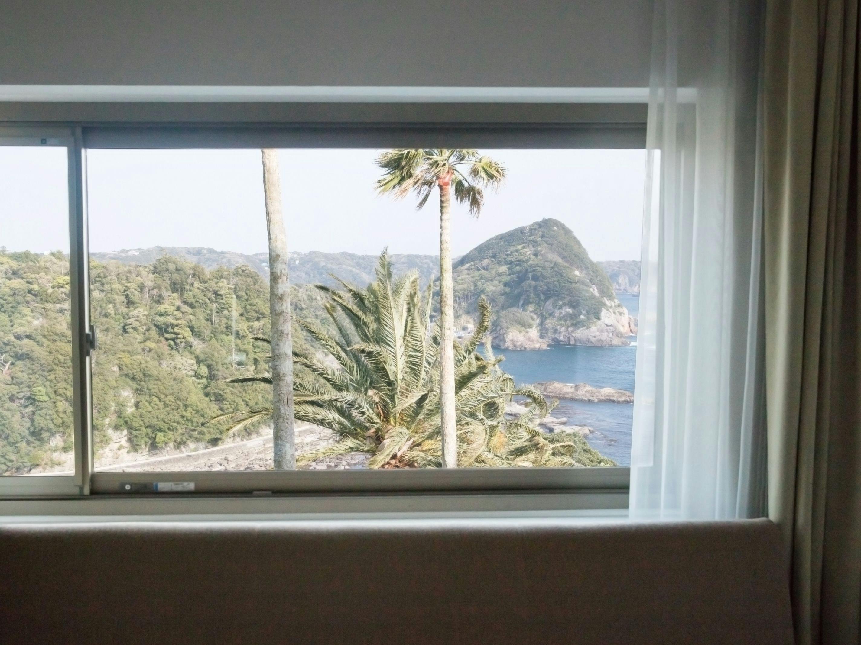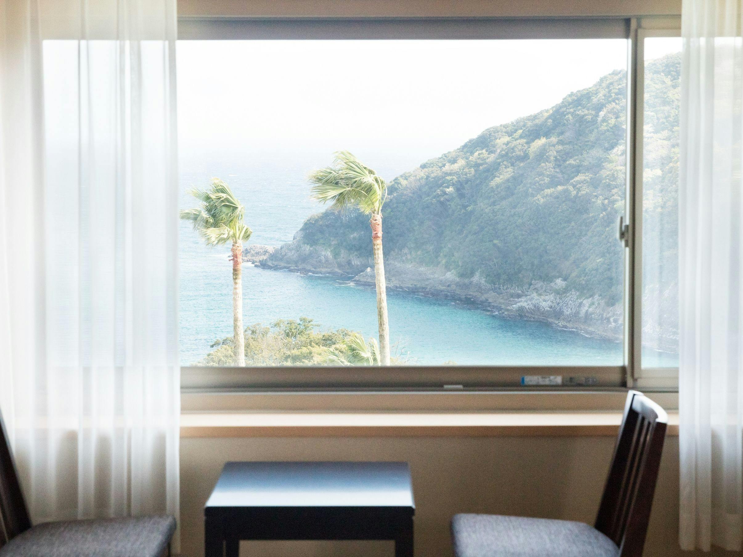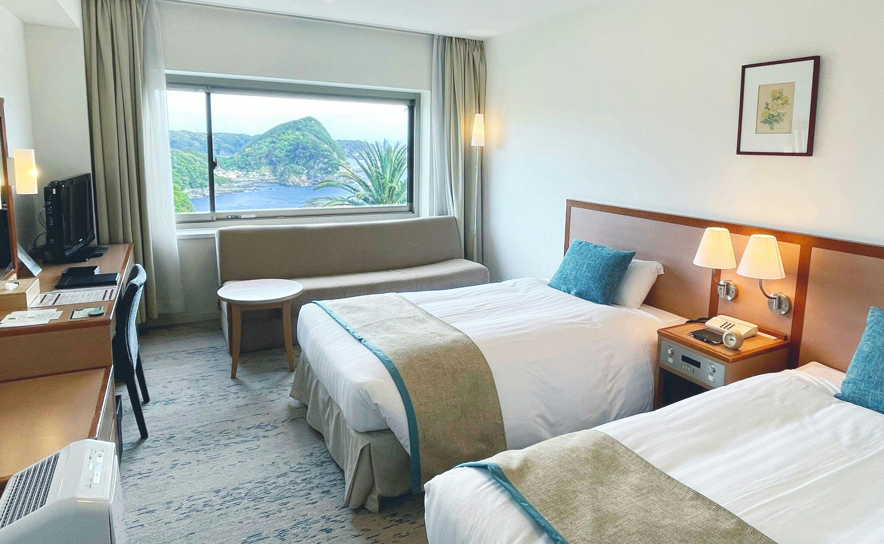 4階・5階の各フロアーに1室ずつの人気のデラックスツインルーム。建物中央部に位置するこのお部屋からのオーシャンビューは、まさに絶景。贅沢なゆとりの空間が優雅な時間を演出致します。記念日など大切な日のご宿泊に、お勧めでございます。●オーシャンフロントのお部屋です。お部屋の窓から海を一望頂けます。