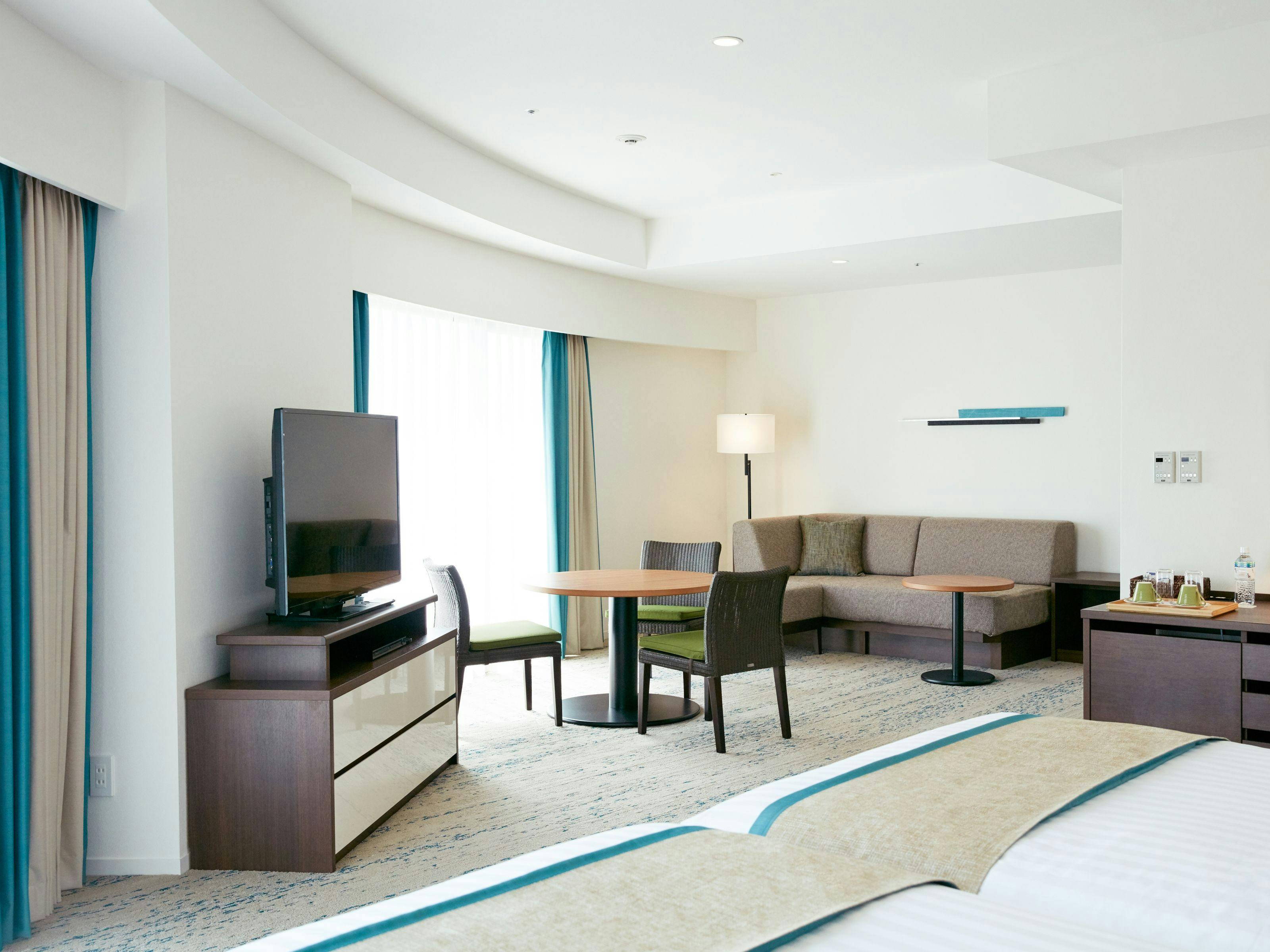 ホテル唯一のビューバスルームと、広々ジュニアスイートがコネクトされた、贅沢で寛ぎにあふれた客室です。海を望む大きな窓、バルコニーに出てみれば心地よい潮風が素敵なリゾートステイに彩りを添えます。記念日など大切な日のご宿泊に、お勧めでございます。