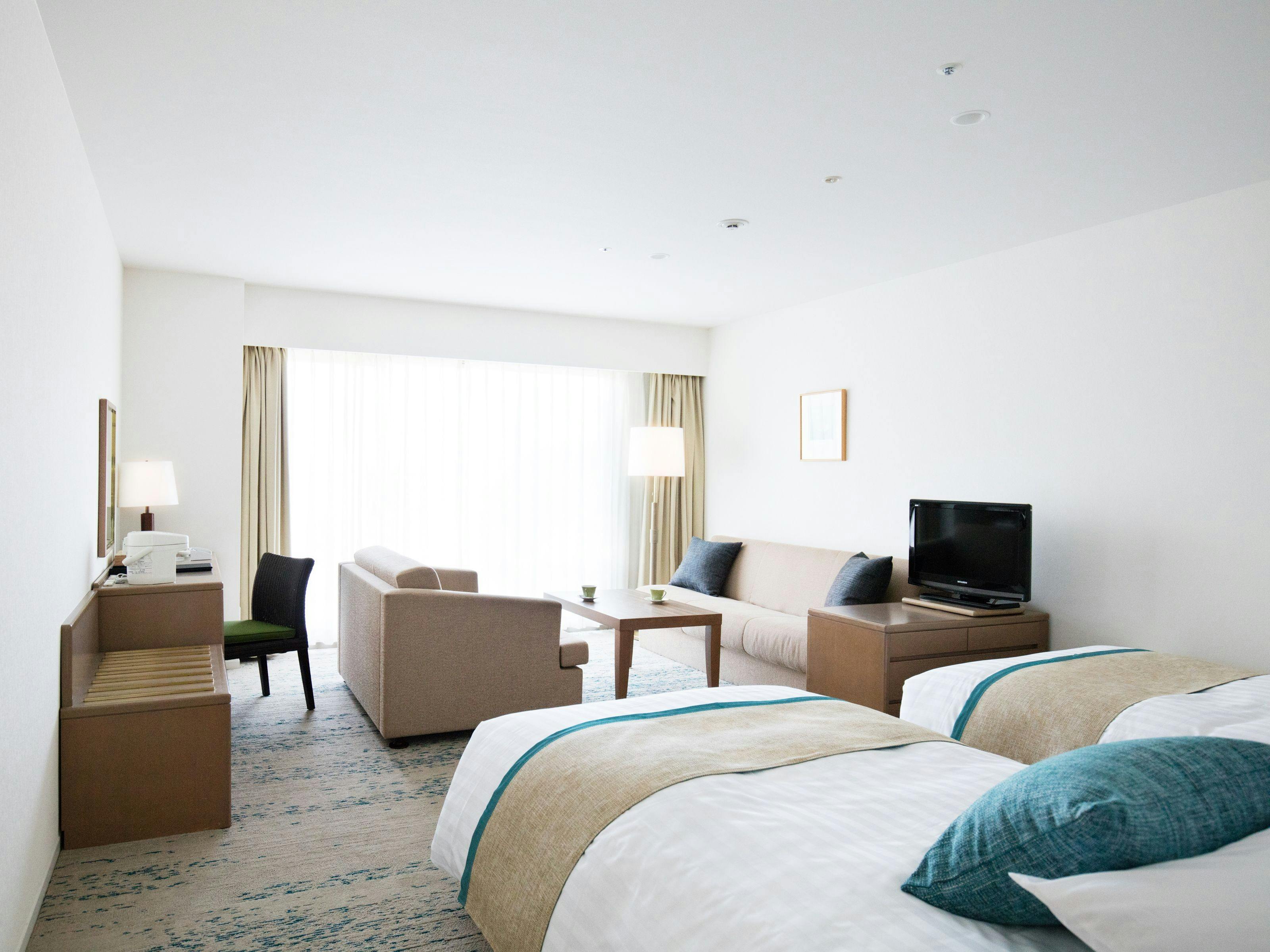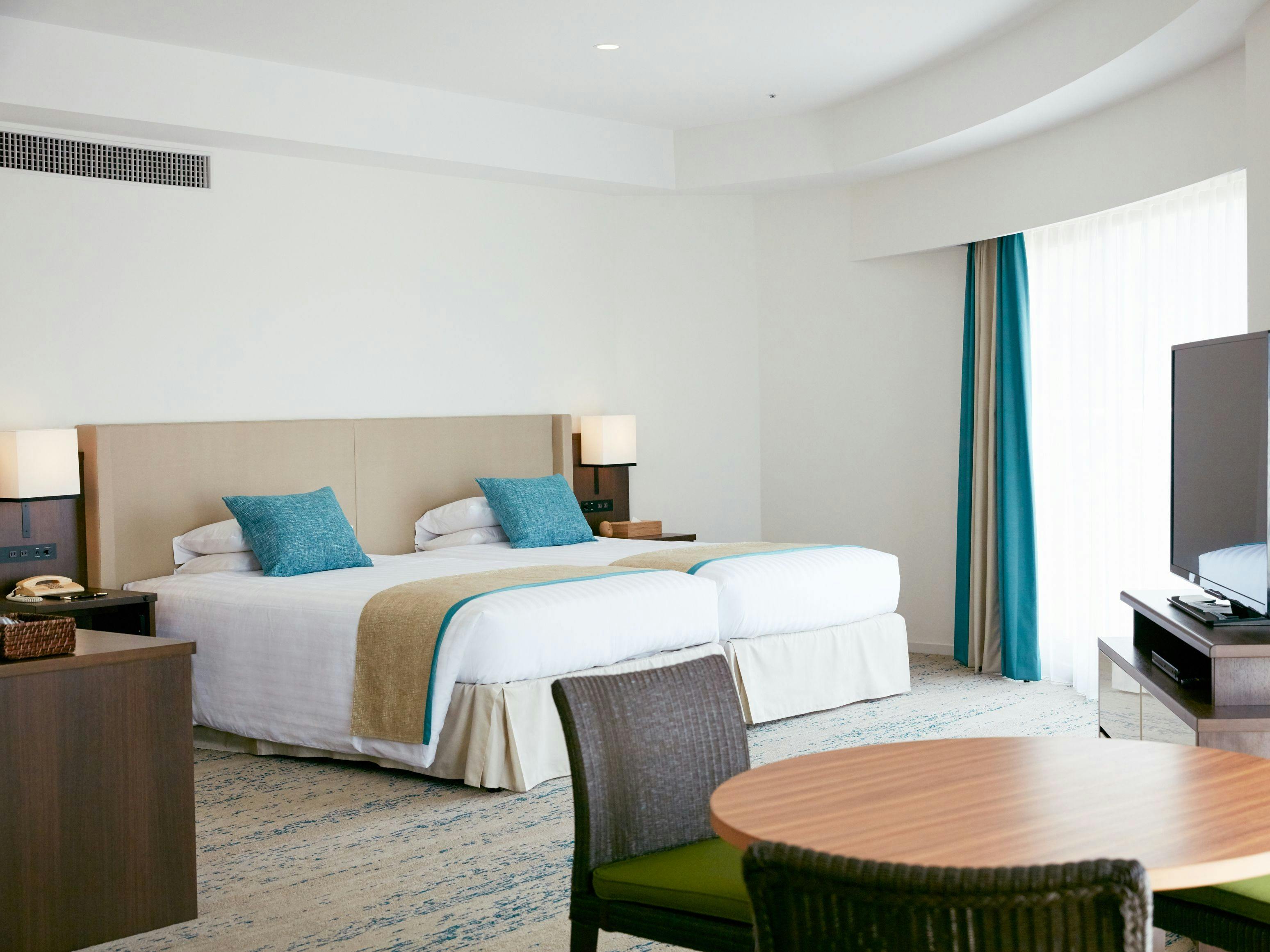 オリーブグリーンとターコイズブルーを基調としたデザインが新しいスーペリアルームは高層階より海辺のリゾート感を満喫!海を一望頂けるオーシャンフロント・ハリウッドスタイルのツインベッドルームでございます。ホテル自慢の絶景を、思う存分お愉しみ下さいませ。●3名様1室ご利用の場合、1名様はソファベッドのご利用となります。