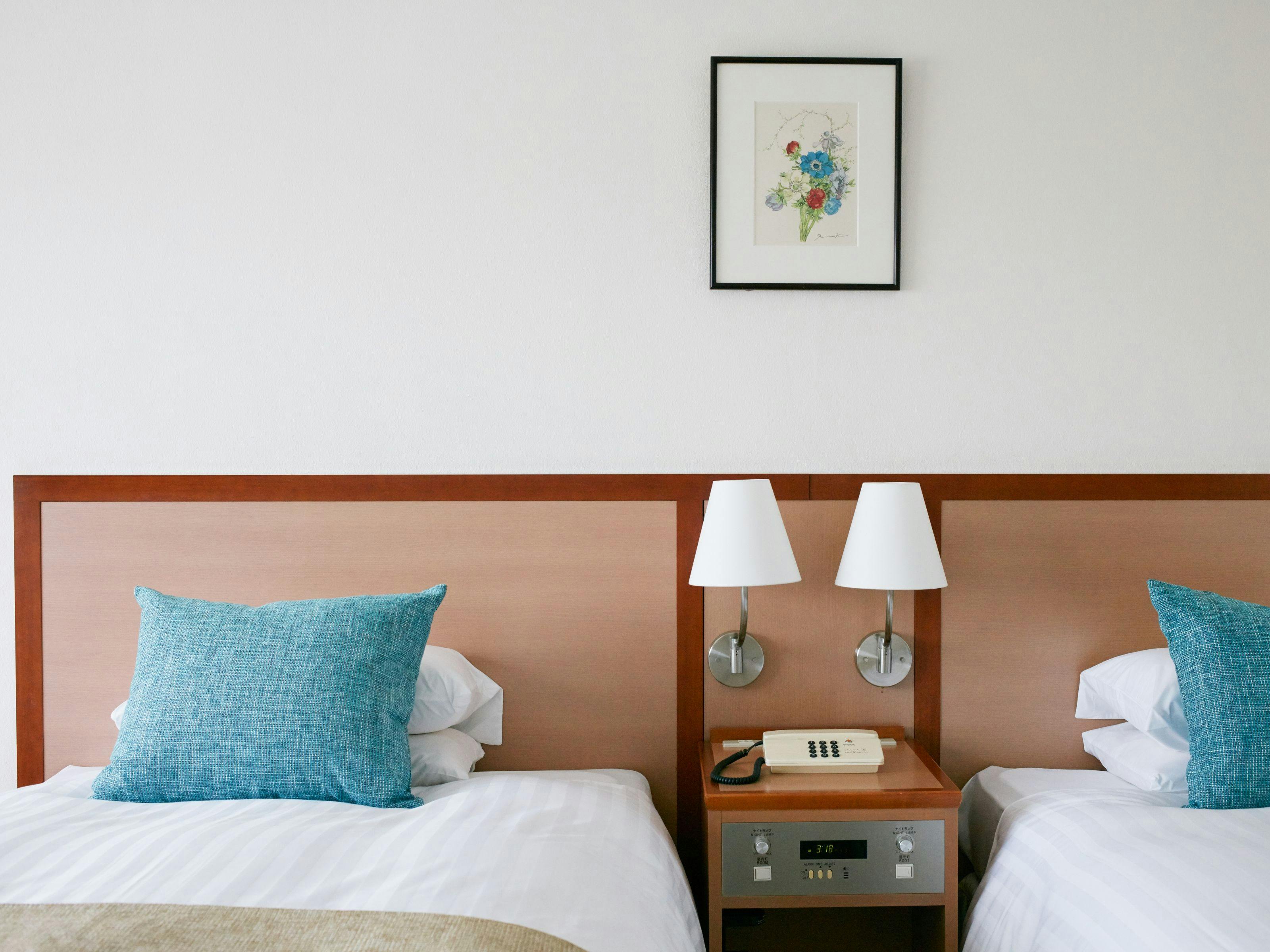 コンパクトに、そしてシンプルな装いのツインルーム。充実した設備で快適さと、寛ぎの空間をお約束致します。ベッド1台は壁に面しているので、小さなお子様の添寝にも適しています。※駐車場側ですので客室から海はご覧になれません。夜のイルミネーションをお楽しみください。※定員2名様となります。エキストラベッドの追加はできません。