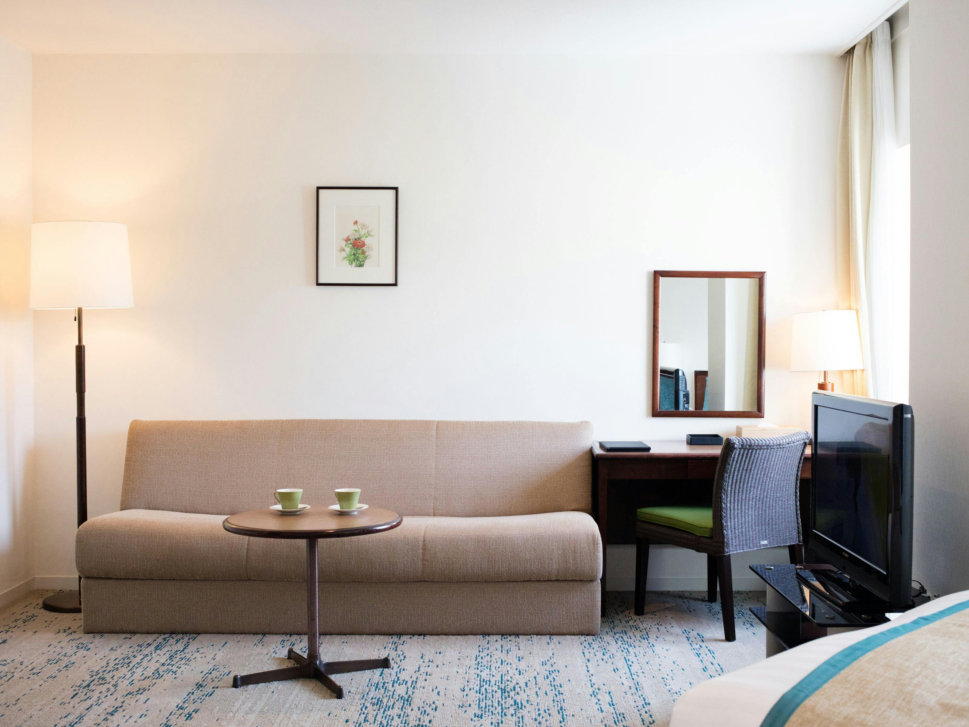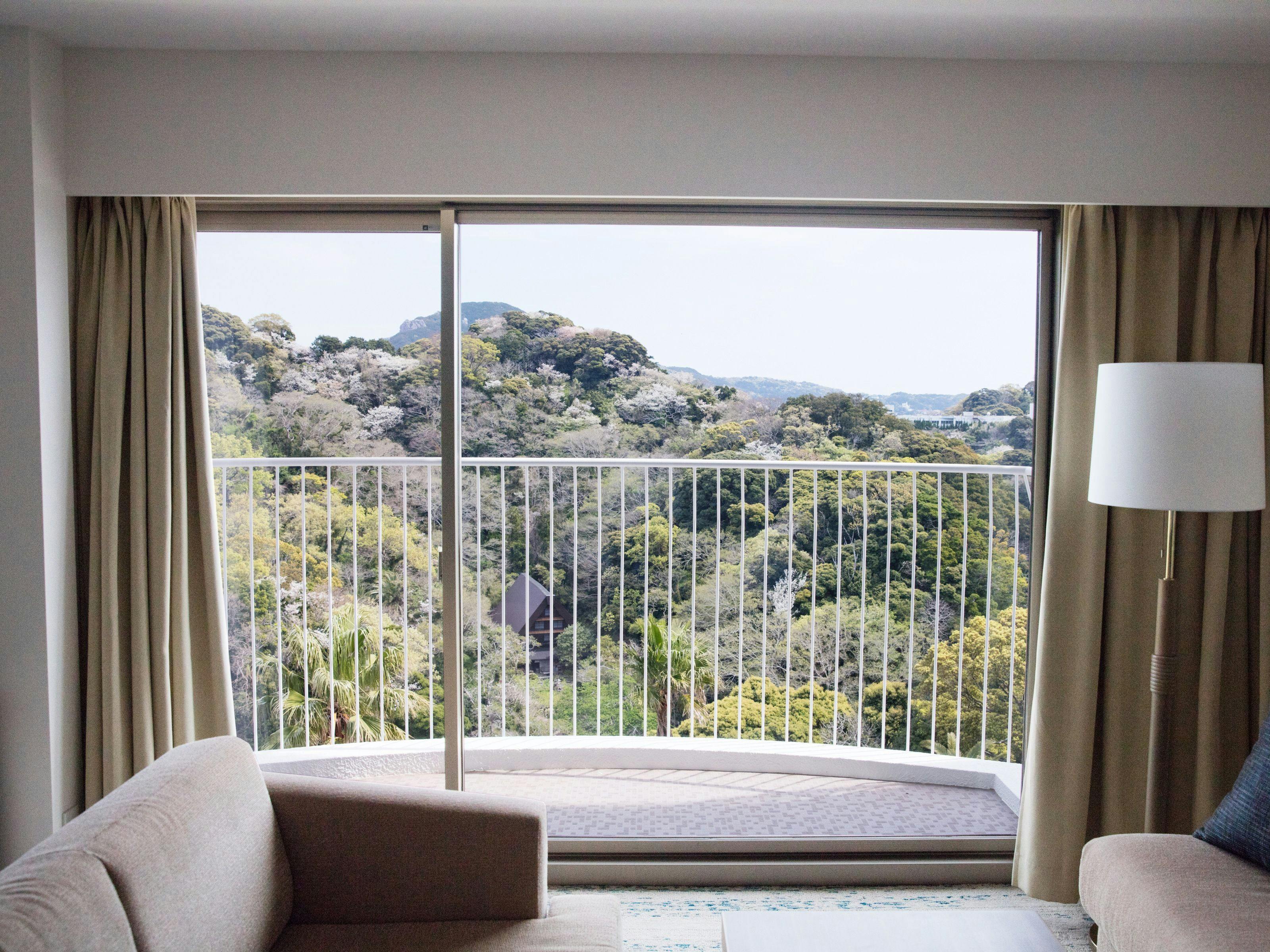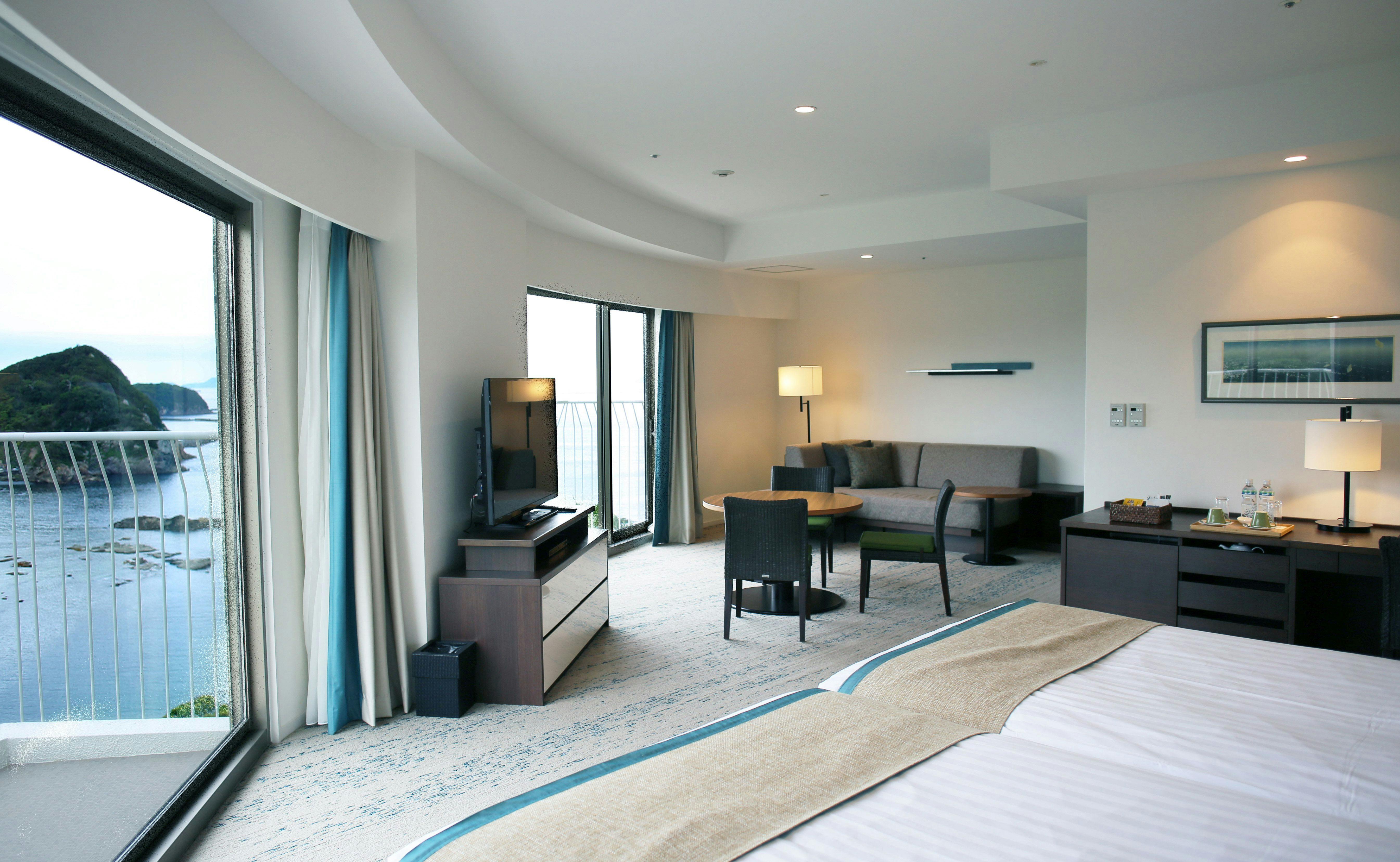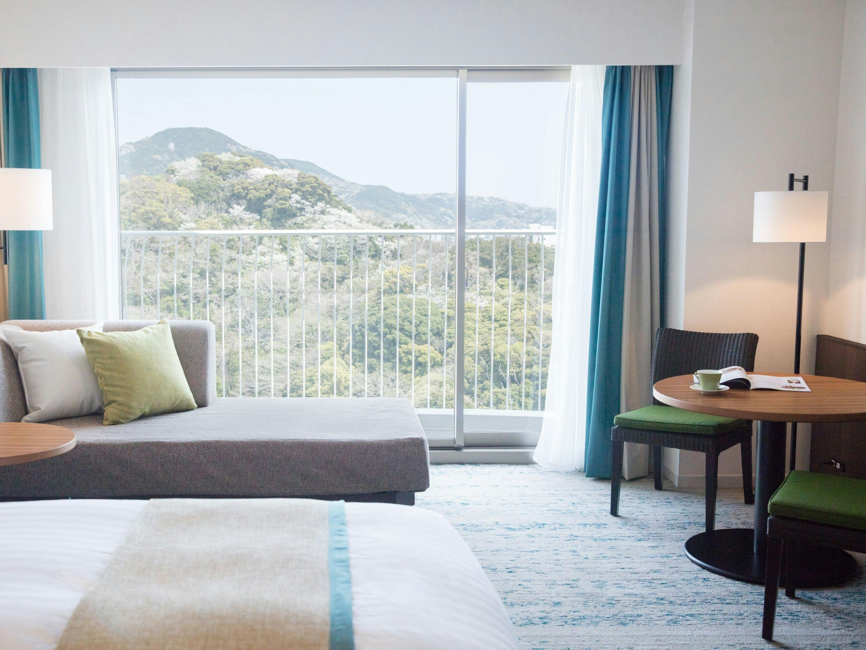 大きな窓からの外には海を望むバルコニー。心地よい潮風が素敵なリゾートステイに彩りを添えます。もちろんお部屋の中からも海をご覧いただけます。ツインベッドとリビングスペースがある贅沢な空間で、ゆったりと優雅な時間をお過ごしください。記念日など大切な日のご宿泊にお勧めです。