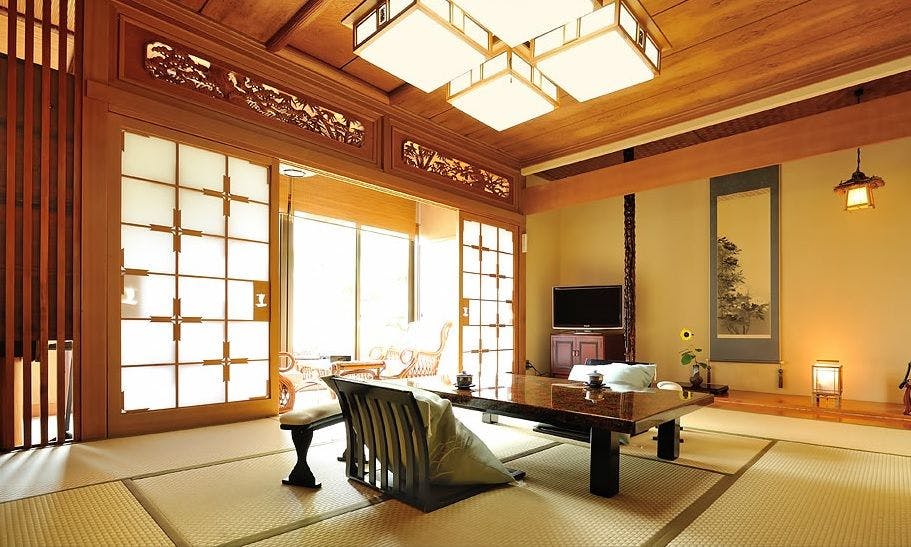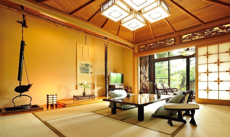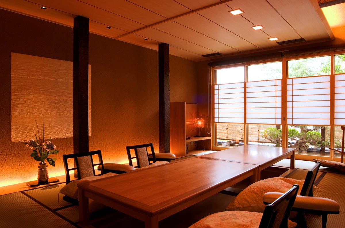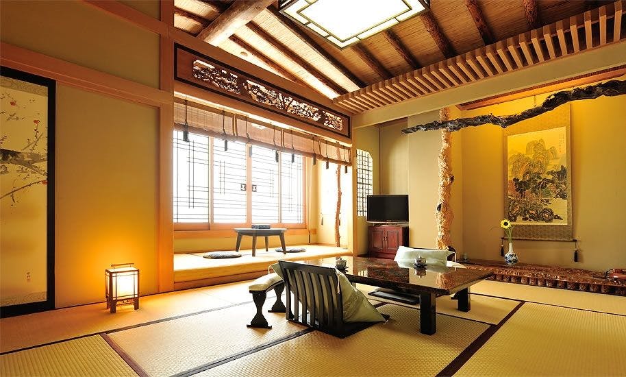 簡素な佇まいのモダン和風な12帖の和室です。内風呂はございませんが、やわらかな間接照明に雪見障子の外明り、広々とした和室空間を愉しめるお部屋です。※2023年7月1日より完全禁煙部屋となります。