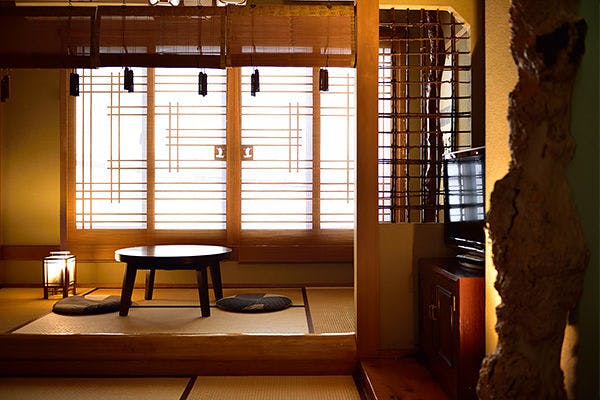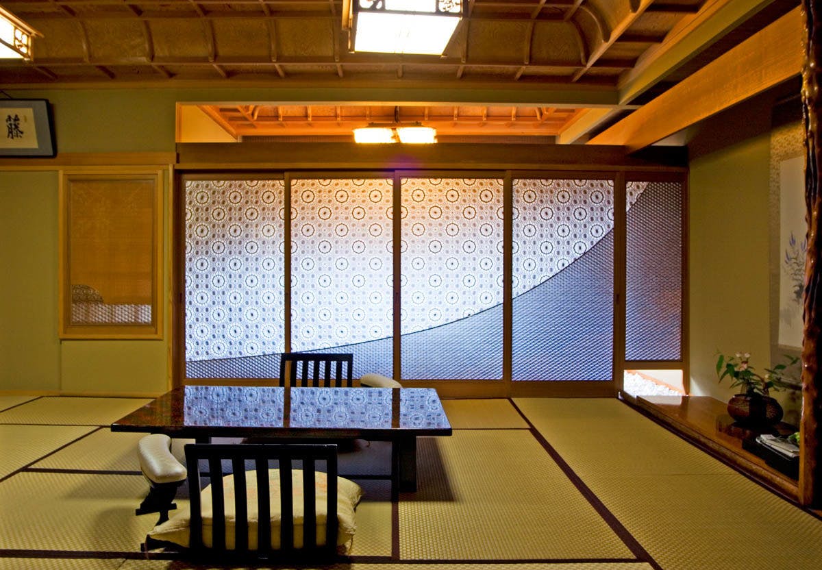 数奇屋風の13帖、波を模した美しい組小細工の建具が特徴の少し広めの和室です。お二人様やご家族、ご友人同士でゆったりとお寛ぎいただけます。冬はおこたつをご用意させていただきます。内風呂はタイル張りの沸かし湯となっております。※2023年7月1日より完全禁煙部屋となります。