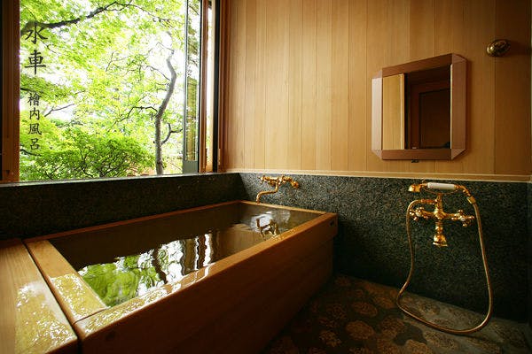 「桂の間」庭園と池に臨む檜造りの露天風呂