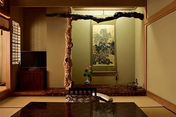 銘木を配し数寄を凝らした数奇屋和室10帖間のお部屋です。内風呂はございませんが、温泉通りに面し、温泉街山手の城山を望む静かなお部屋です。ゆったりとお寛ぎのお時間をお過ごしください。