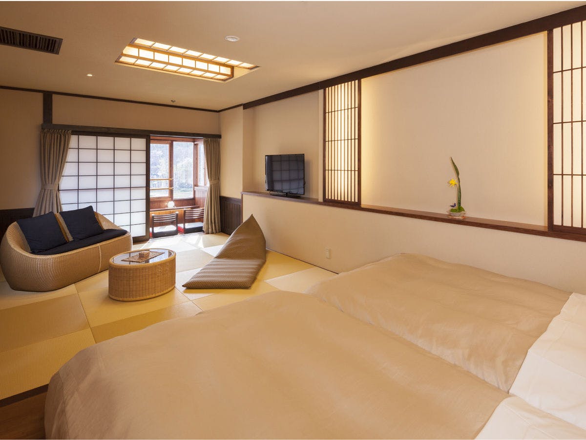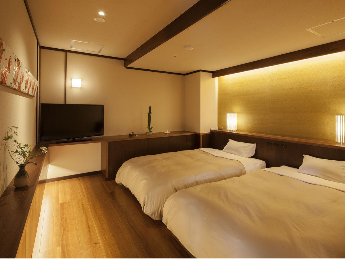 54平米/室内温泉付/洗浄機付トイレ/個別空調/ベッド幅120cm(2台)/マッサージチェア/ゆ瞑み無料/空気清浄機/冷蔵庫(水)/無料Wi-Fi/禁煙