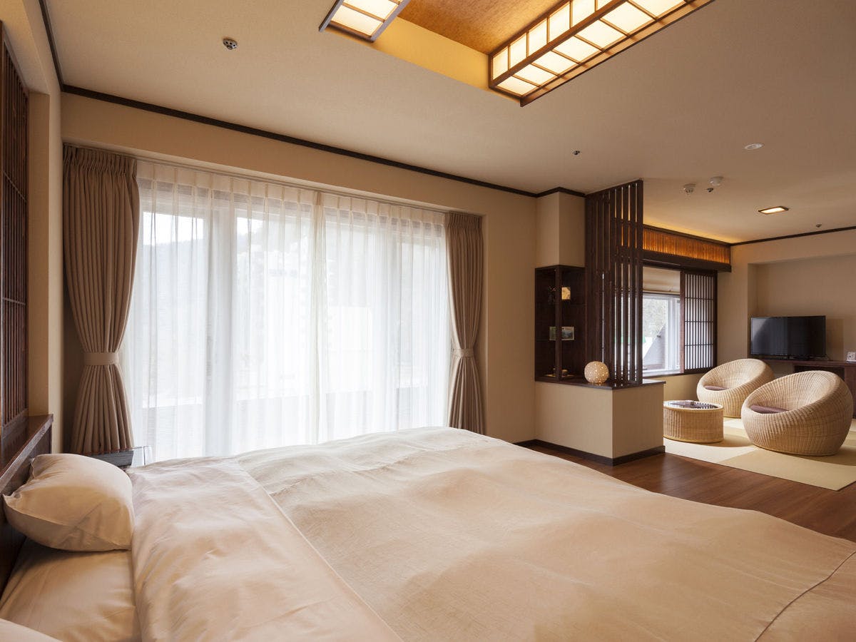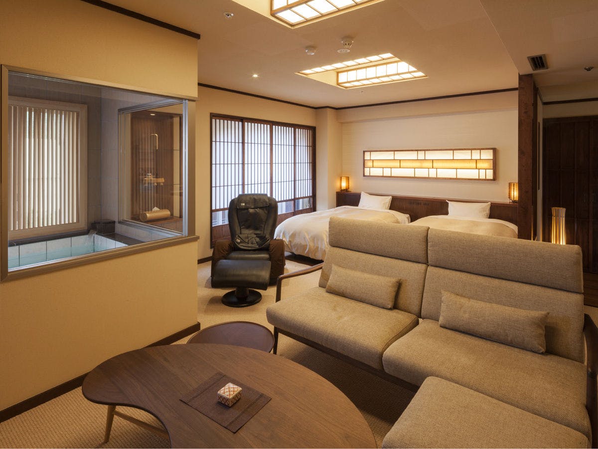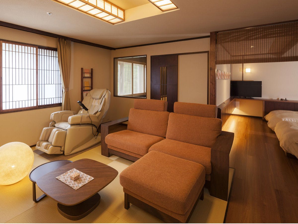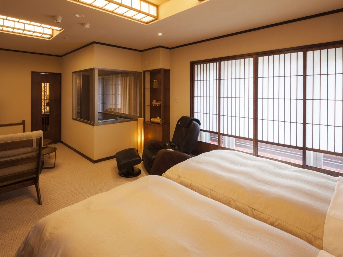 40平米/室内温泉付/洗浄機付トイレ/個別空調/ベッド幅120cm(2台)/マッサージチェア/ゆ瞑み無料/空気清浄機/冷蔵庫(水)/無料Wi-Fi/禁煙