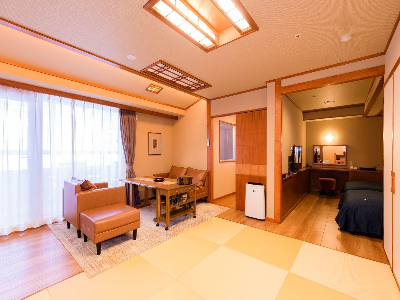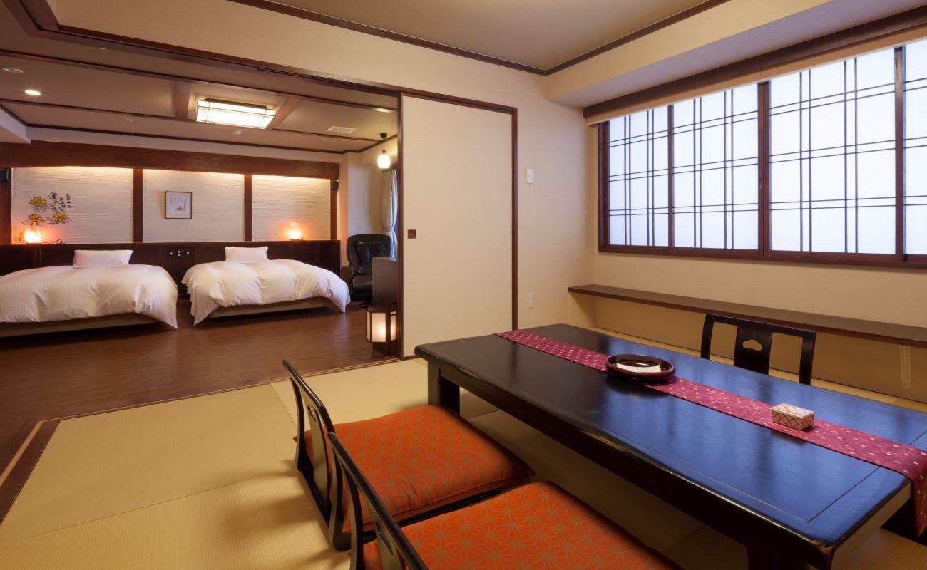 広々とした10畳の和室とツインのベッドルームを備える和洋折衷のお部屋。