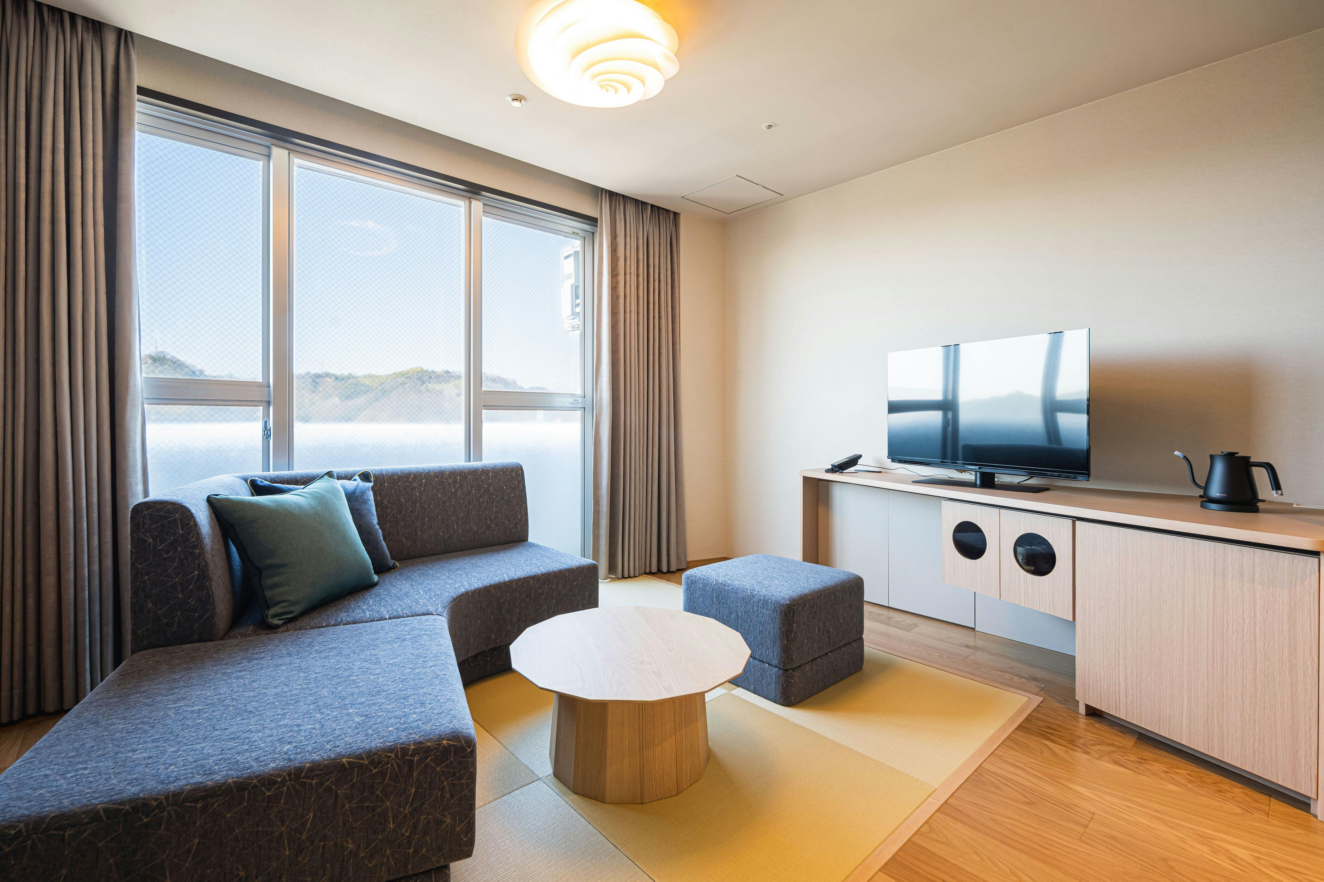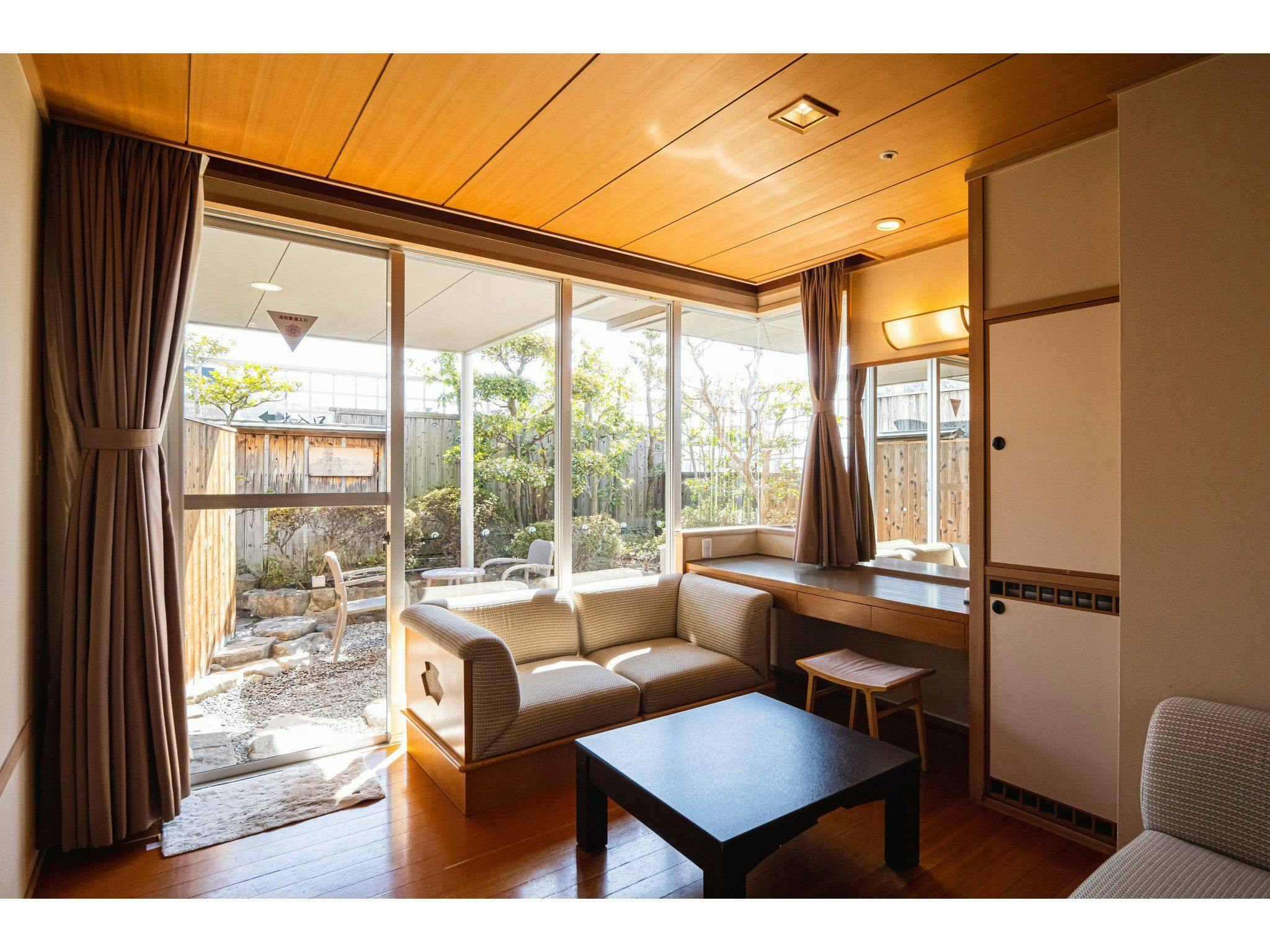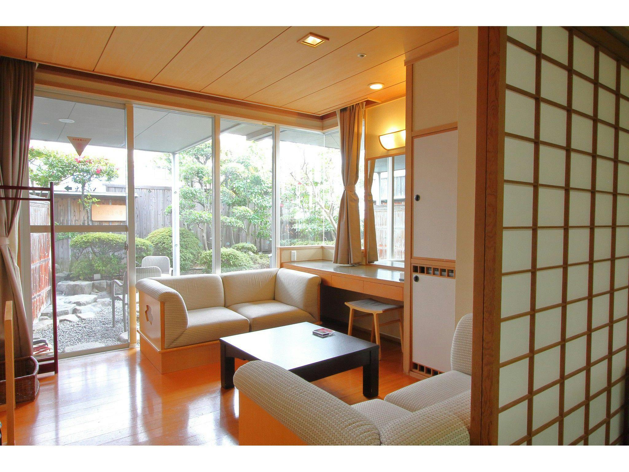 お部屋には和室の他にソファーのラウンジをご用意。またお部屋の外には庭園と