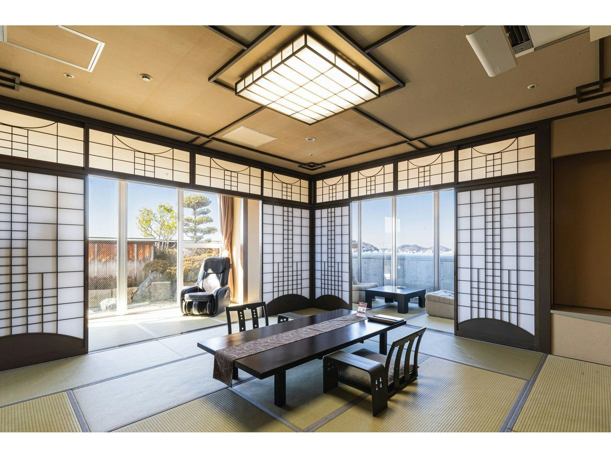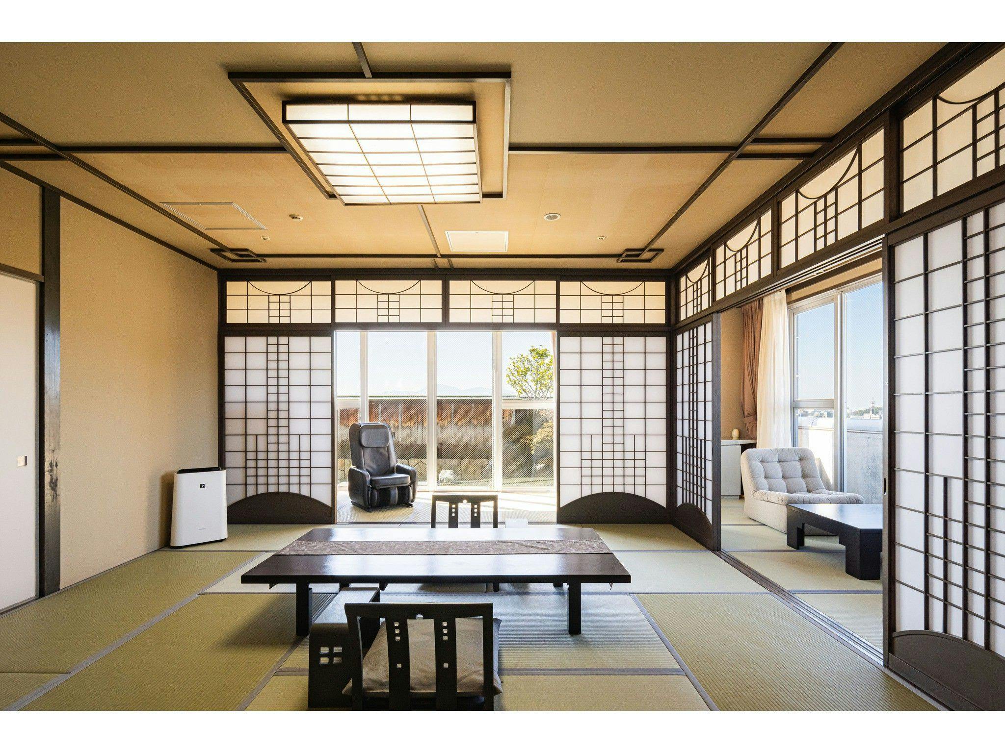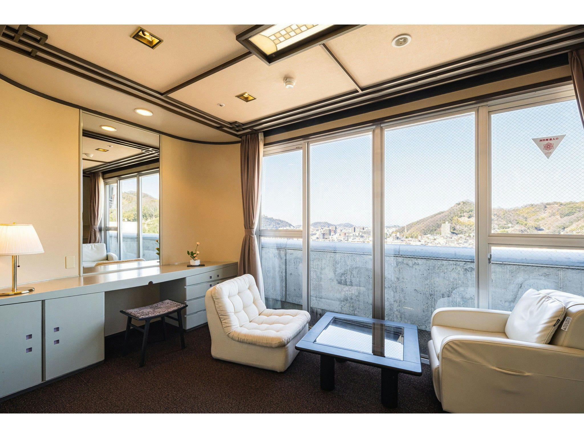 最上階特別フロアに巨匠・黒川紀章のオリジナルデザインを散りばめた和モダンルームがリニューアルオープン。道後の高台に位置する建物の最上階から望む松山城や松山市街の夜景は圧巻です。