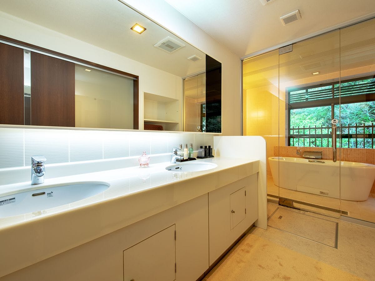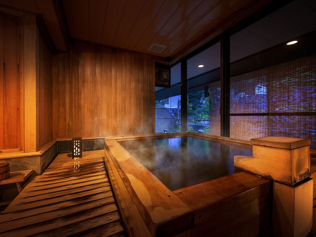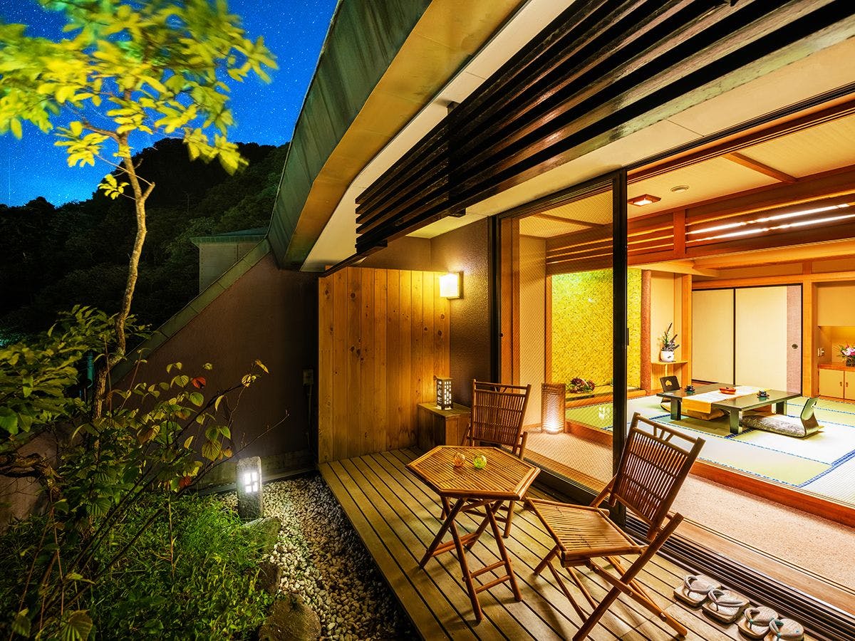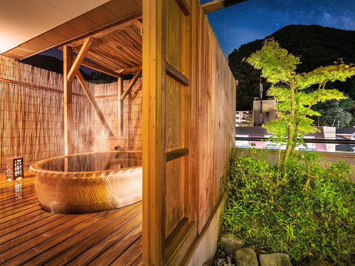自家源泉かけ流しの展望風呂が付いた客室。