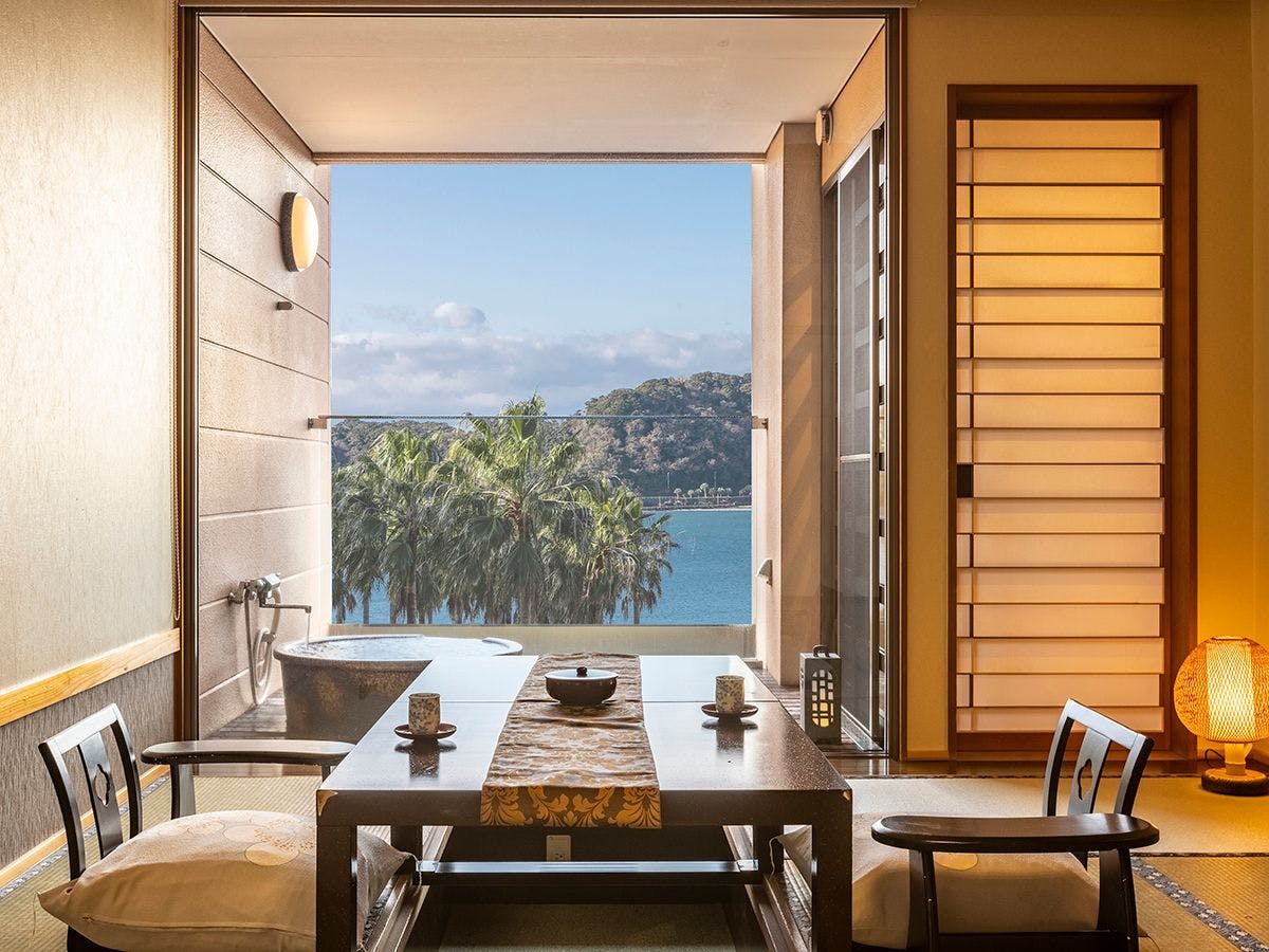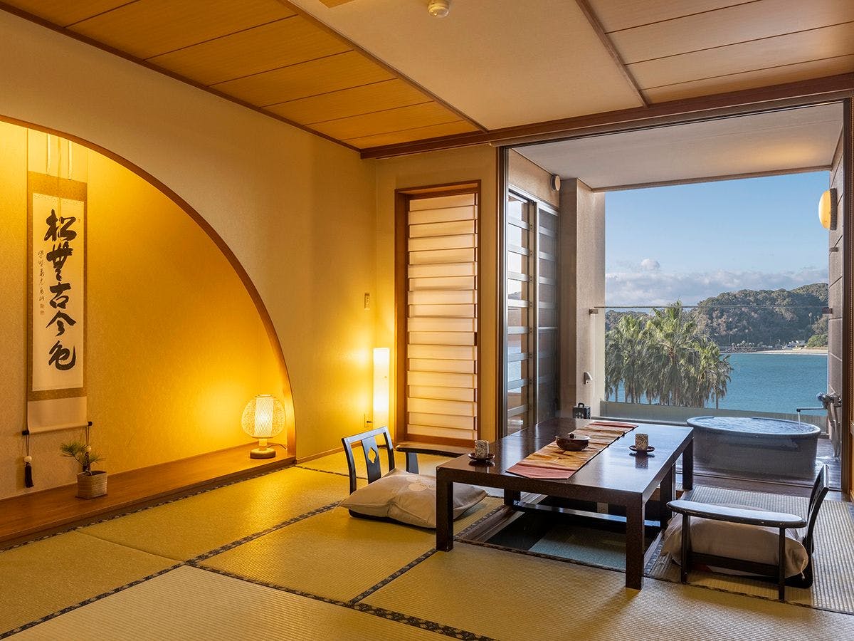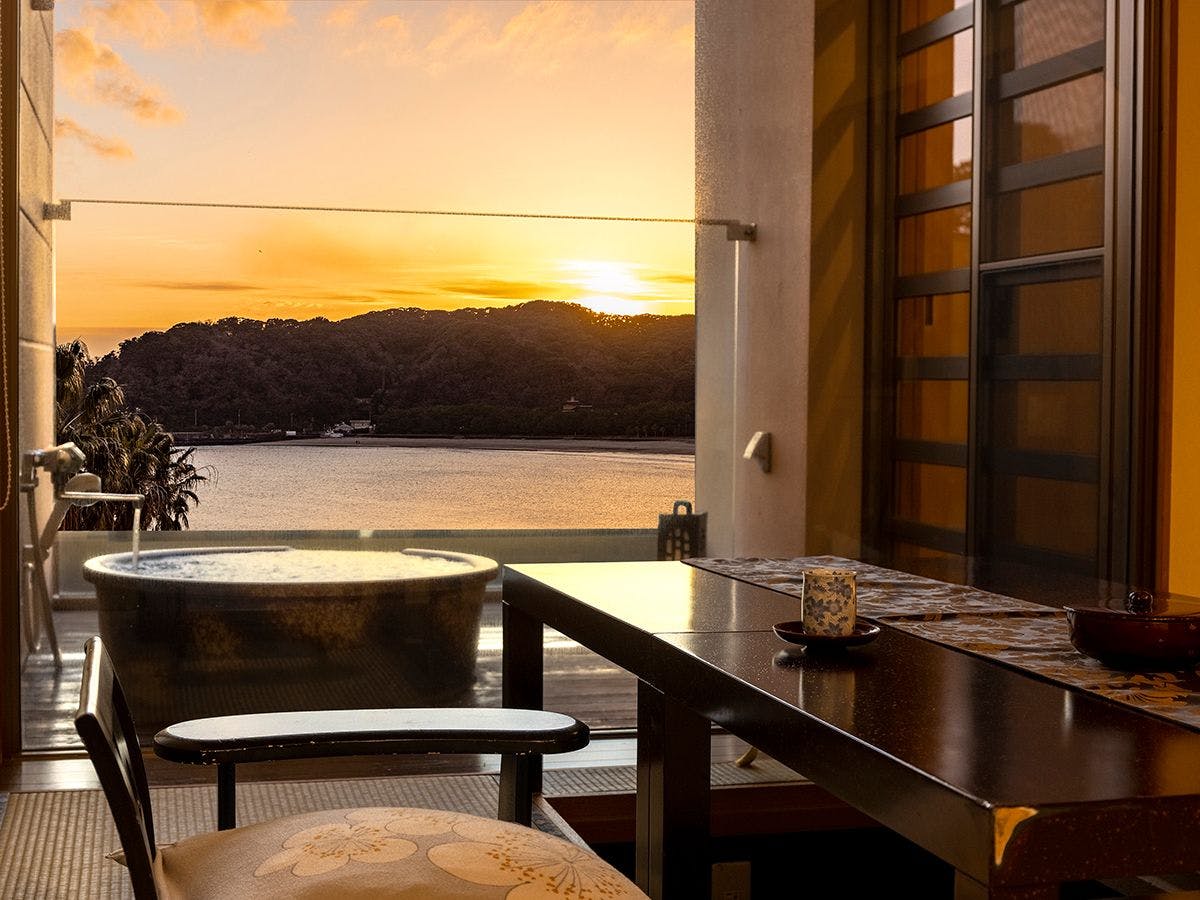 【日本の渚100選・快水浴場100選】である弓ヶ浜まで徒歩2分。すべてのお部屋には露天風呂が付いており、弓ヶ浜の絶景を望むことができます。