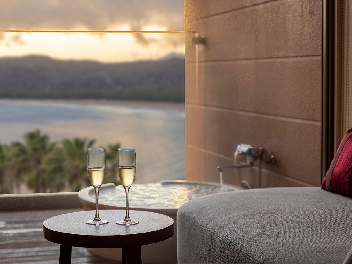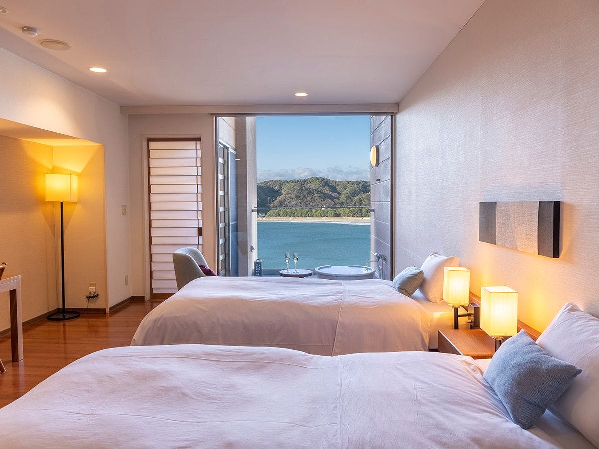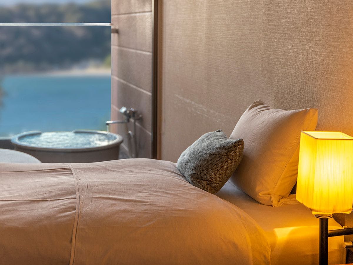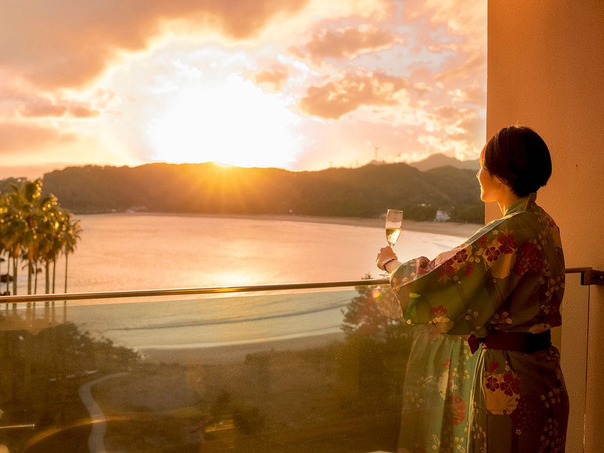 【日本の渚100選・快水浴場100選】である弓ヶ浜まで徒歩2分。すべてのお部屋には露天風呂が付いており、弓ヶ浜の絶景を望むことができます。