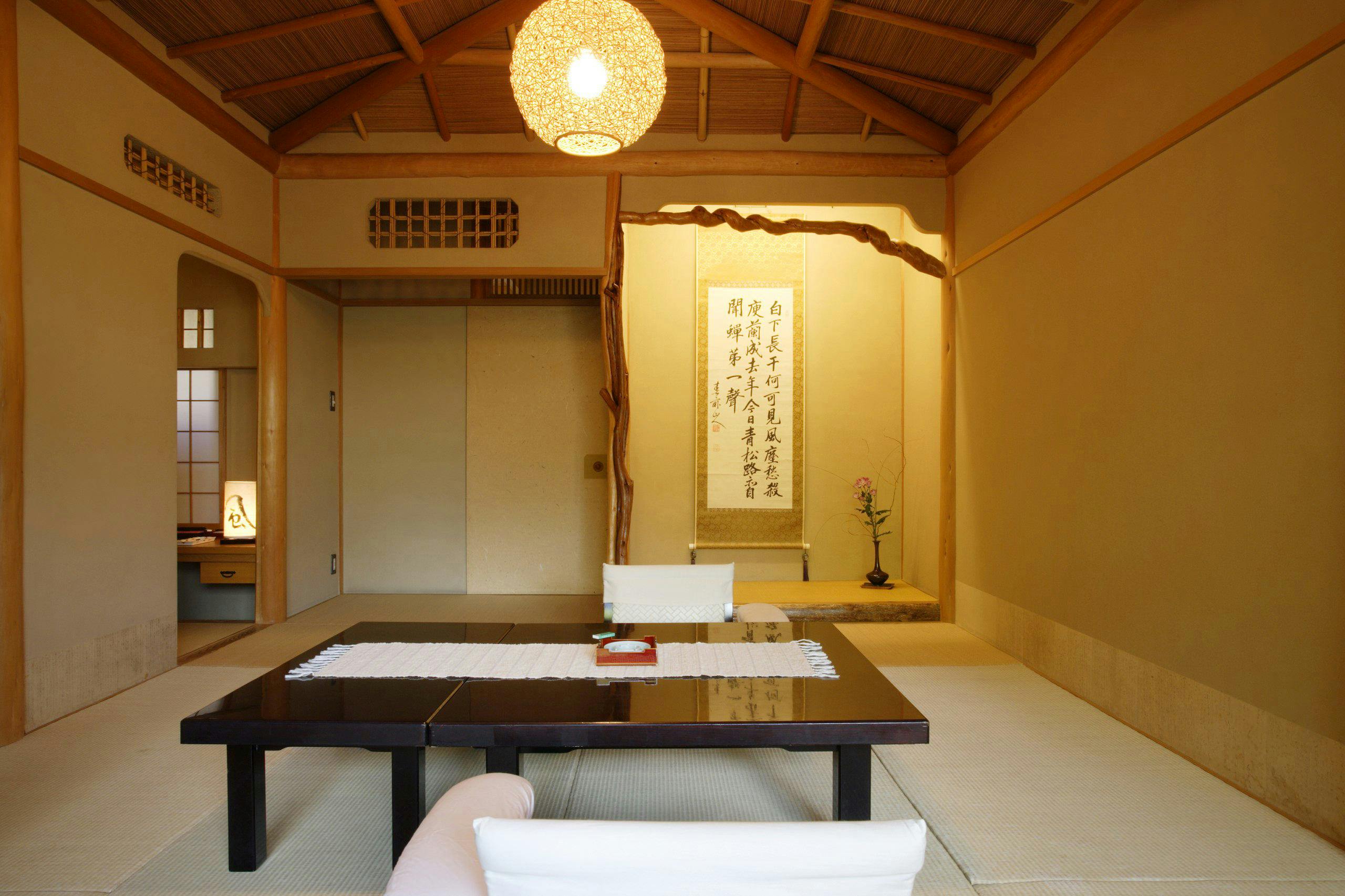 漆・・・柱、壁、天井、床の間、さらに洗面台等の調度に至るまで漆塗りで仕上げられている。