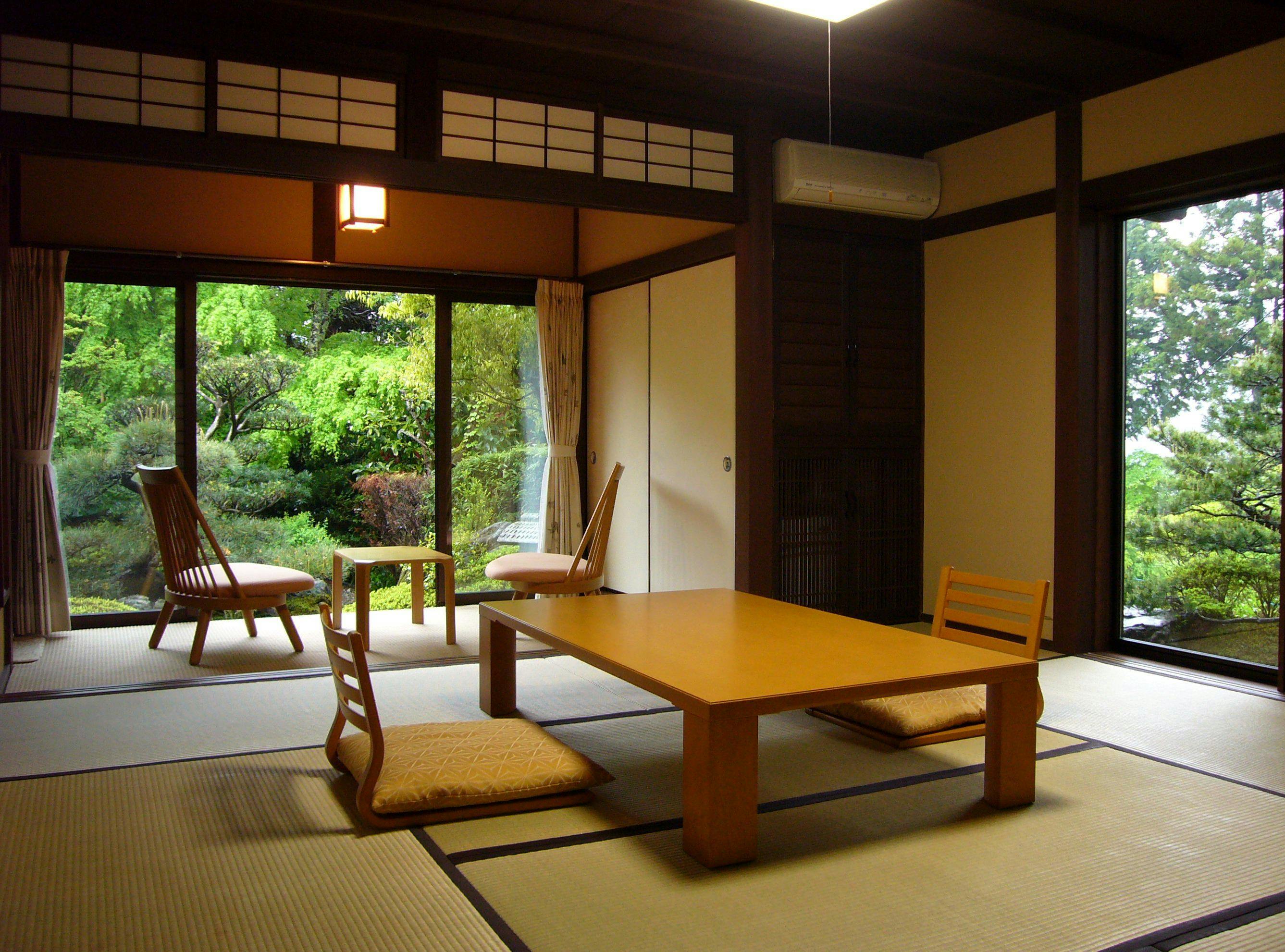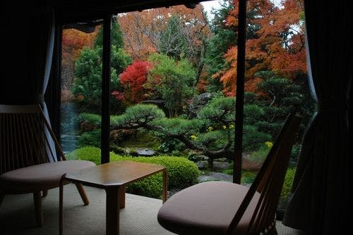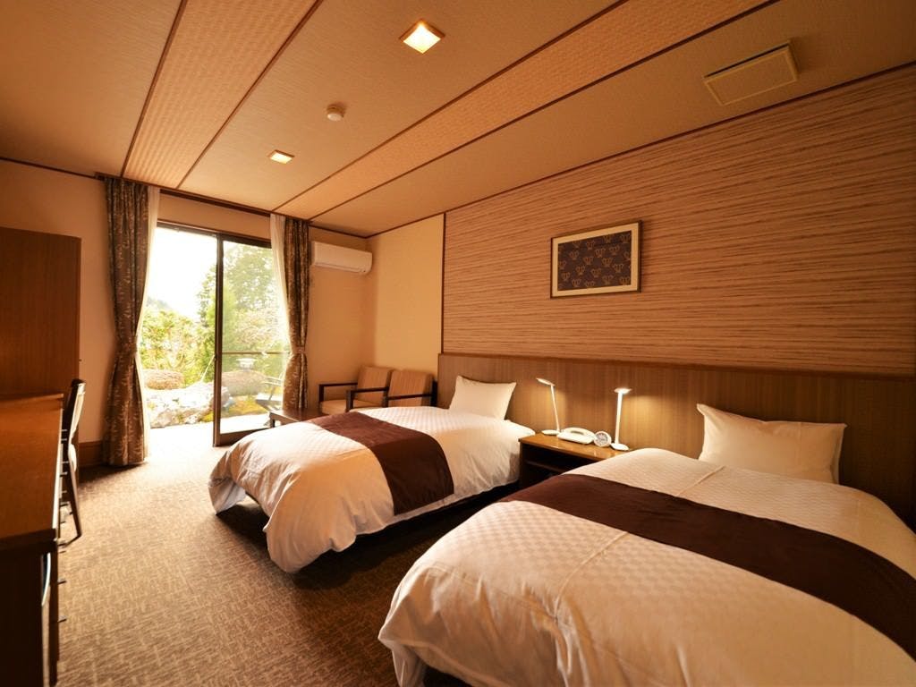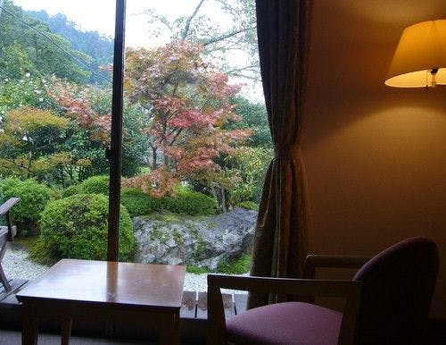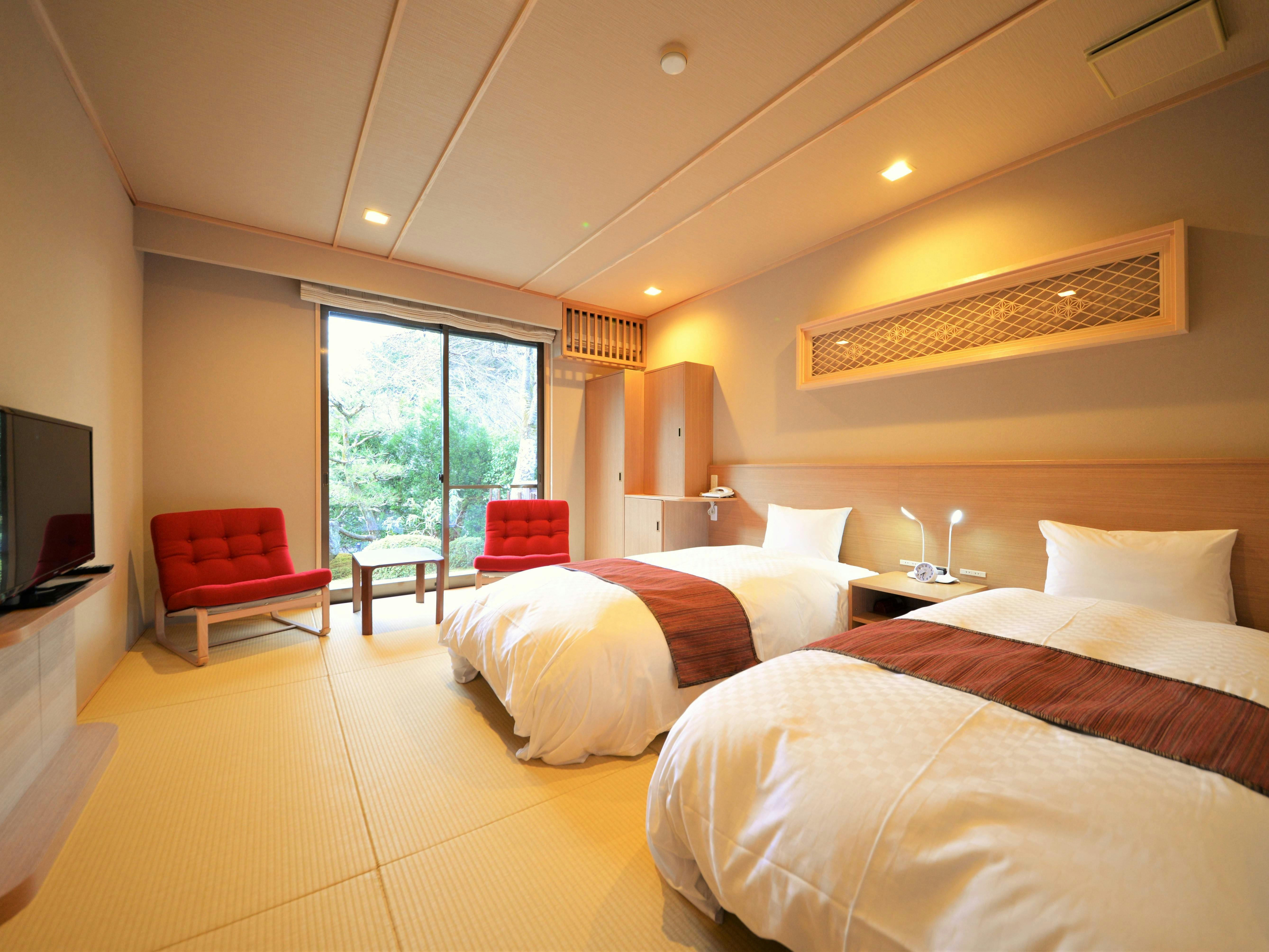 美しい日本庭園を望む洋室。春には梅、桜そして秋には紅葉がお楽しみいただけます。禁煙となっておりますが、窓の外では喫煙可となっております。