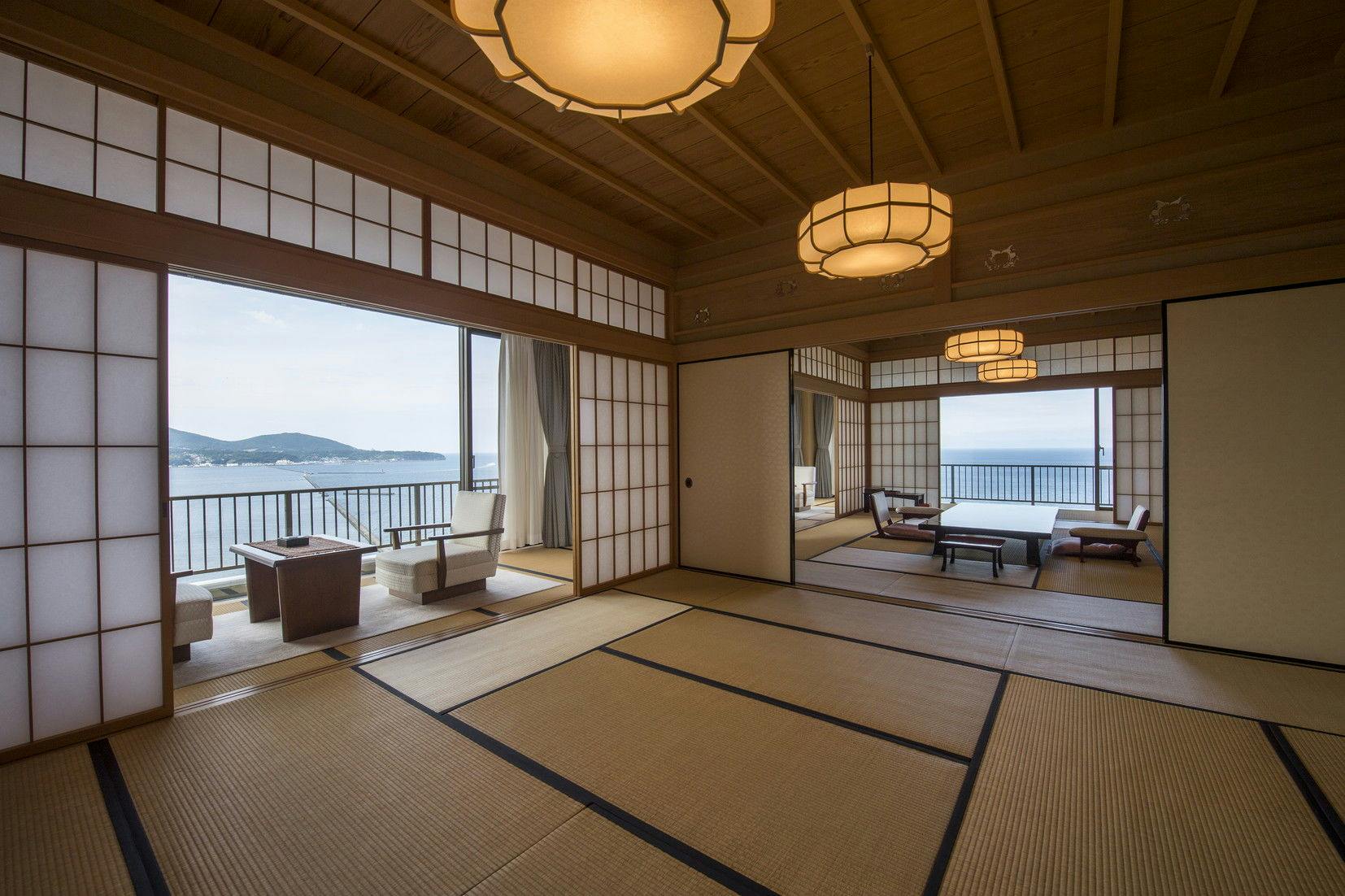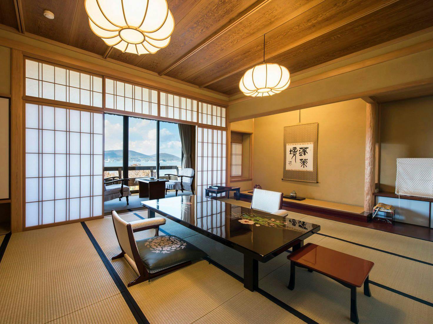 清々しい香りに包まれる純和風に仕上げた16畳の日本間。石狩湾の浜に沿って往来する函館本線の列車、山裾の市街地に広がる夜景が上質な時間を豊かにつむぎます。明るい自然光に包まれる温泉部屋風呂もしつらえて、世塵から解放されるひとときをおもてなしいたします。身も心もゆだねていただける、凛とした和のくつろぎです。※ 客室までに階段がございます。