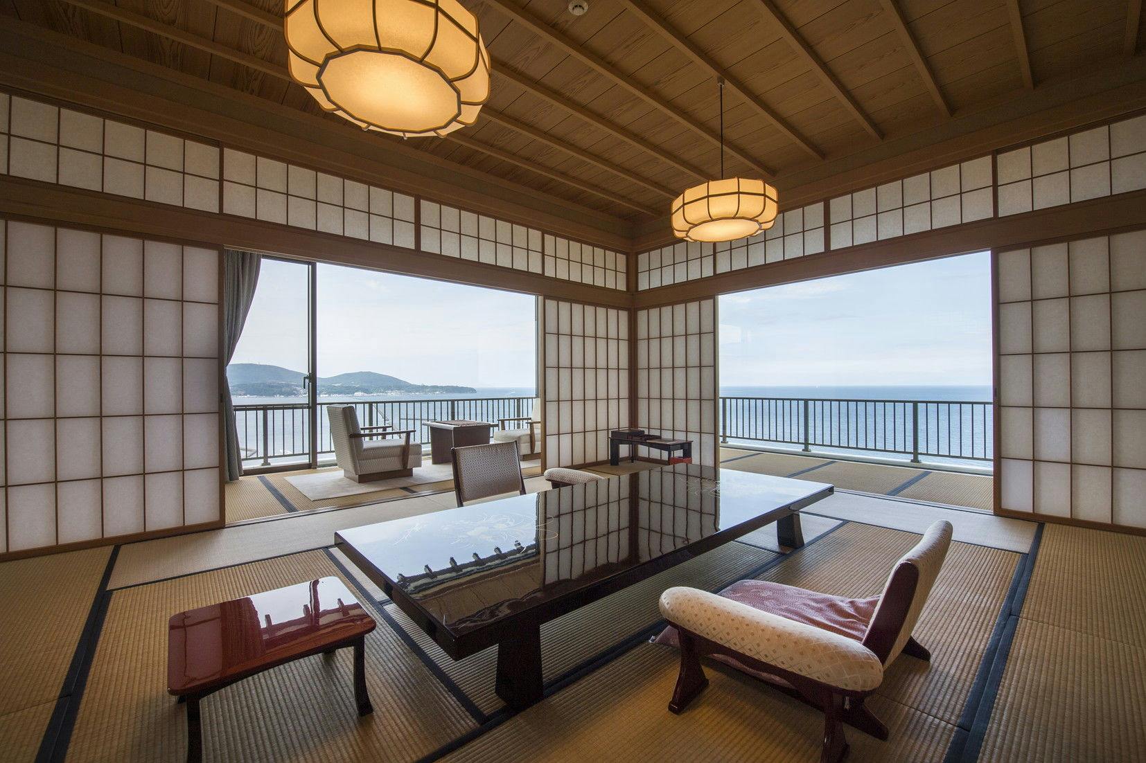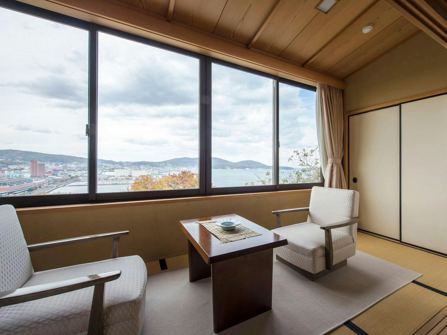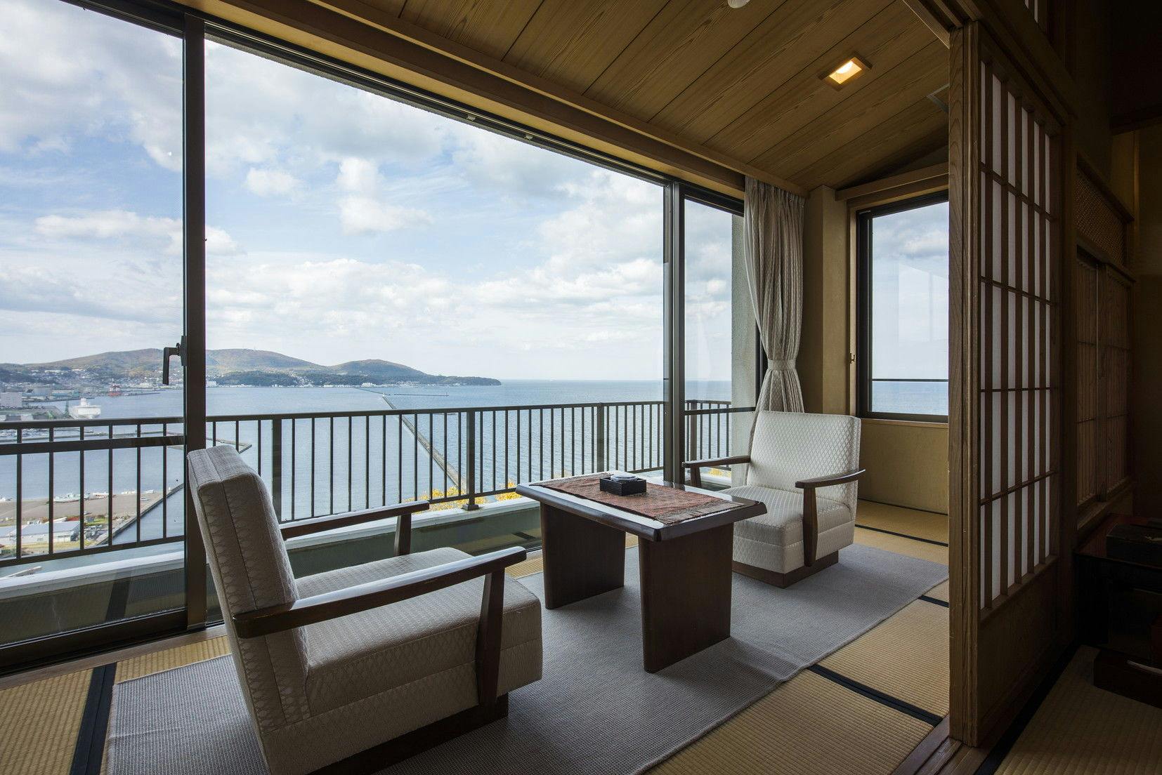新館の最上階ワンフロアを独占する「鶴の間」。二間続きの和室とツインベッドの洋室をしつらえた特等室です。眼下には日本海をはじめ、情緒豊かな小樽の港や街の表情、四季の美しさを映す山々が見渡せます。ゆとりの広さに、旅の疲れを忘れる温泉部屋風呂をご用意。湯けむりとともに小樽ならではの美しい眺望を心ゆくまでお愉しみいただけます。※ 調度品の保全の観点からお子様の予約がある場合調度品を下げさせていただきます。