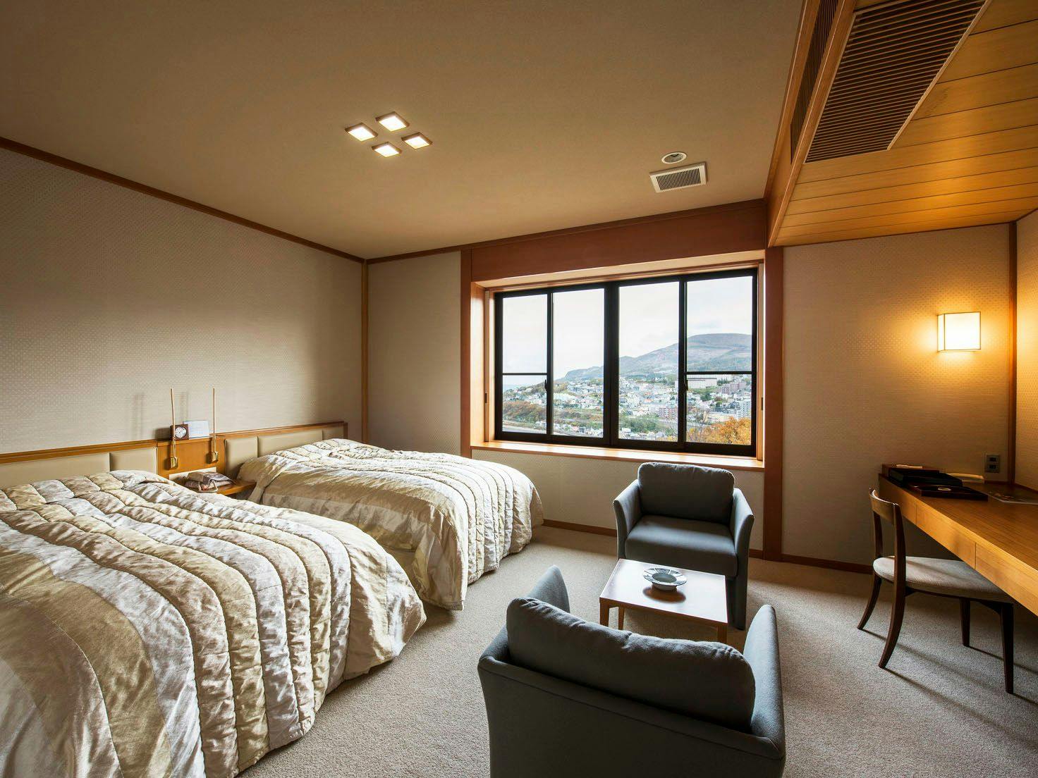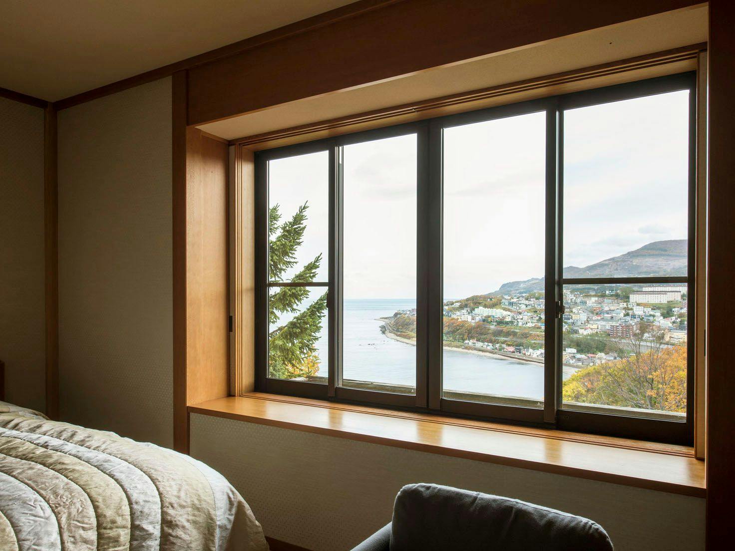 窓辺からは、緩く弧を描く伸びやかな石狩湾の海岸線。夜には、幻想的なあかりが浮かびあがります。旅の疲れを優しく包むセミダブルサイズのツインベッド。和室では寝起きが困難な方に、ゆったりとおくつろぎいただけるように洋室をご用意いたしました。銀鱗荘自慢の味わいと絶景の湯けむりを心ゆくまでお愉しみくださいませ。※ 浴室のない客室となります。