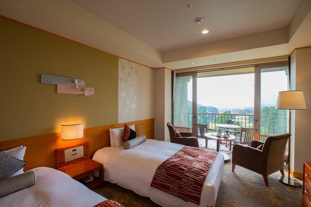 コンフォートツインルーム(30m2+バルコニー6.9m2)お部屋のバルコニーからは、雄大な浅間山を一望できます。ホテル最上階にあり、コーヒーミルやアメニティも充実しており、お客さまが心から楽しみ、リラックスのできるお部屋となっております。