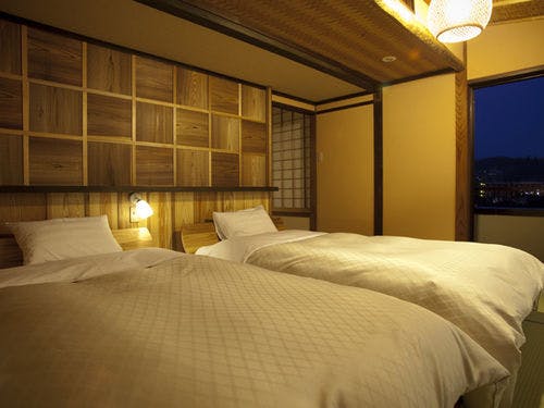 8畳のお部屋は、ツインベットが入ったメインベットルーム。 ベットはシモンズと飛騨の匠とのマリアージュ。