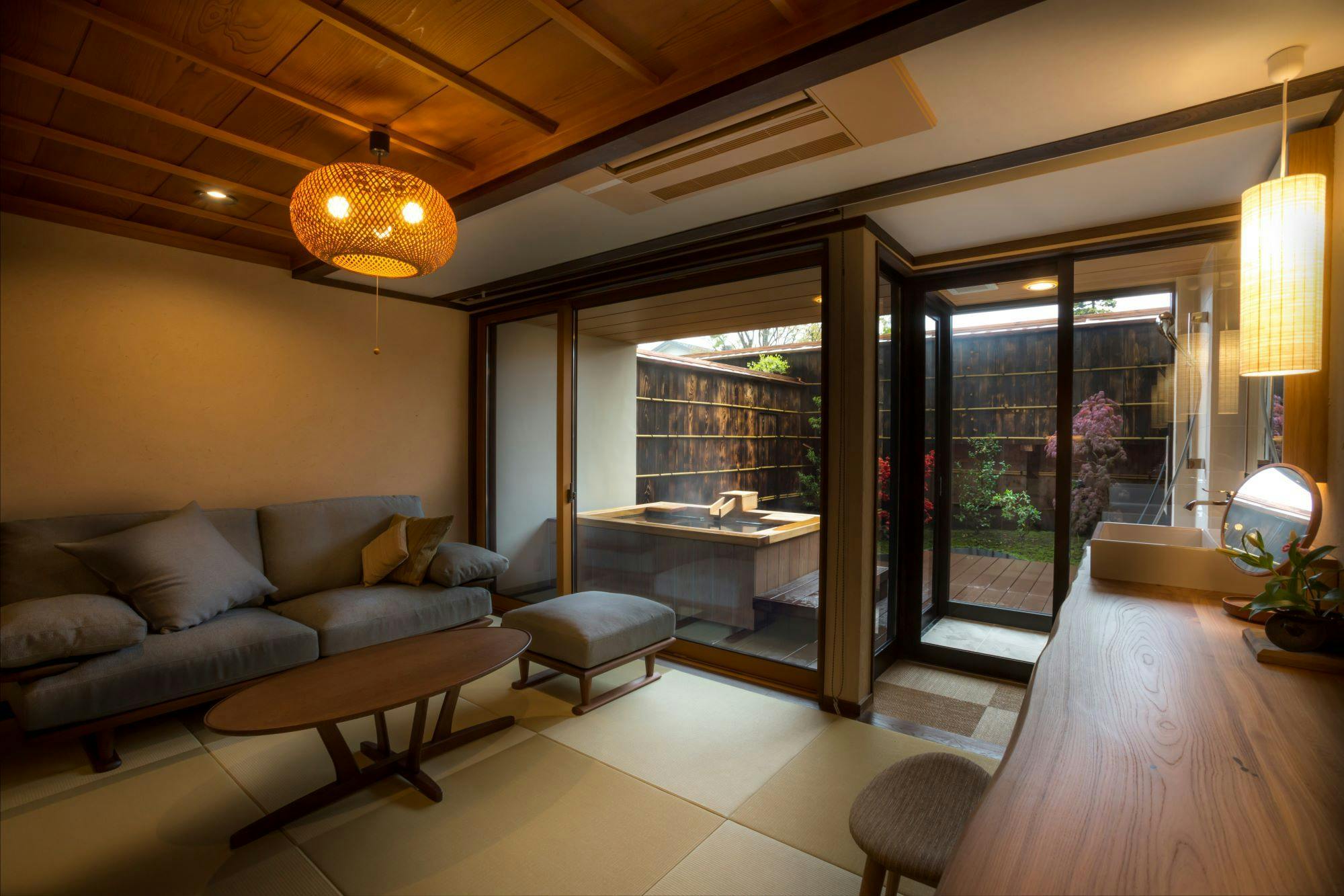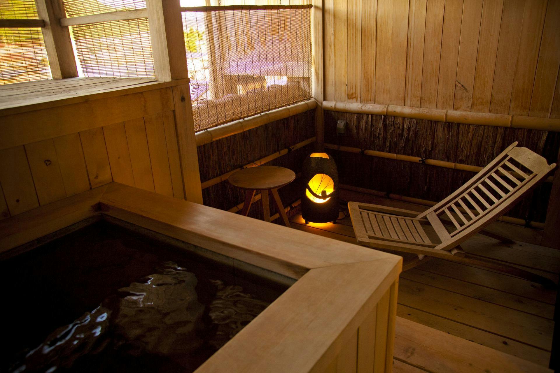 専用のお庭と露天風呂をお愉しみいただけるお部屋です。自然光が差し込む開放的な空間で、季節ごとにその表情を変える庭を眺めながら、自家源泉の温泉をご堪能ください。
