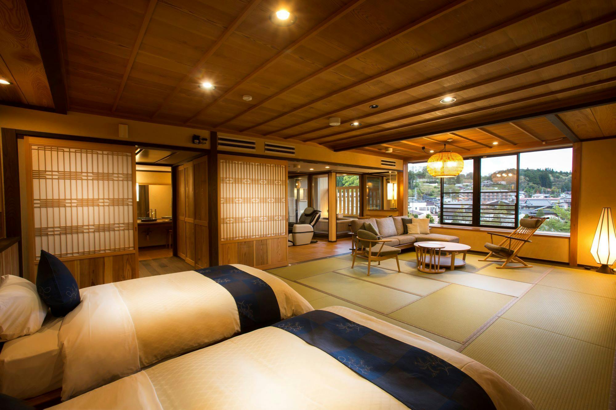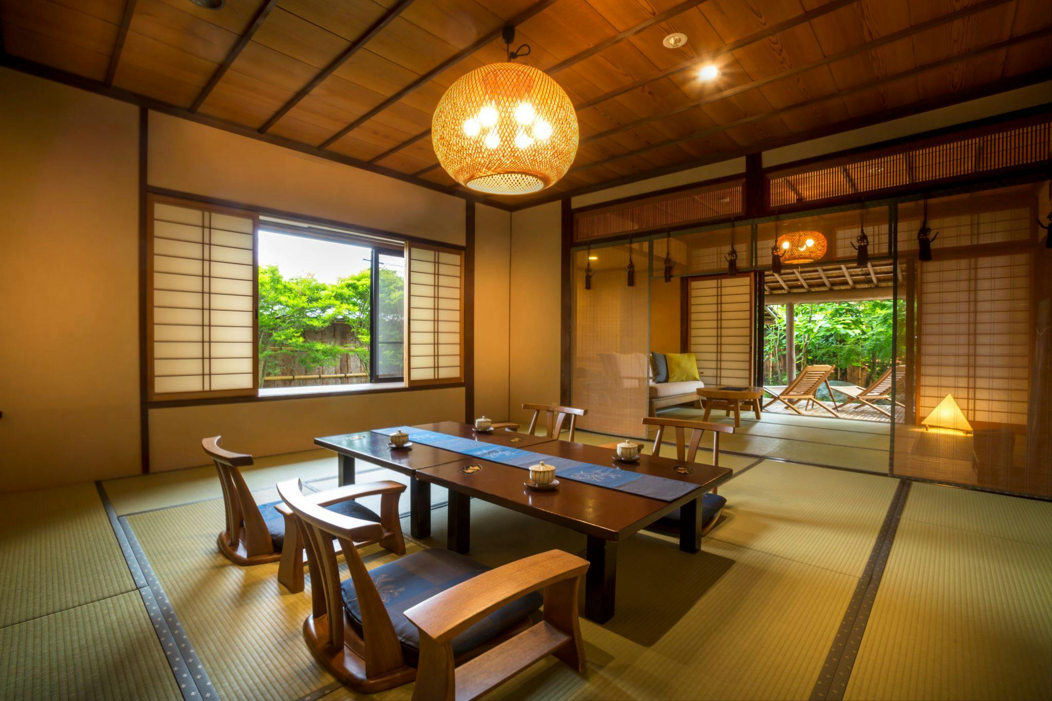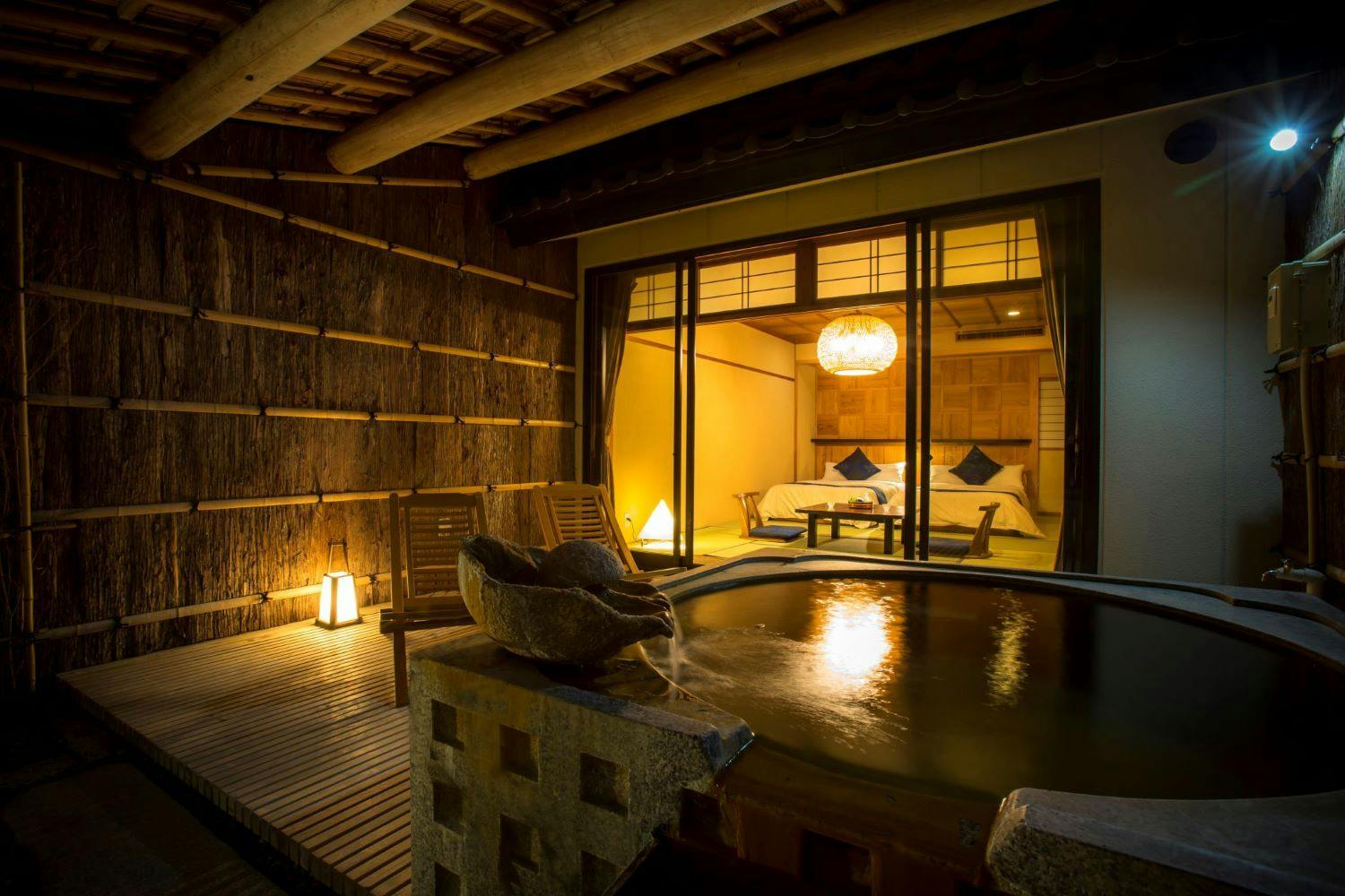 12.5+7.5+8畳の三間続きの和室に、お庭のテラスに専用露天風呂が付いたお部屋です。