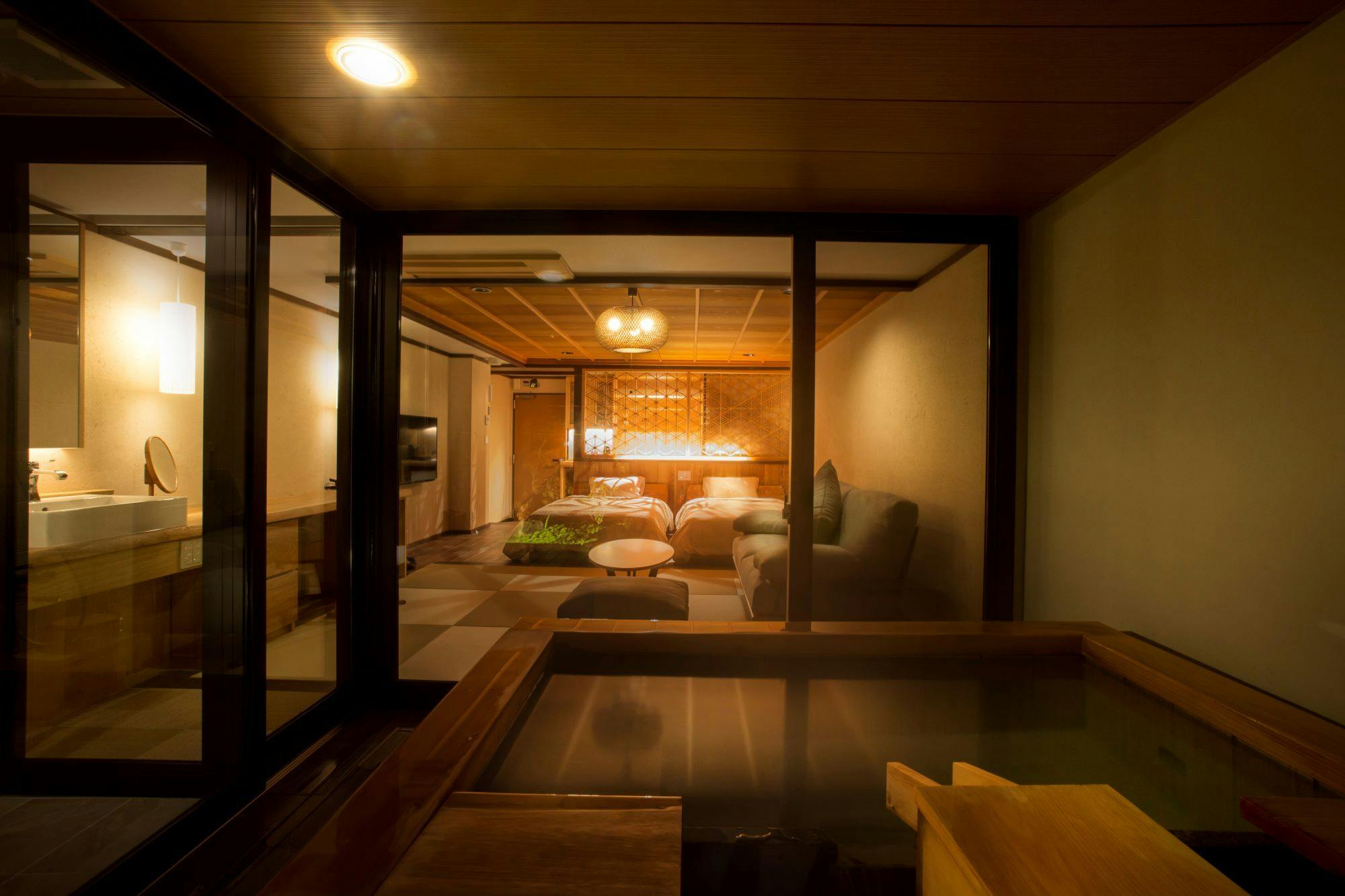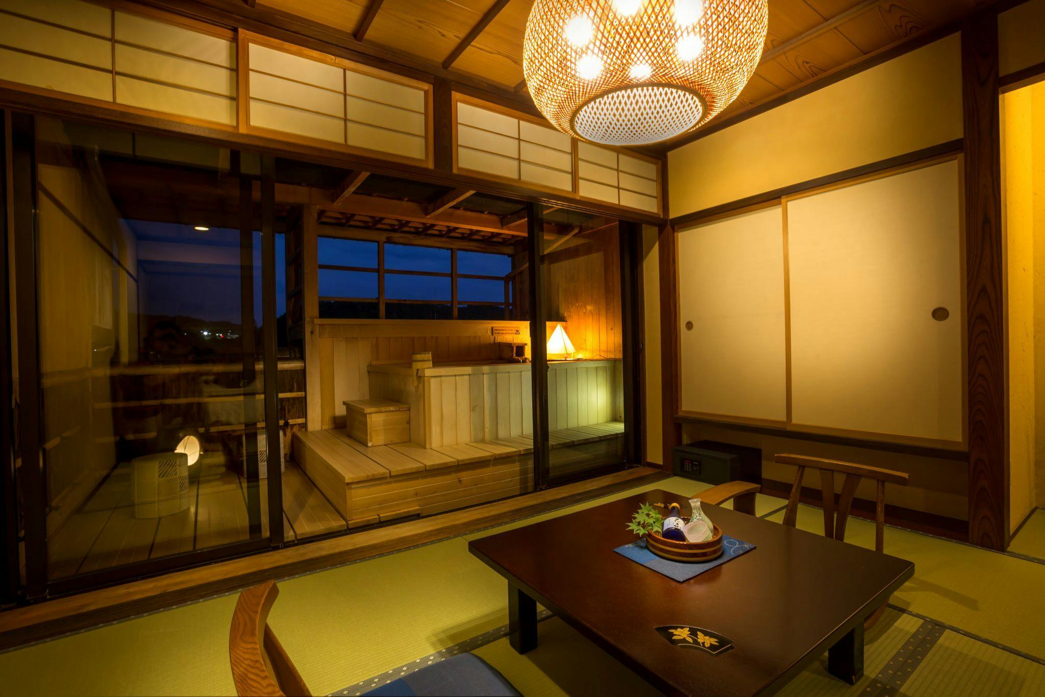 大浴場もいいけれど、自分だけの露天風呂で、グラスをかたむけて涼みながら楽しむことができる時間は、露天風呂付き客室ならでは。
