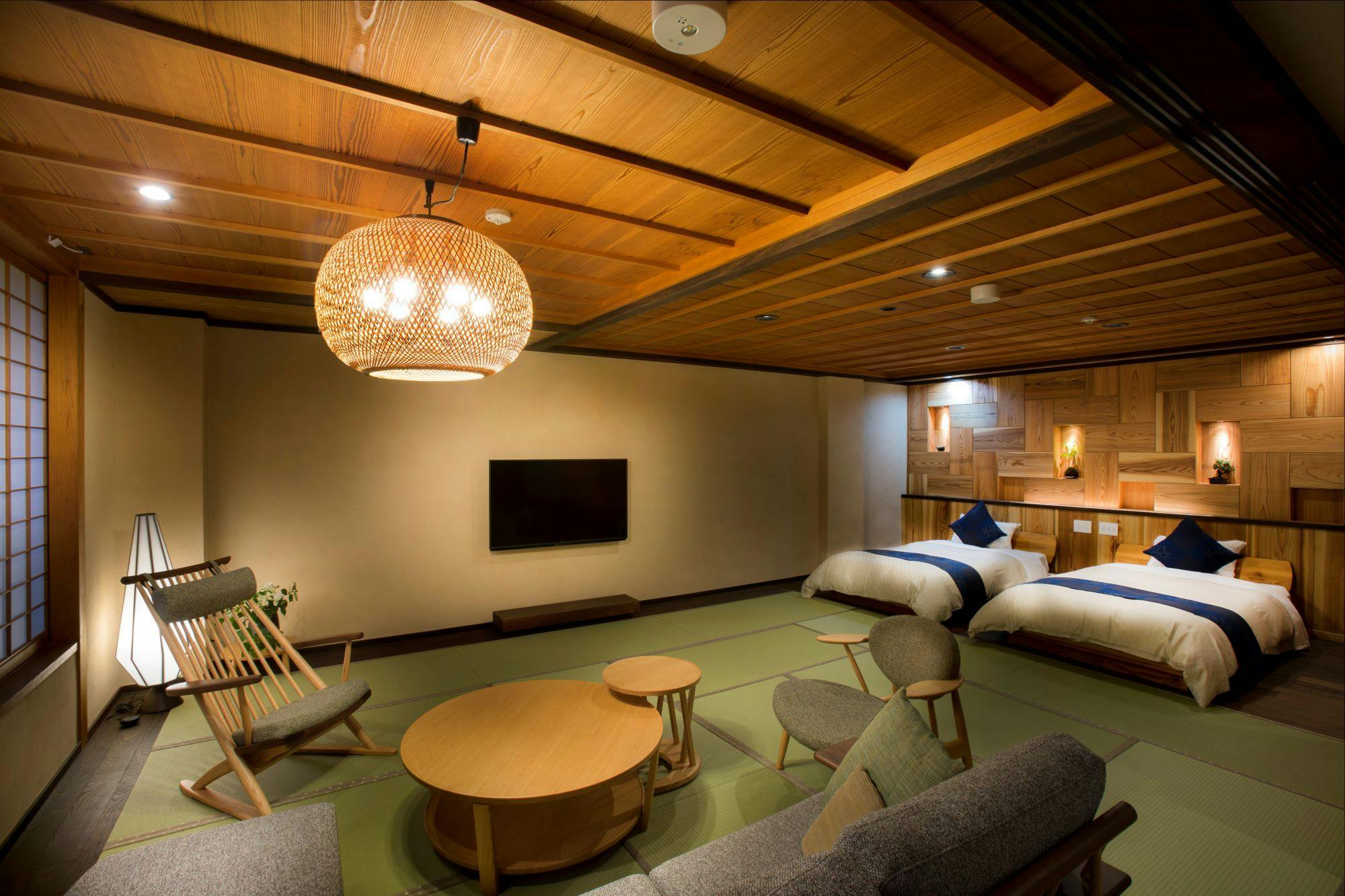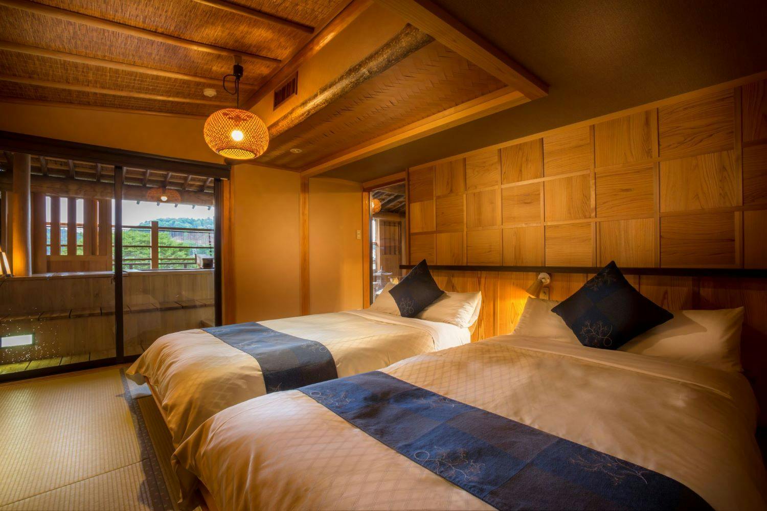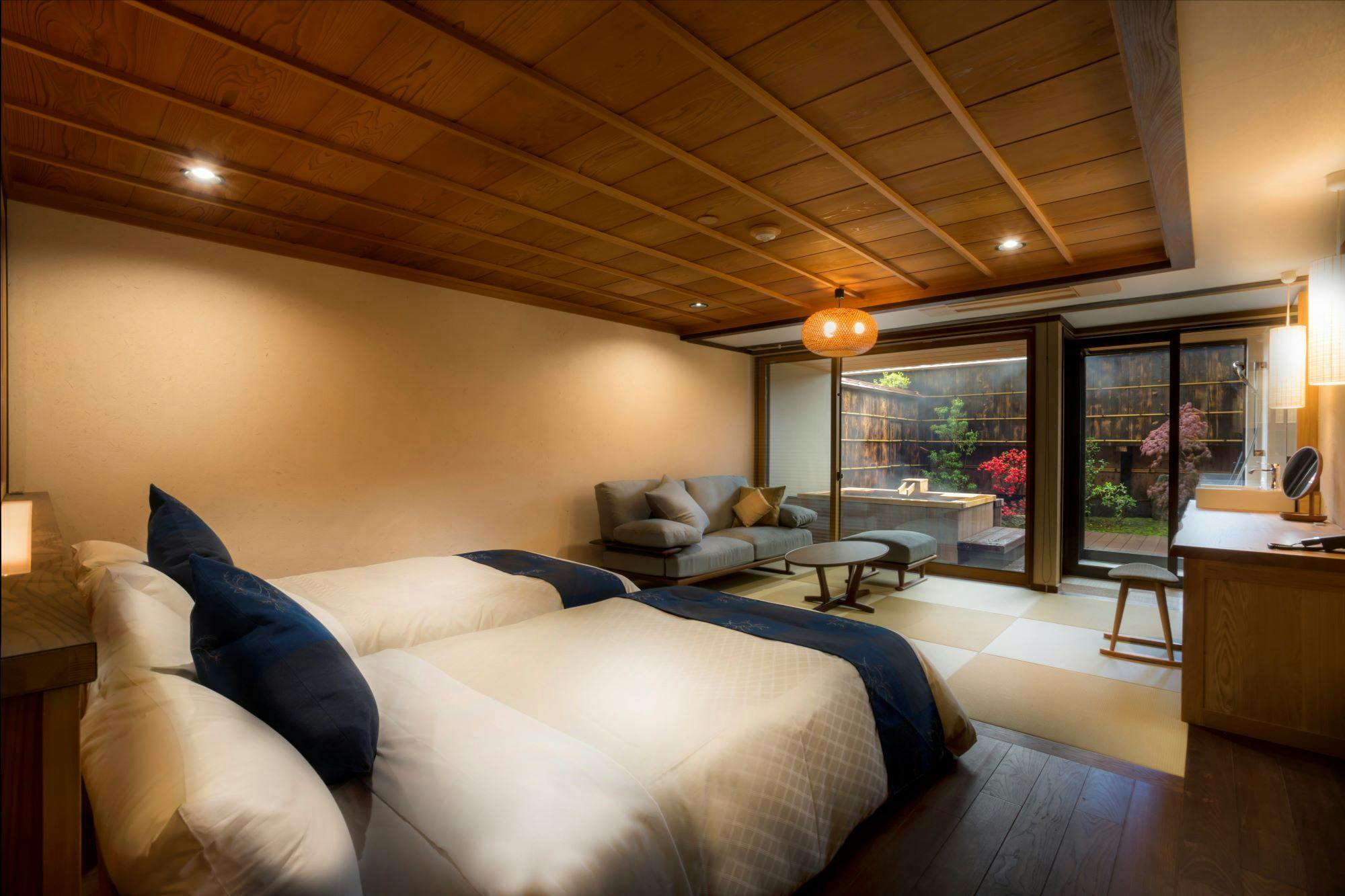 やわらかな温もりのベットに寝転んで眺めるられるお庭と和の空間をお楽しみください。