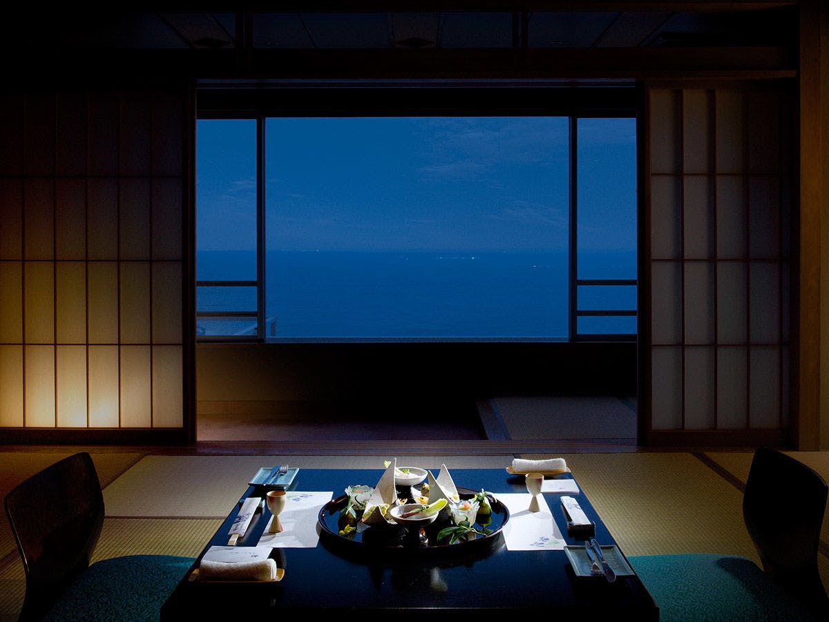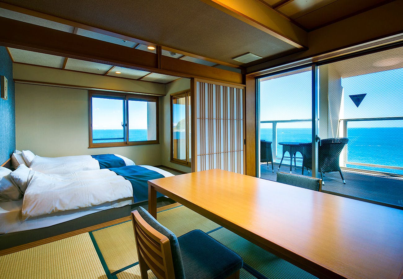 お部屋の入り口からでも海が一望できる和室12.5帖+広縁の仕切りの無い開放的なお部屋。晴れた日には伊豆大島の街並みまで見え、夜には漁船の灯りがほのかに望めます。