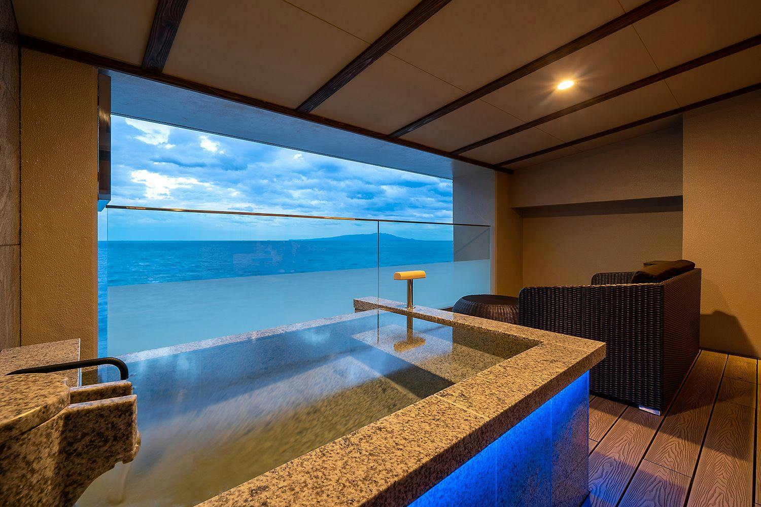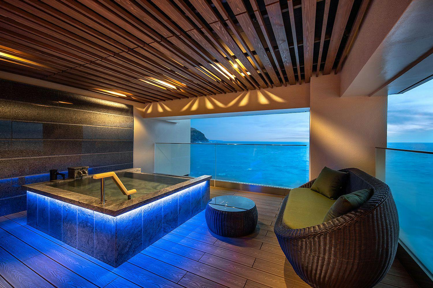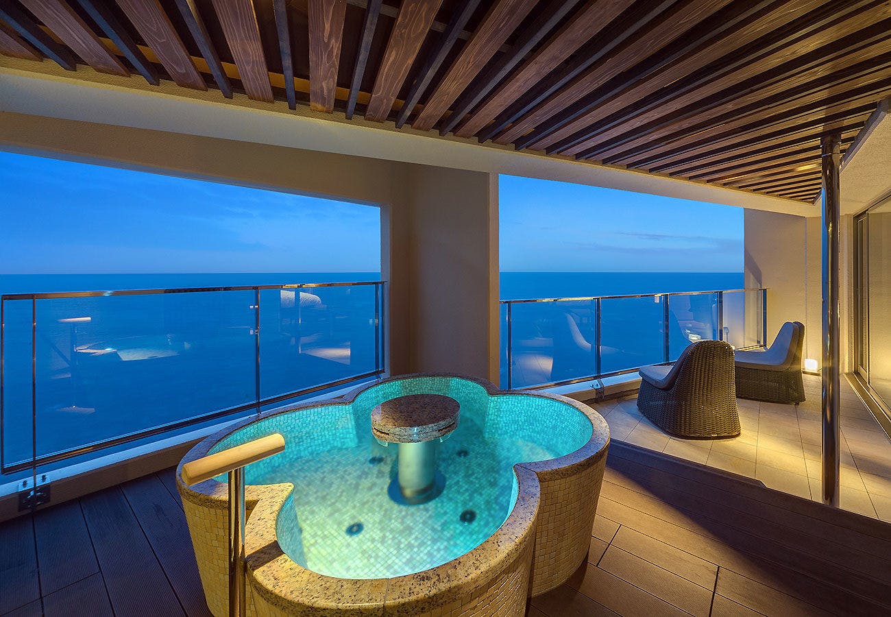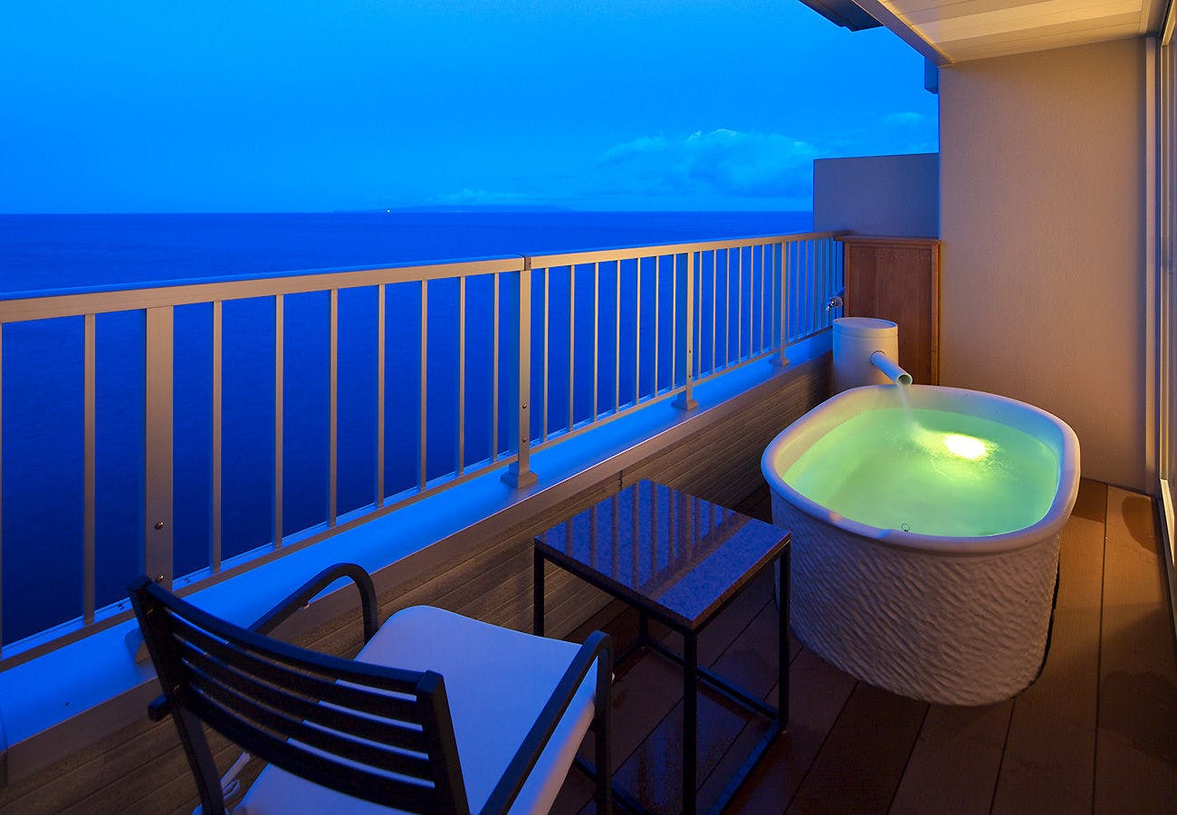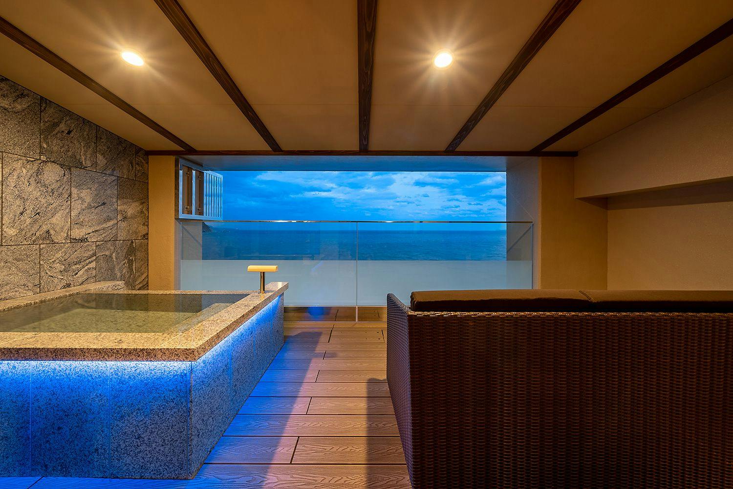 2022年12月3日ニューオープン!源泉かけ流し露天風呂付プレミアム感溢れるスイートルーム誕生。彼方まで広がる水平線から寄せ来る波。広いデッキテラスから、その潮騒を耳に、身体はまるで海上を漂う船のように優雅。ゆったりした露天風呂と上質なしつらえに、心は和み、癒されていきます。