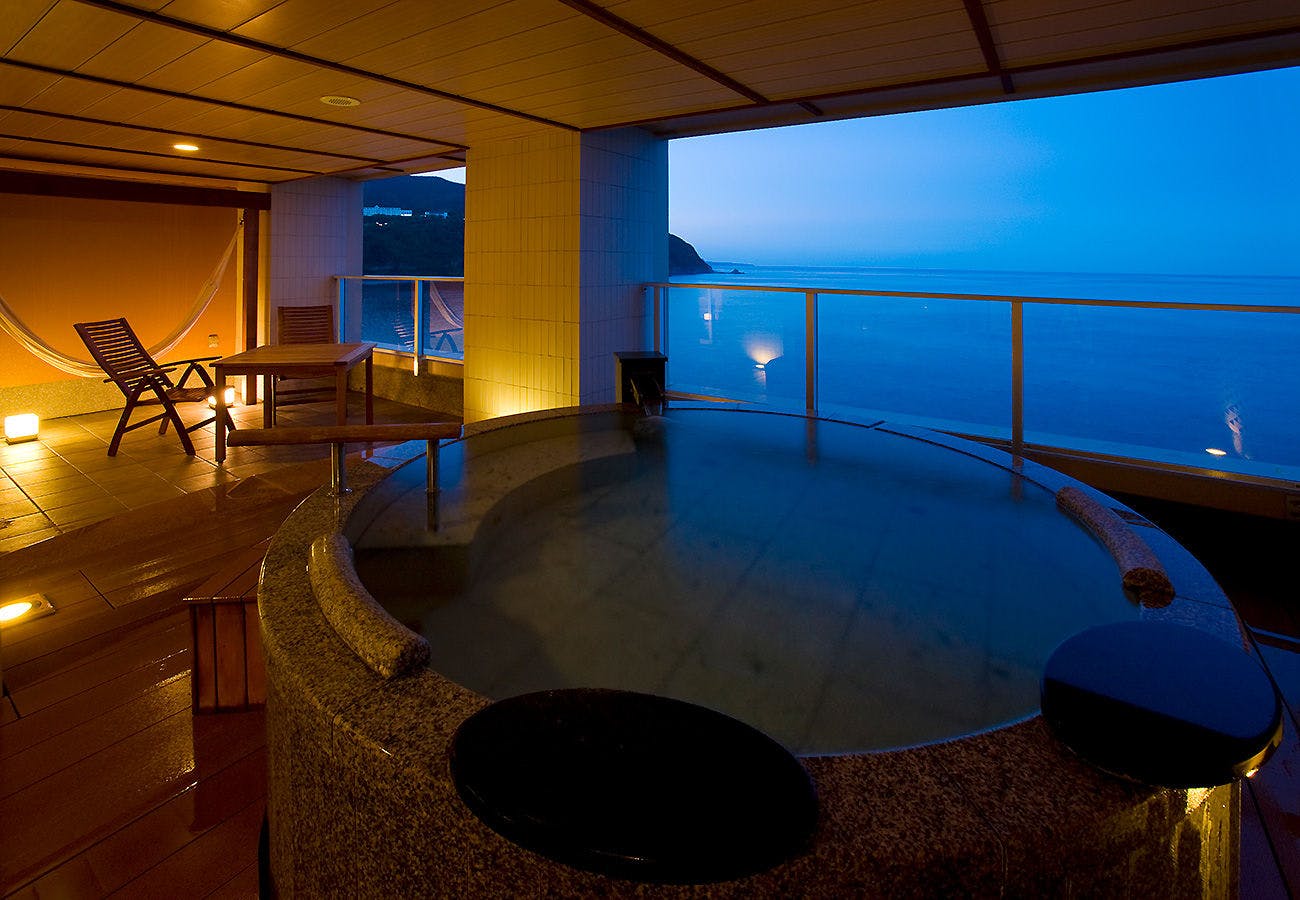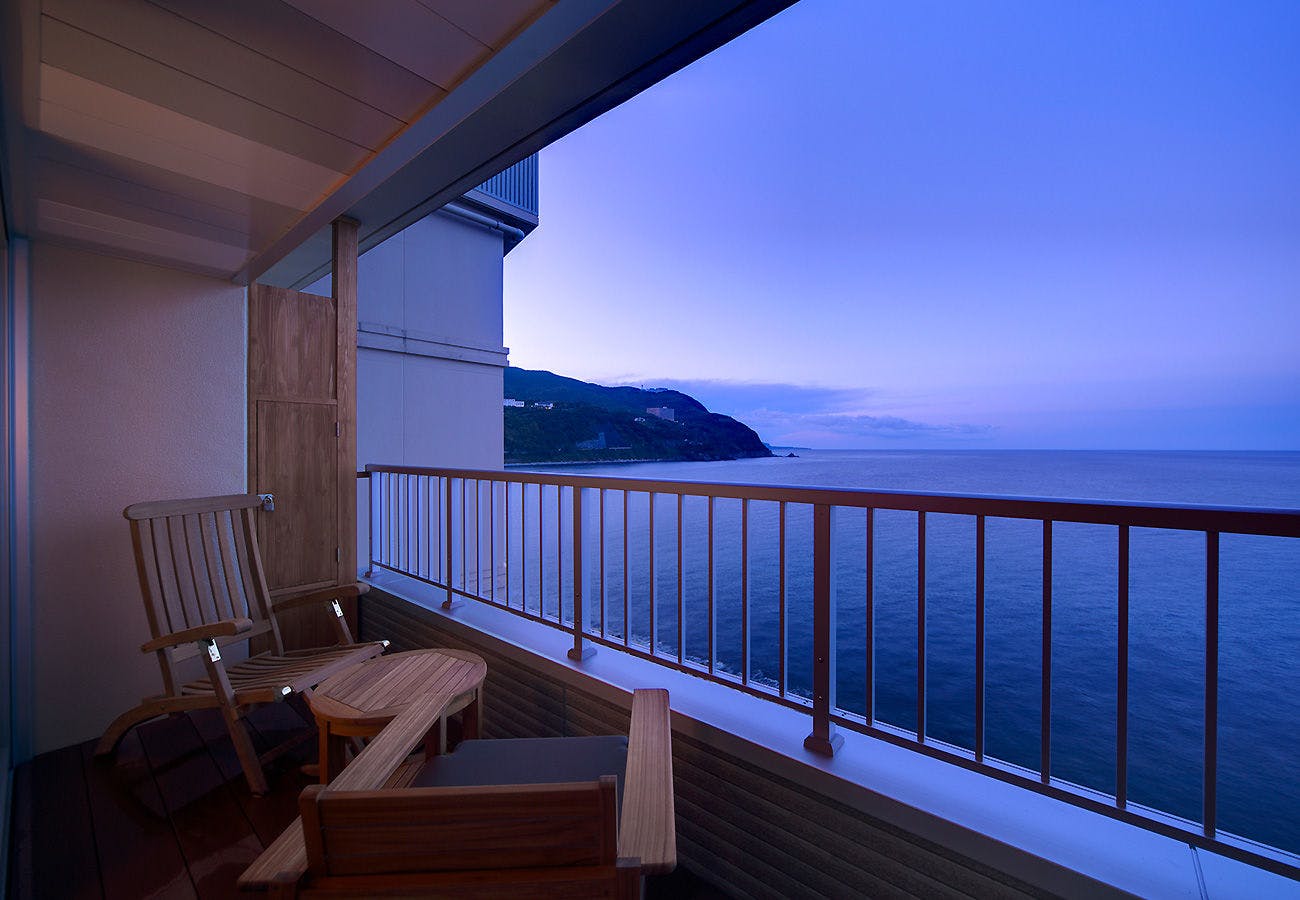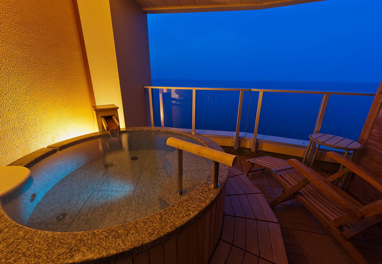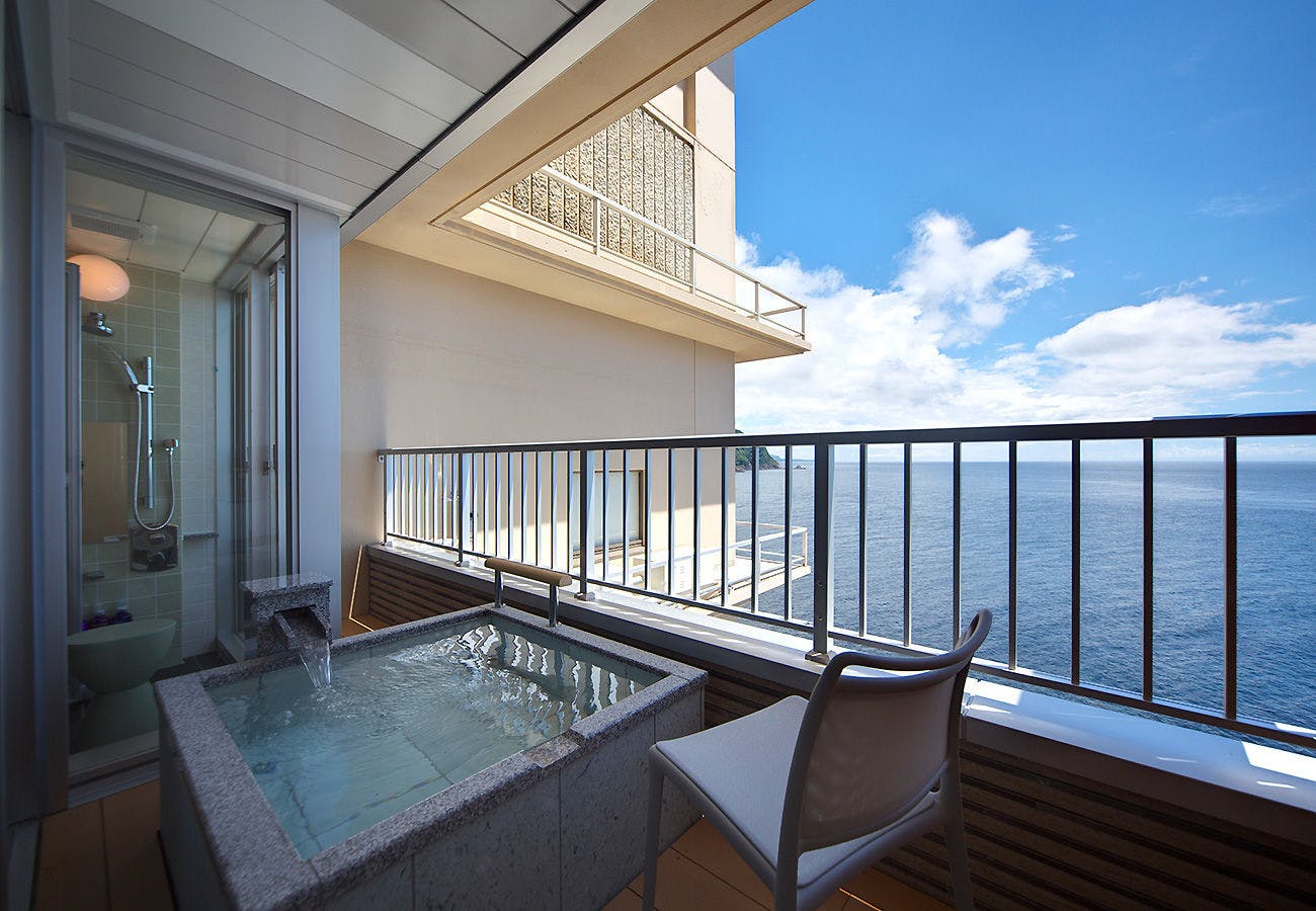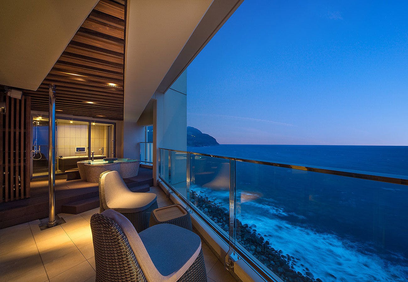 2022年12月3日ニューオープン!源泉かけ流し露天風呂付プレミアム感溢れるスイートルーム誕生。彼方まで広がる水平線から寄せ来る波。広いデッキテラスから、その潮騒を耳に、身体はまるで海上を漂う船のように優雅。ゆったりした露天風呂と上質なしつらえに、心は和み、癒されていきます。