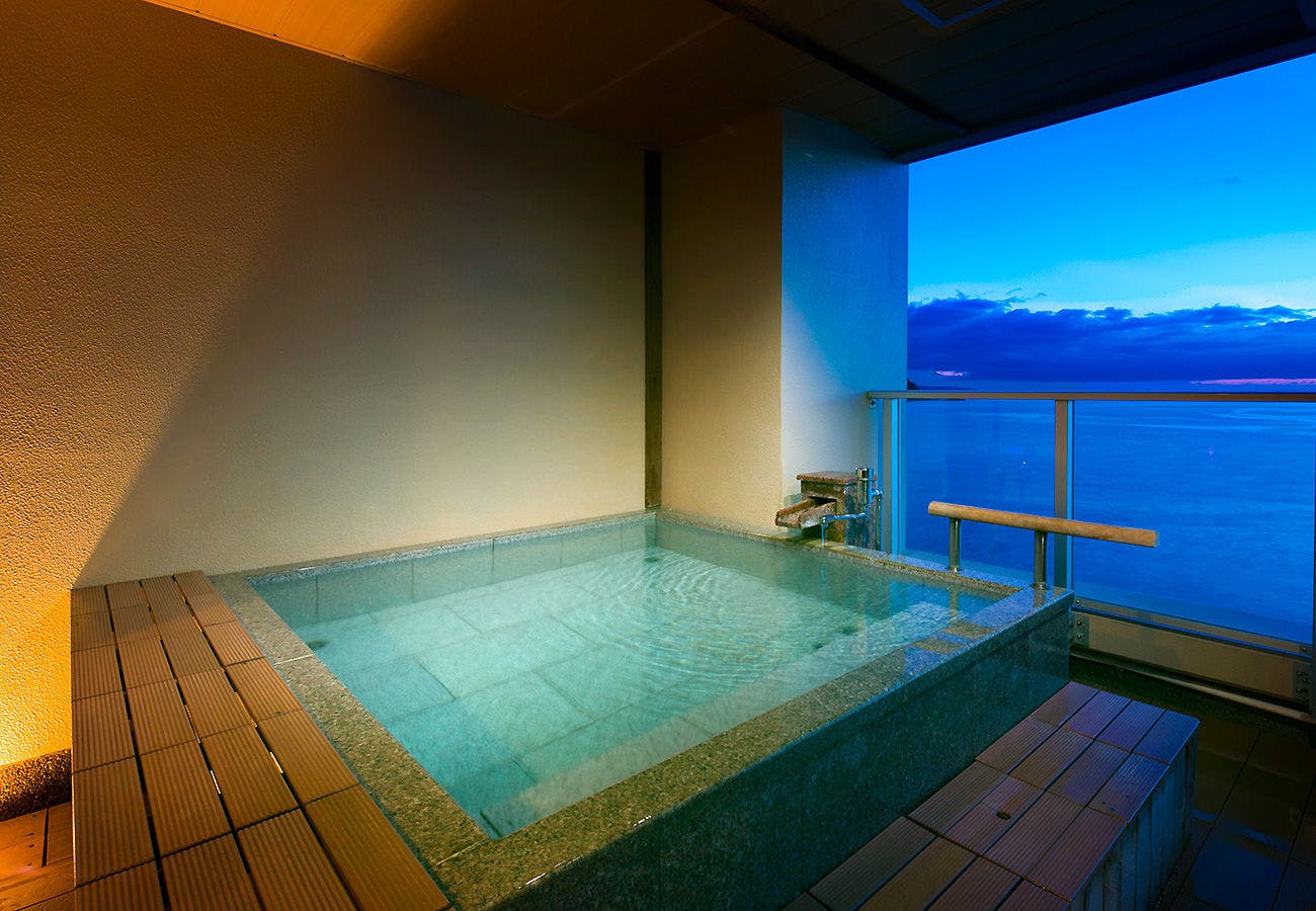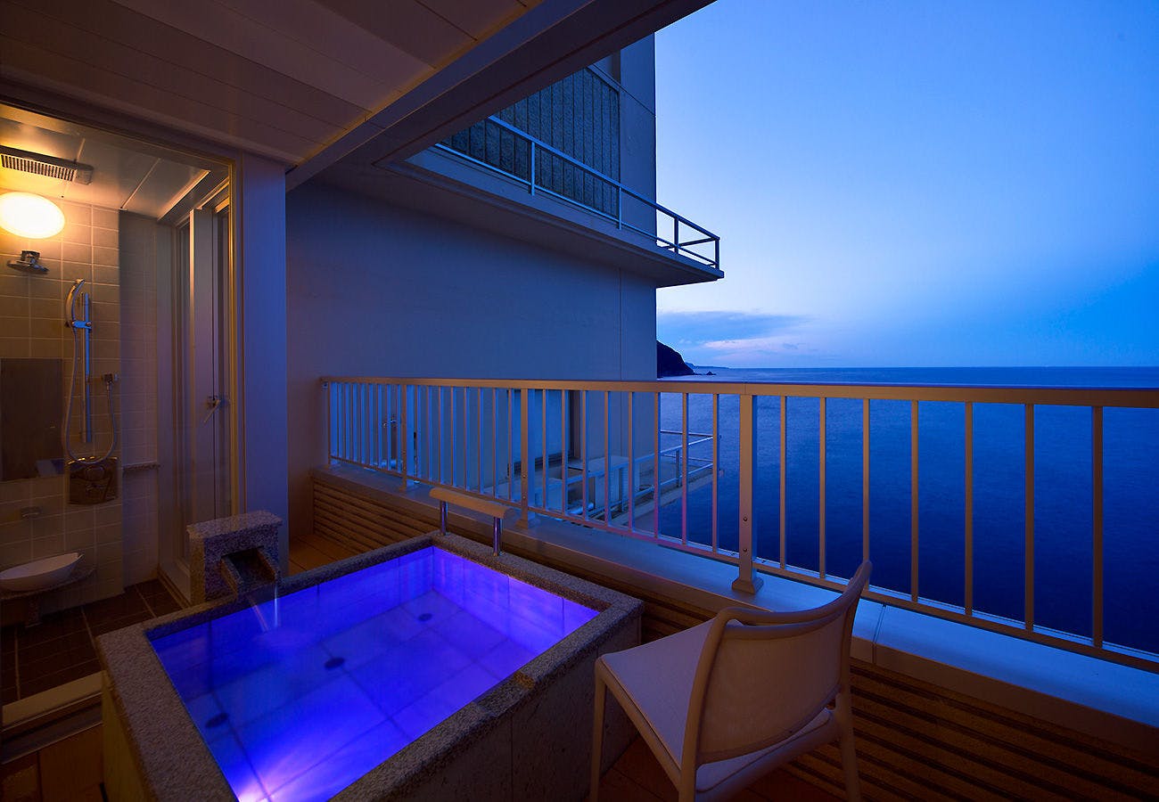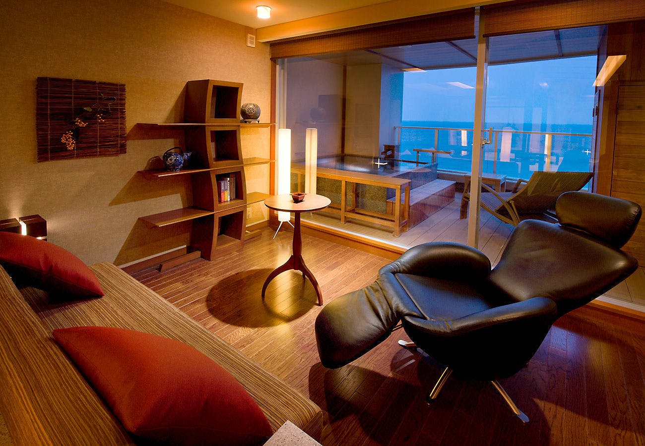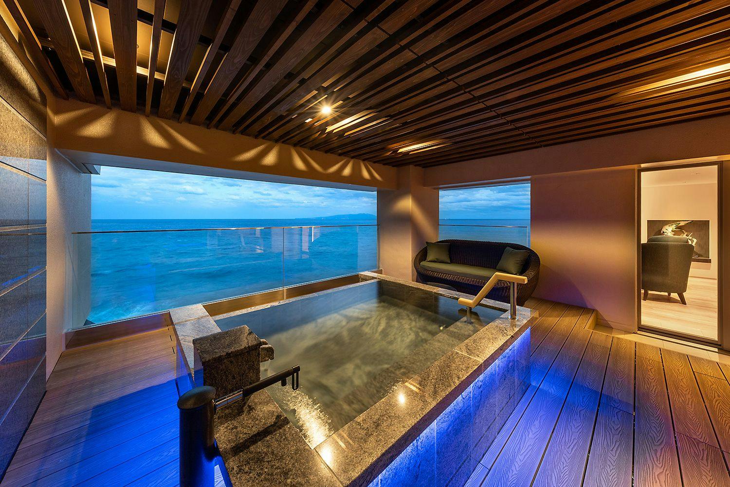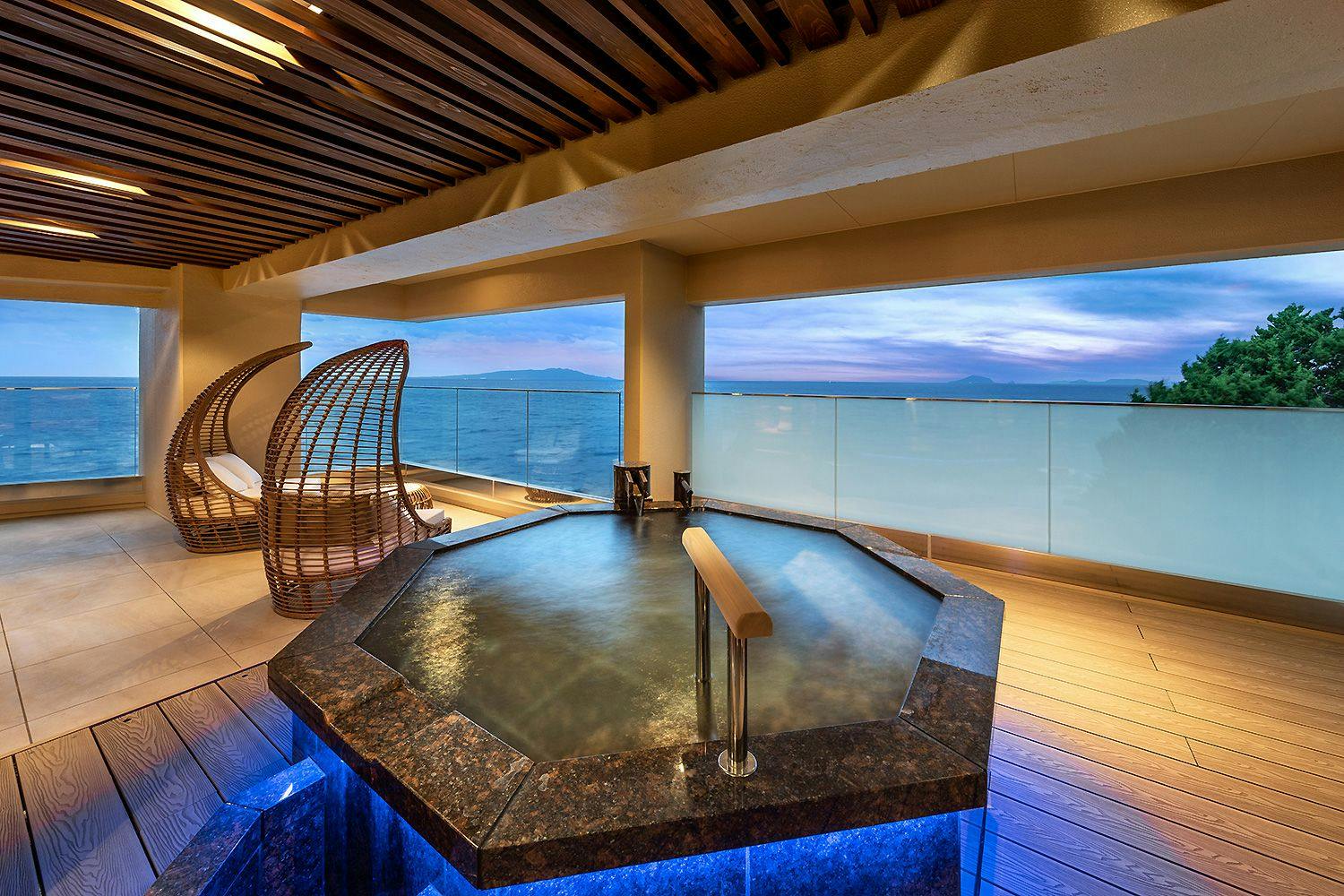 2022年12月3日ニューオープン!源泉かけ流し露天風呂付プレミアム感溢れるスイートルーム誕生。彼方まで広がる水平線から寄せ来る波。広いデッキテラスから、その潮騒を耳に、身体はまるで海上を漂う船のように優雅。ゆったりした露天風呂と上質なしつらえに、心は和み、癒されていきます。