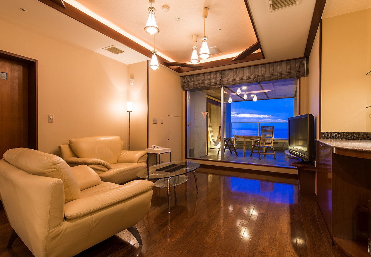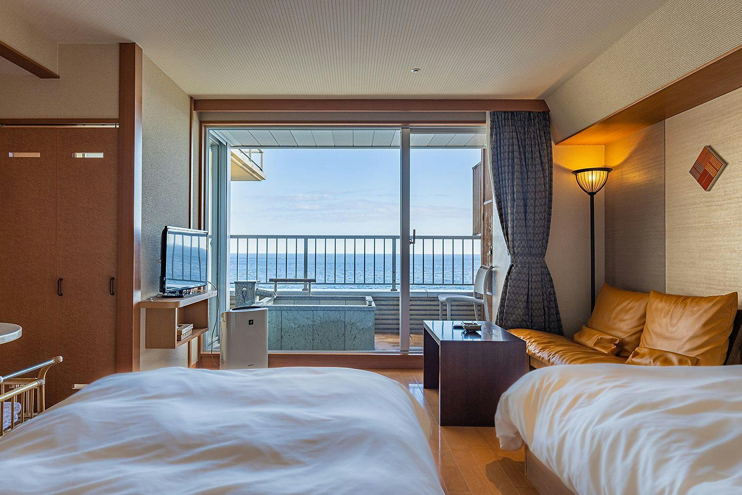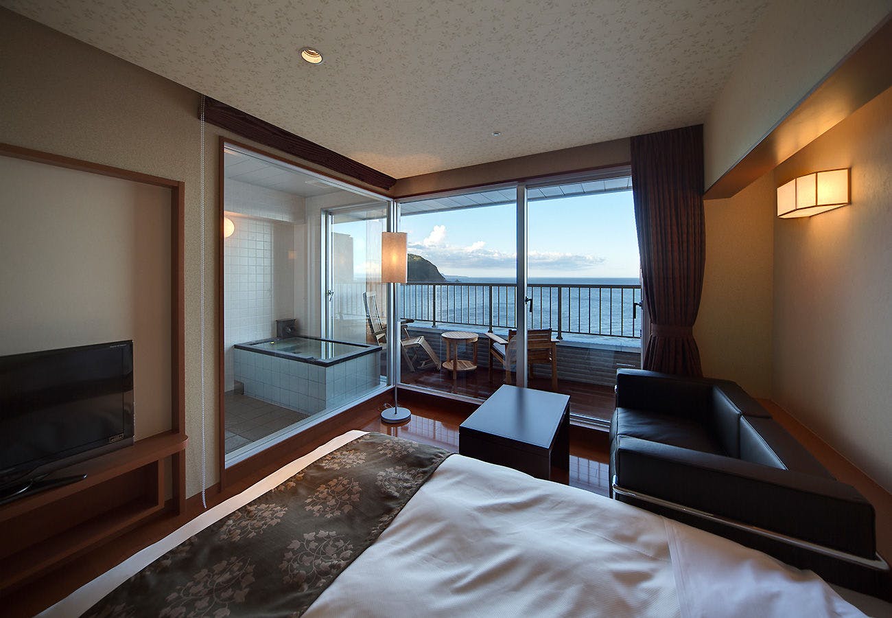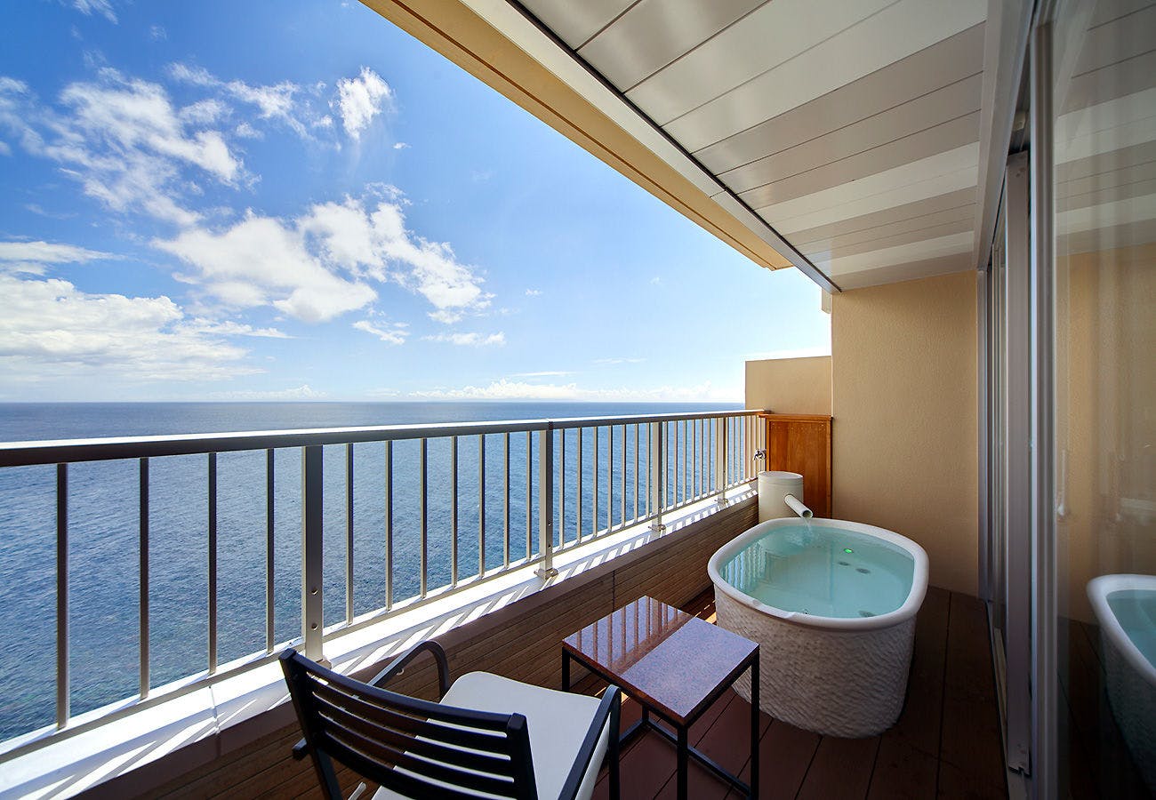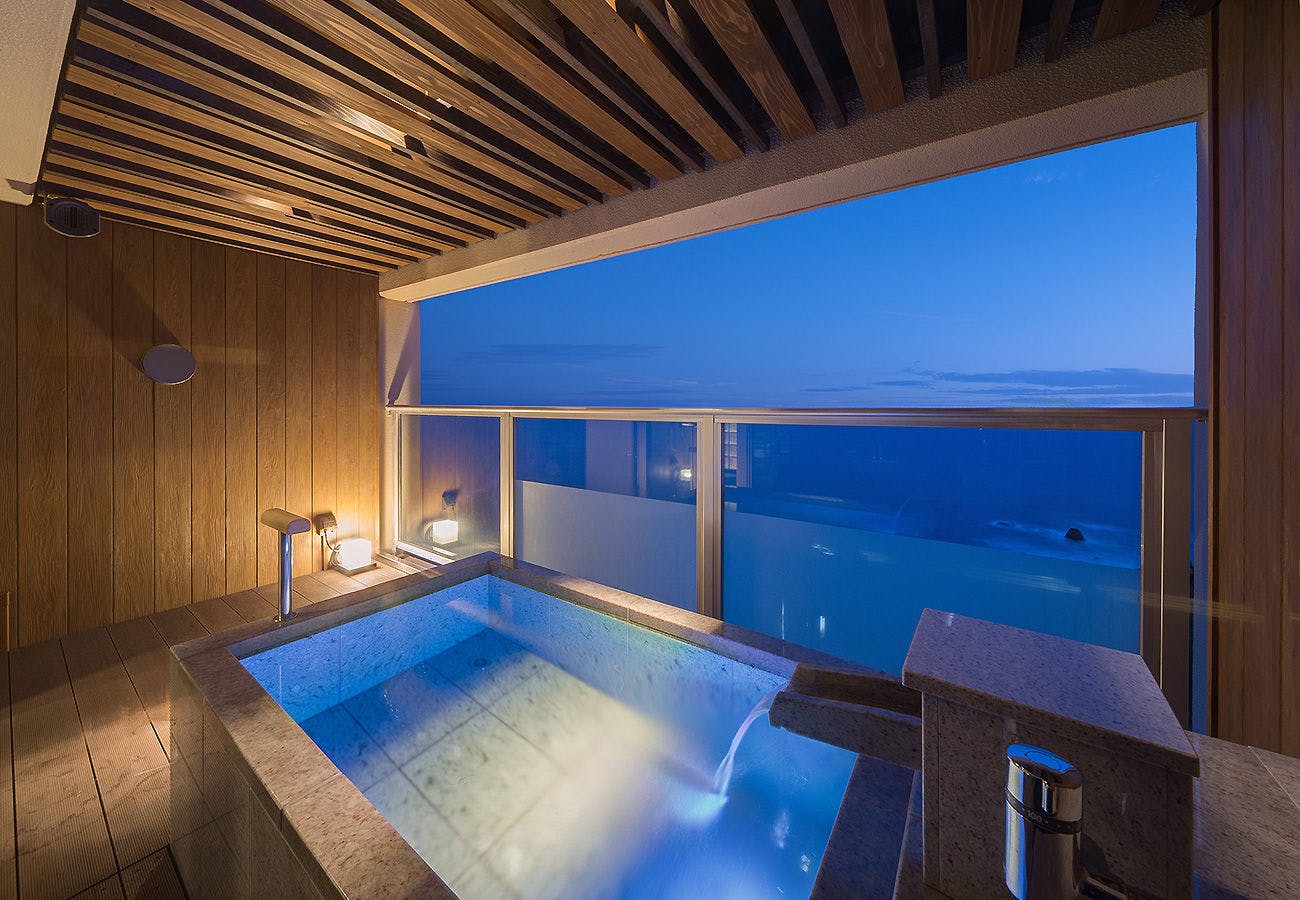 2022年12月3日ニューオープン!源泉かけ流し露天風呂付プレミアム感溢れるスイートルーム誕生。彼方まで広がる水平線から寄せ来る波。広いデッキテラスから、その潮騒を耳に、身体はまるで海上を漂う船のように優雅。ゆったりした露天風呂と上質なしつらえに、心は和み、癒されていきます。