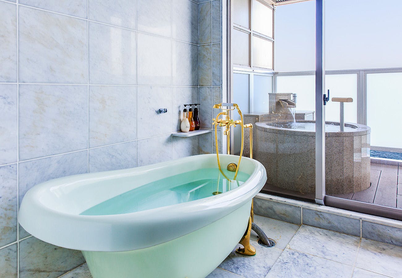 天然温泉の露天風呂からは大海原を望み、内風呂は猫足バスタブ!