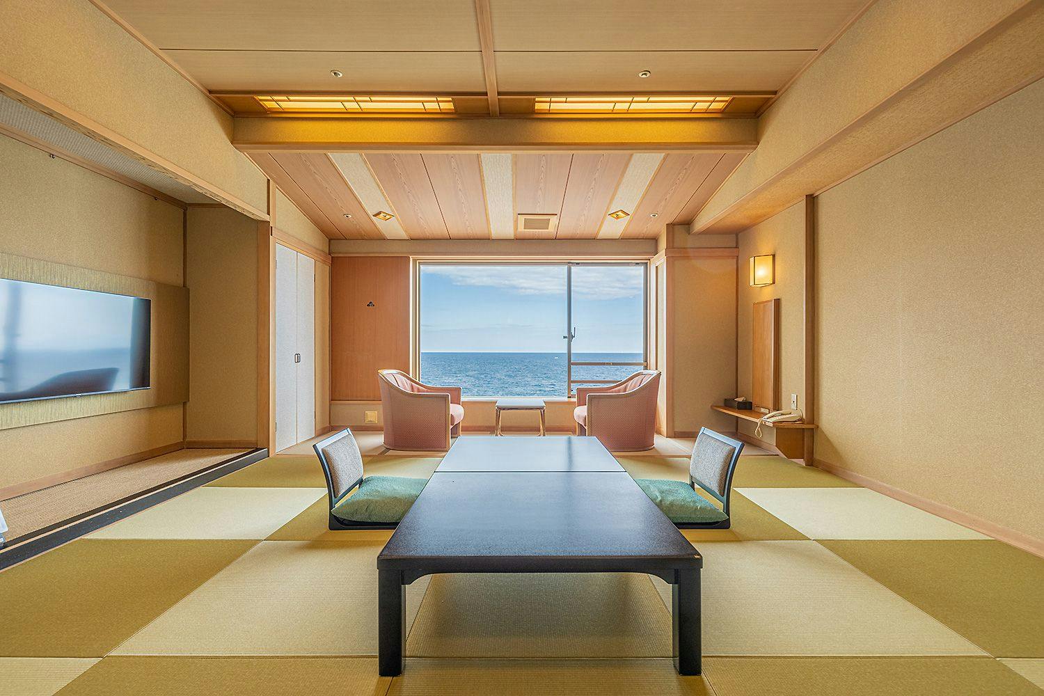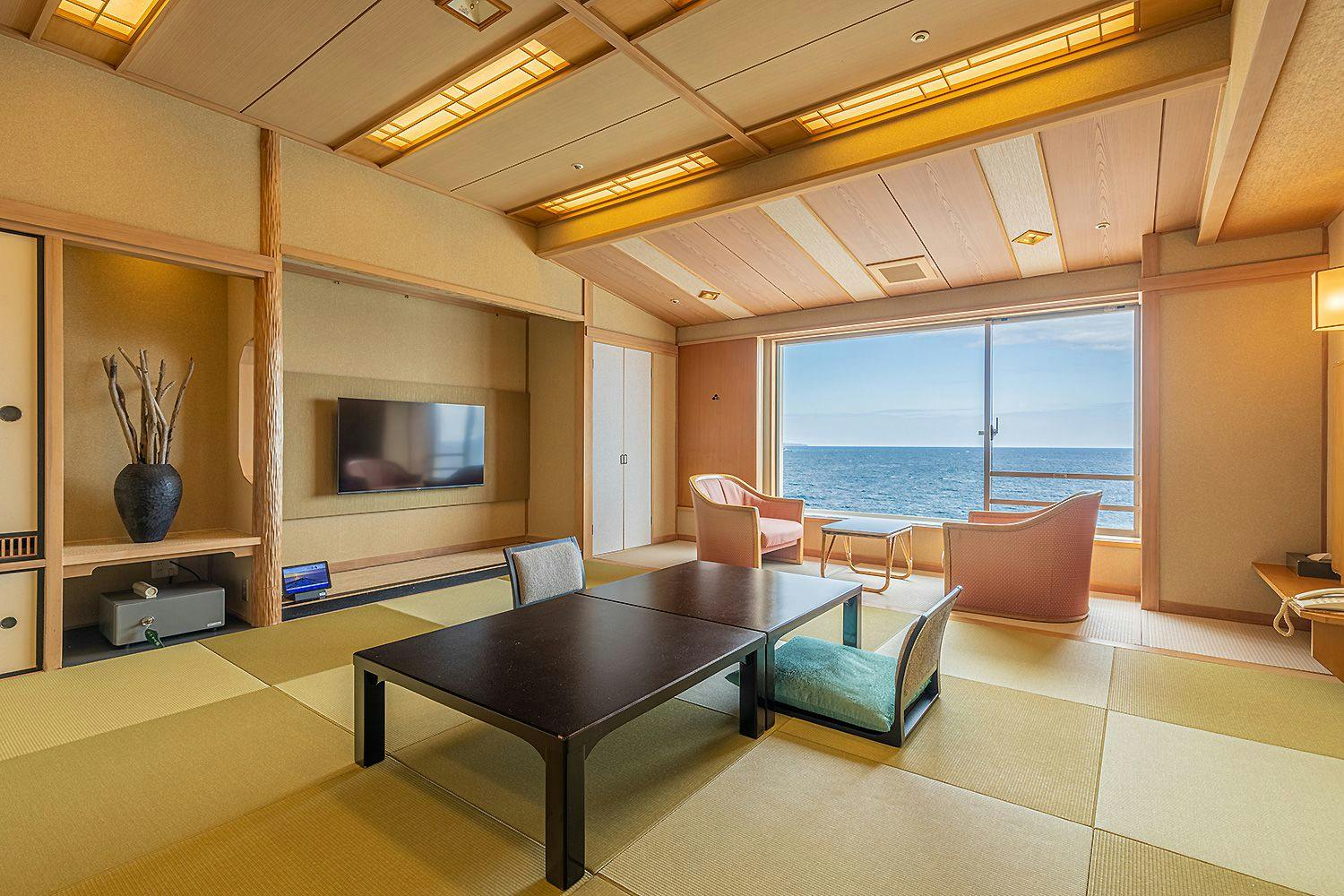お部屋の入り口からでも海が一望できる和室12.5帖+広縁の仕切りの無い開放的なお部屋。