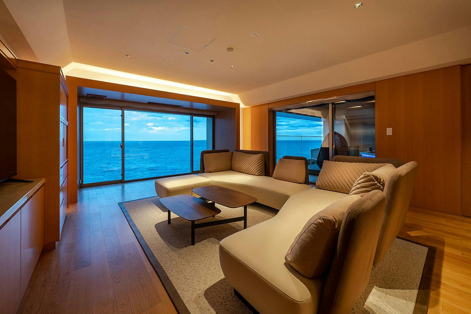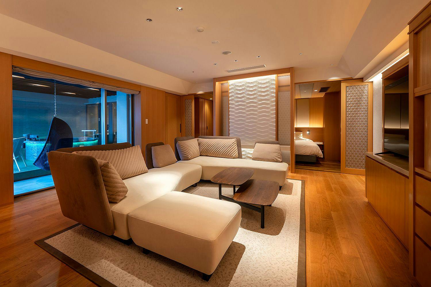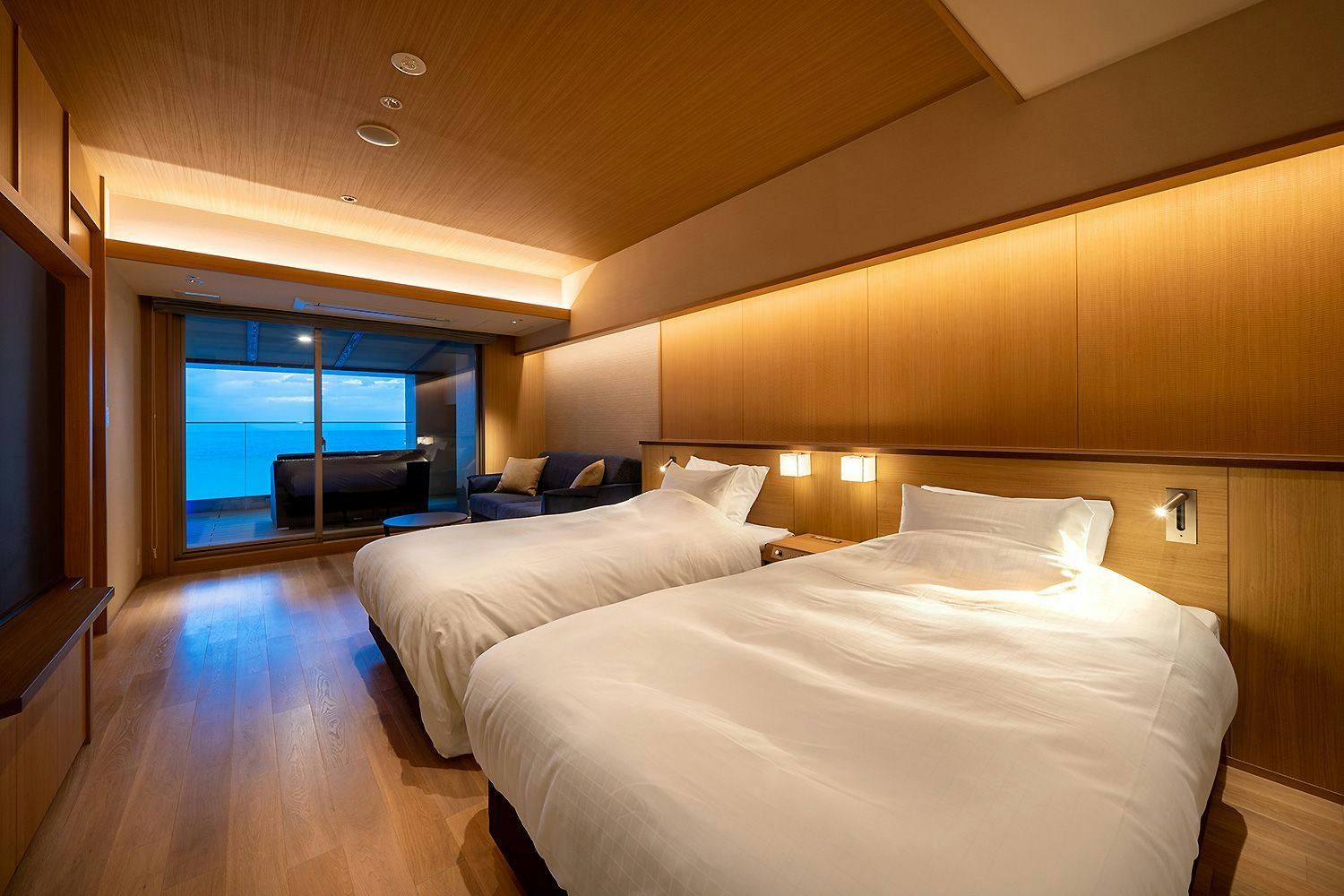 2022年12月3日ニューオープン!源泉かけ流し露天風呂付ラグジュアリー感に満ちたスイートルーム。白木ベースの内装。すべての面でラグジュアリーリゾートとしての品格を備えたしつらえ。海上に浮かぶ今宵の月が描く波の道(ムーンロード)を微睡みながら眺めるような、幻想的な一夜を演出いたします。