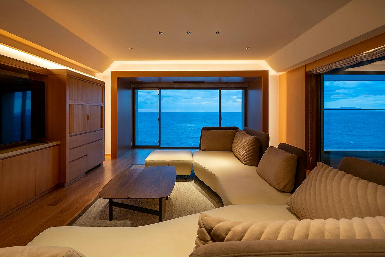 海側は床から天井まで一面ガラスで、臨場感あふれる海をお楽しみ頂けます。