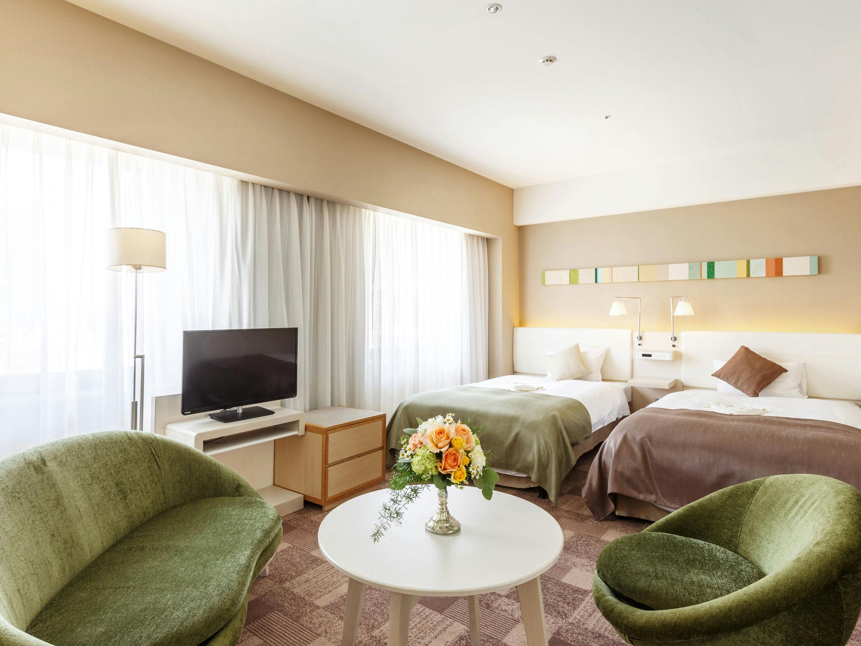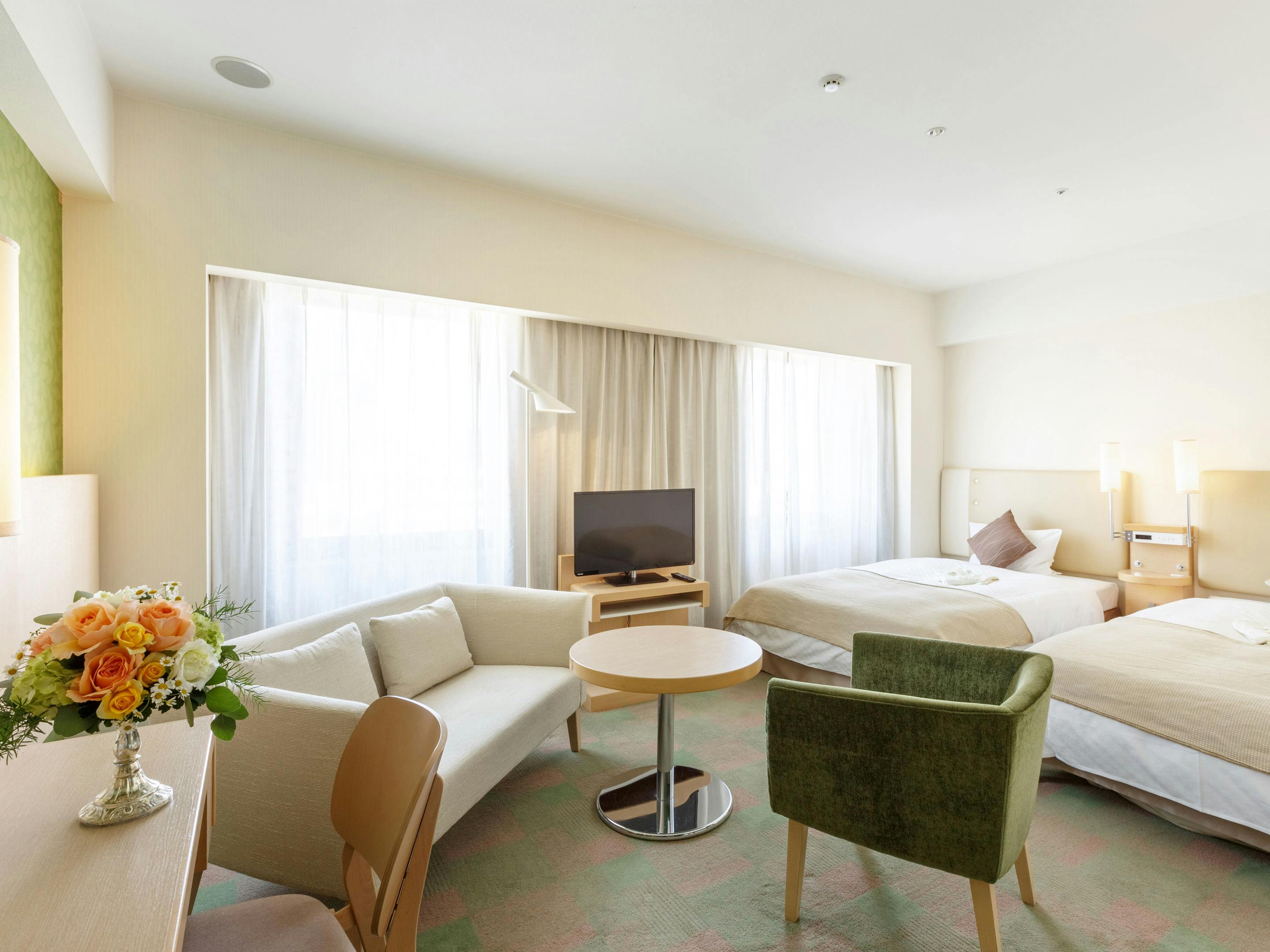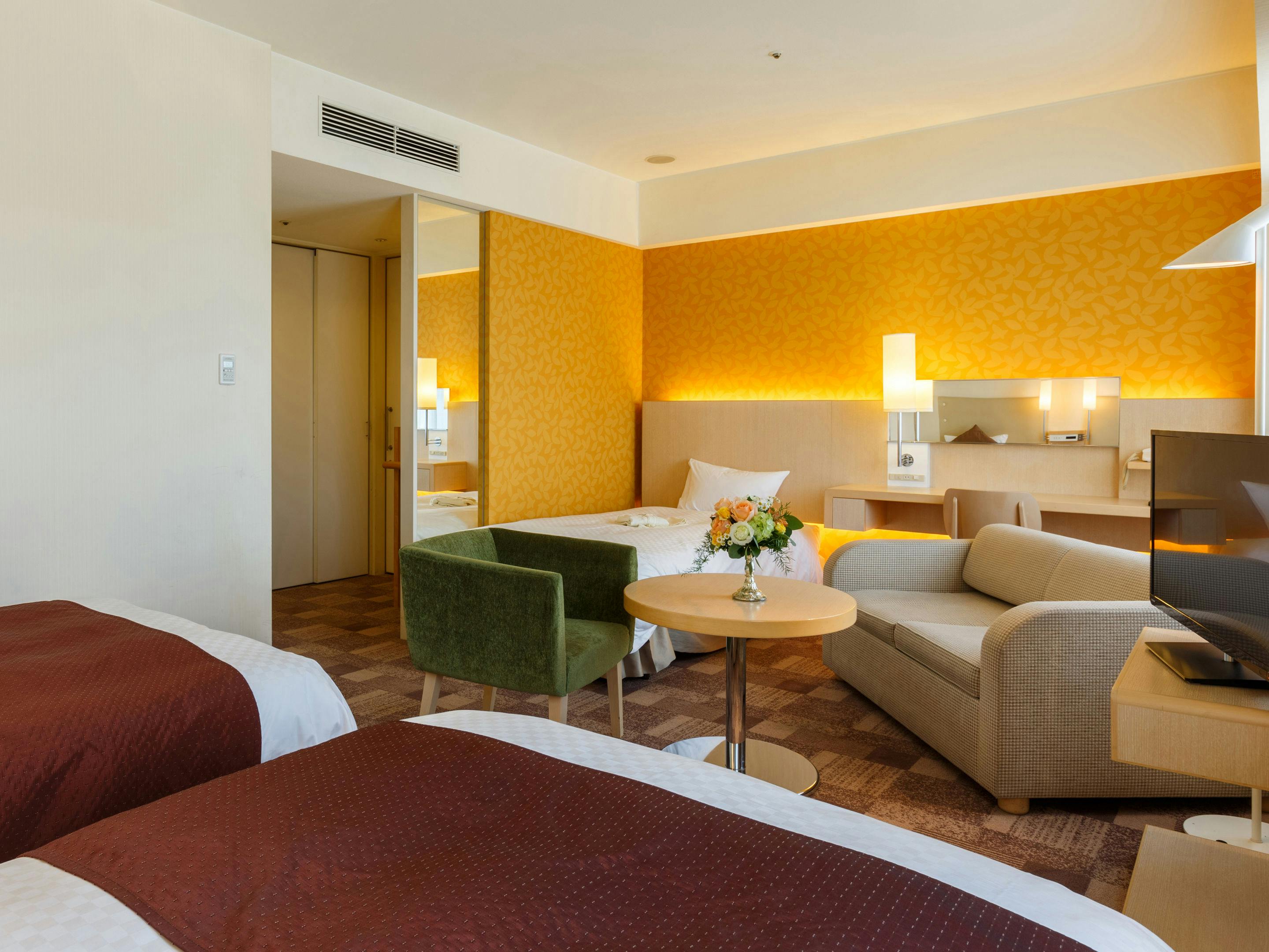 バス、トイレがセパレートで使いやすいツインルーム。リビングスペースもあり、ゆったりとお寛ぎいただけます。※高速道路に面しております。予めご了承下さい。