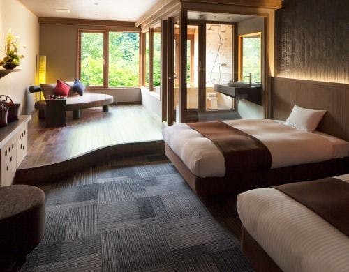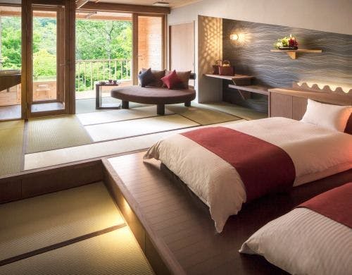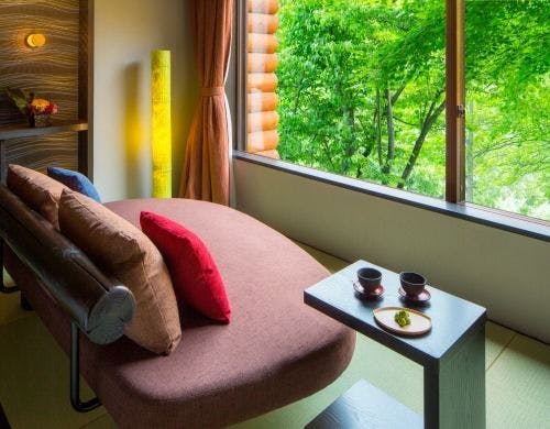 「渓流のほとりに滞在」渓流や雄大な自然を近に感じられる、渓流に面したお部屋。美しい自然を最大限にお楽しみいただくため、空間をシンプルにデザイン。窓際には足を伸ばしてゆったり寛げる渓流ごろんとチェア。自然と対峙する和やかなときをお過ごしください。※禁煙室