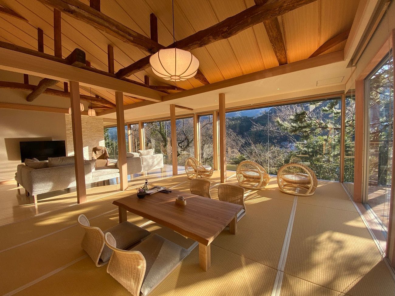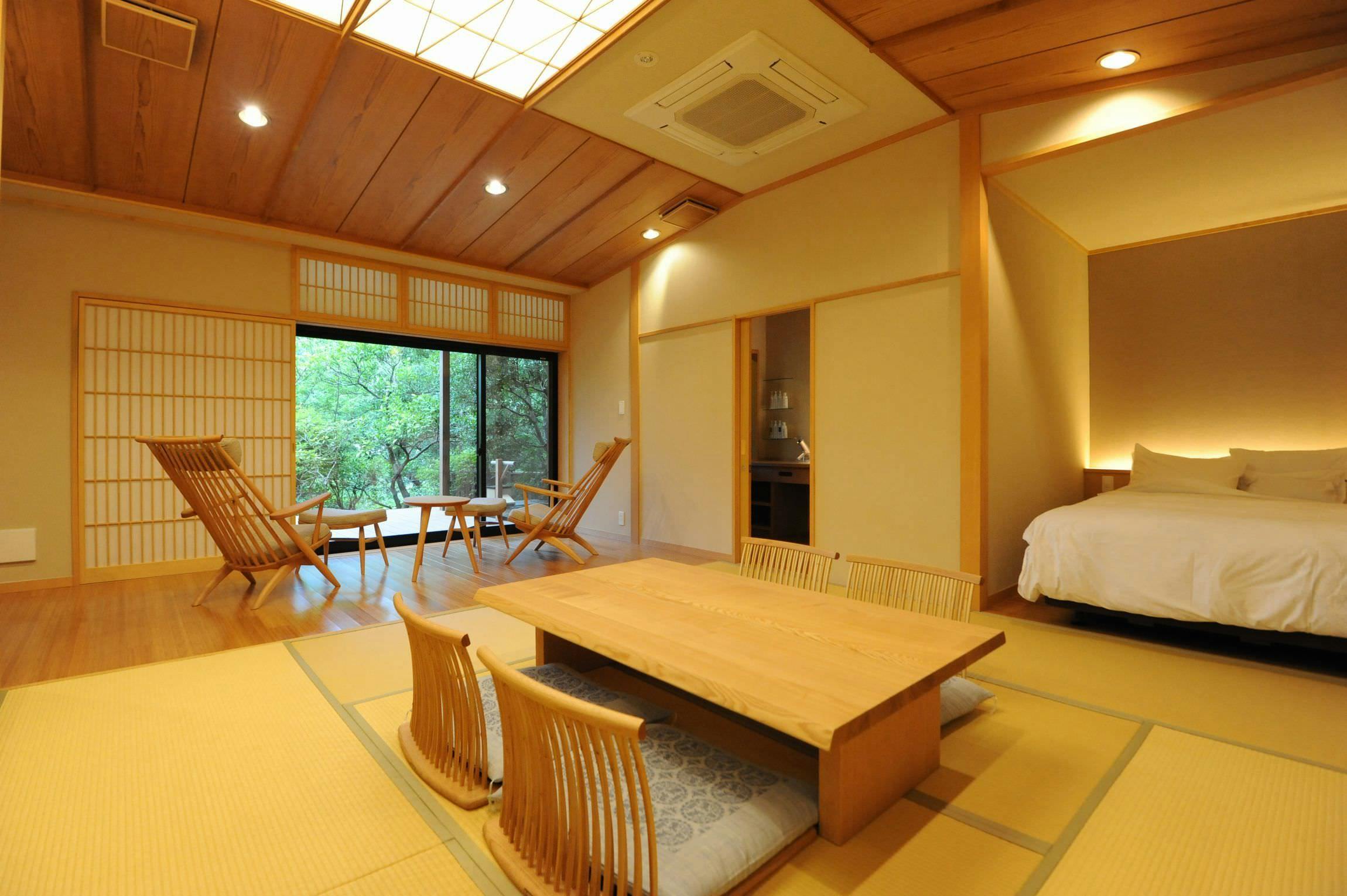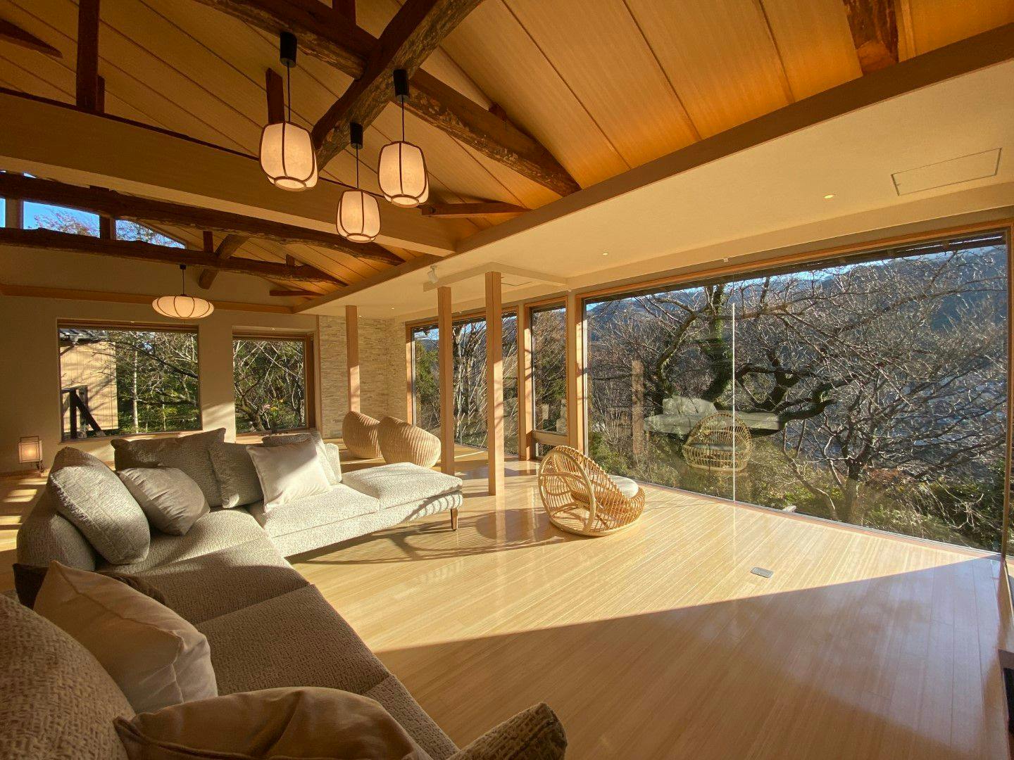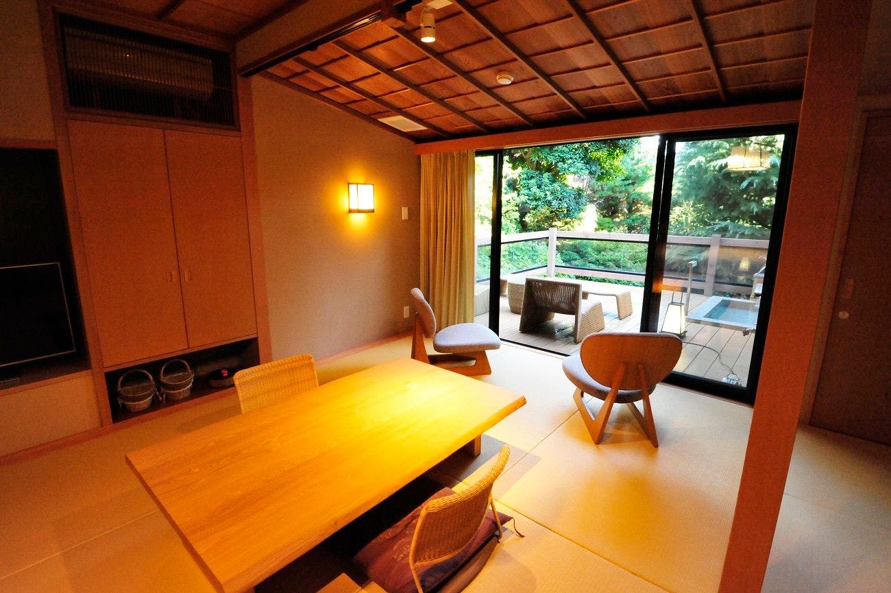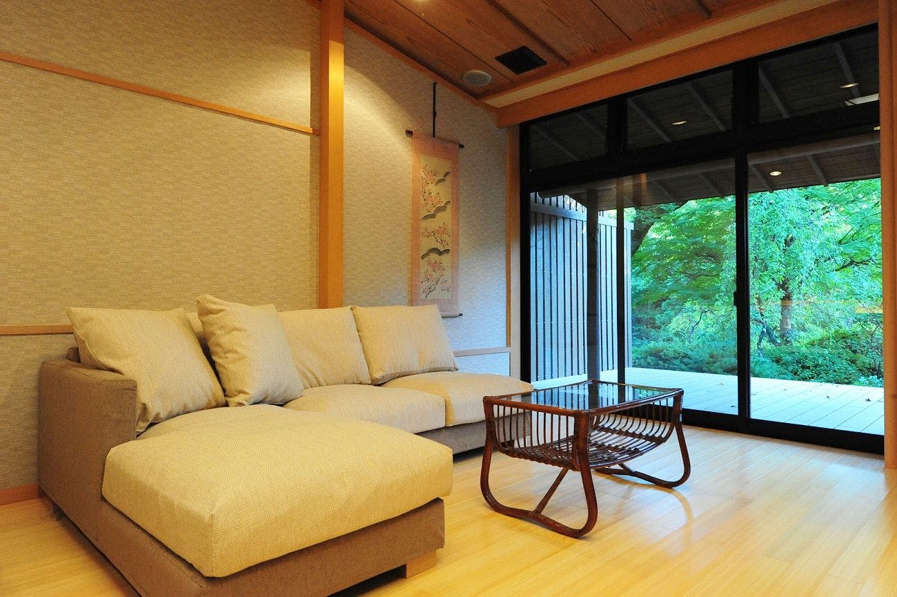 自然の借景を室内に取り込む採光性豊かな大窓、心地よさを追求した厳選の銘家具数々、趣ある設えとアメニティをご用意しております。