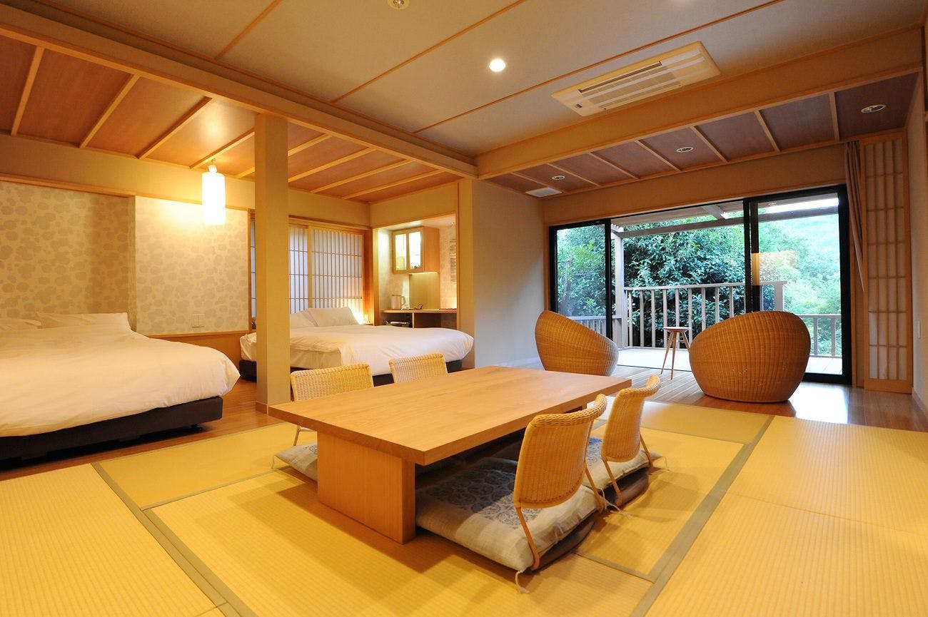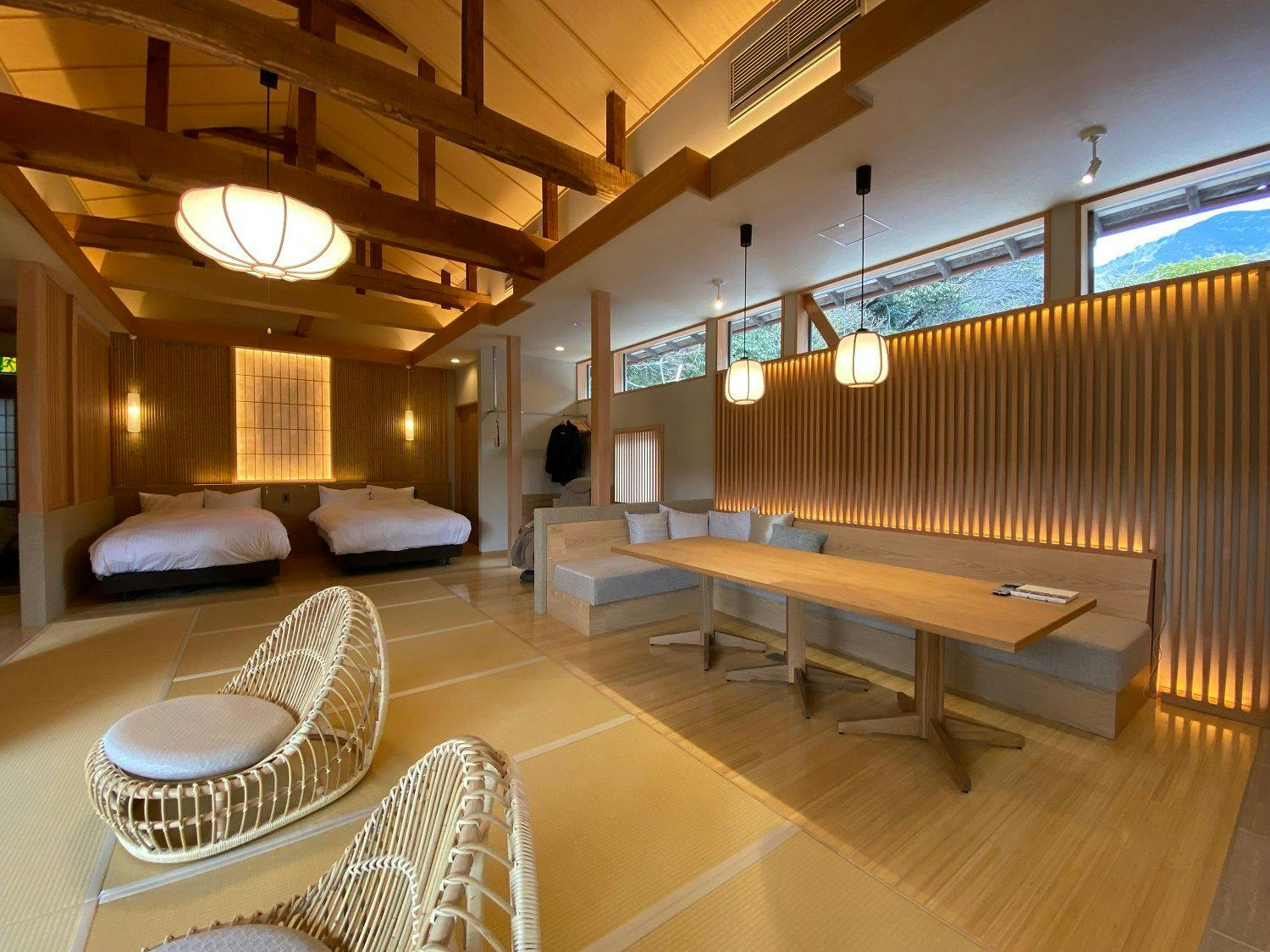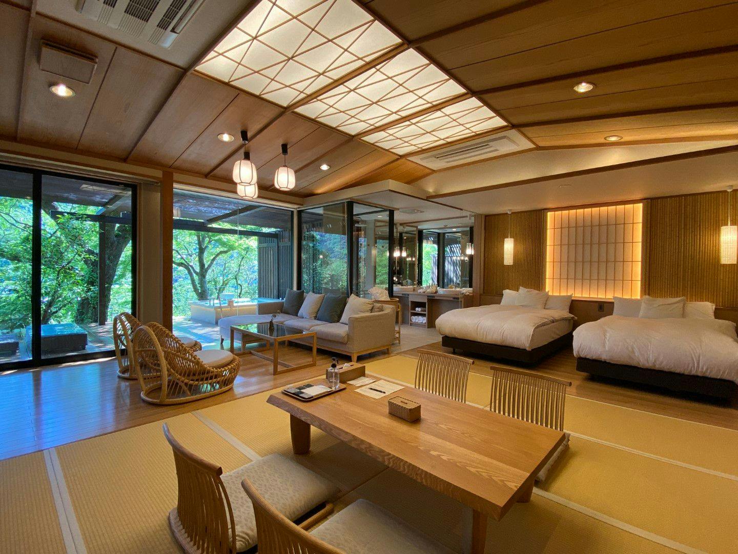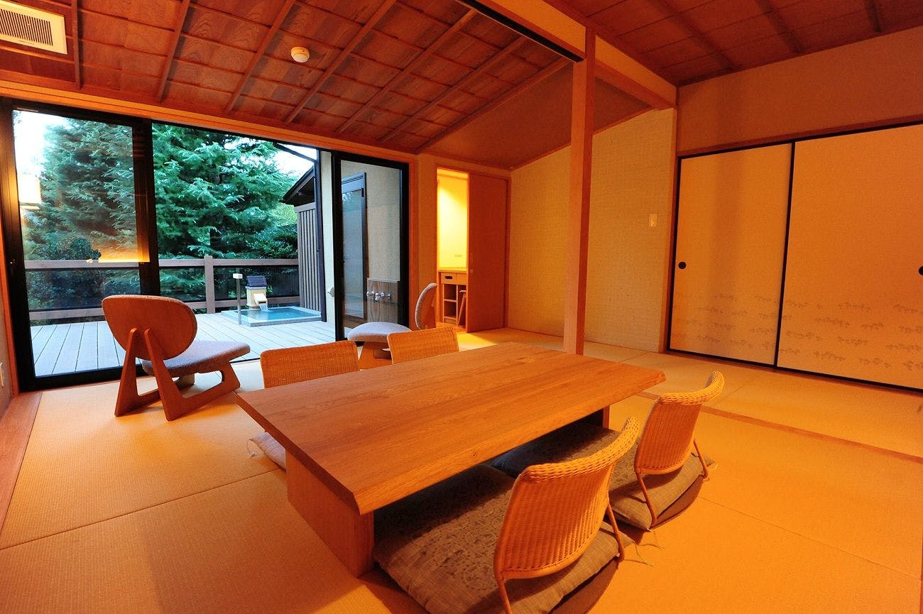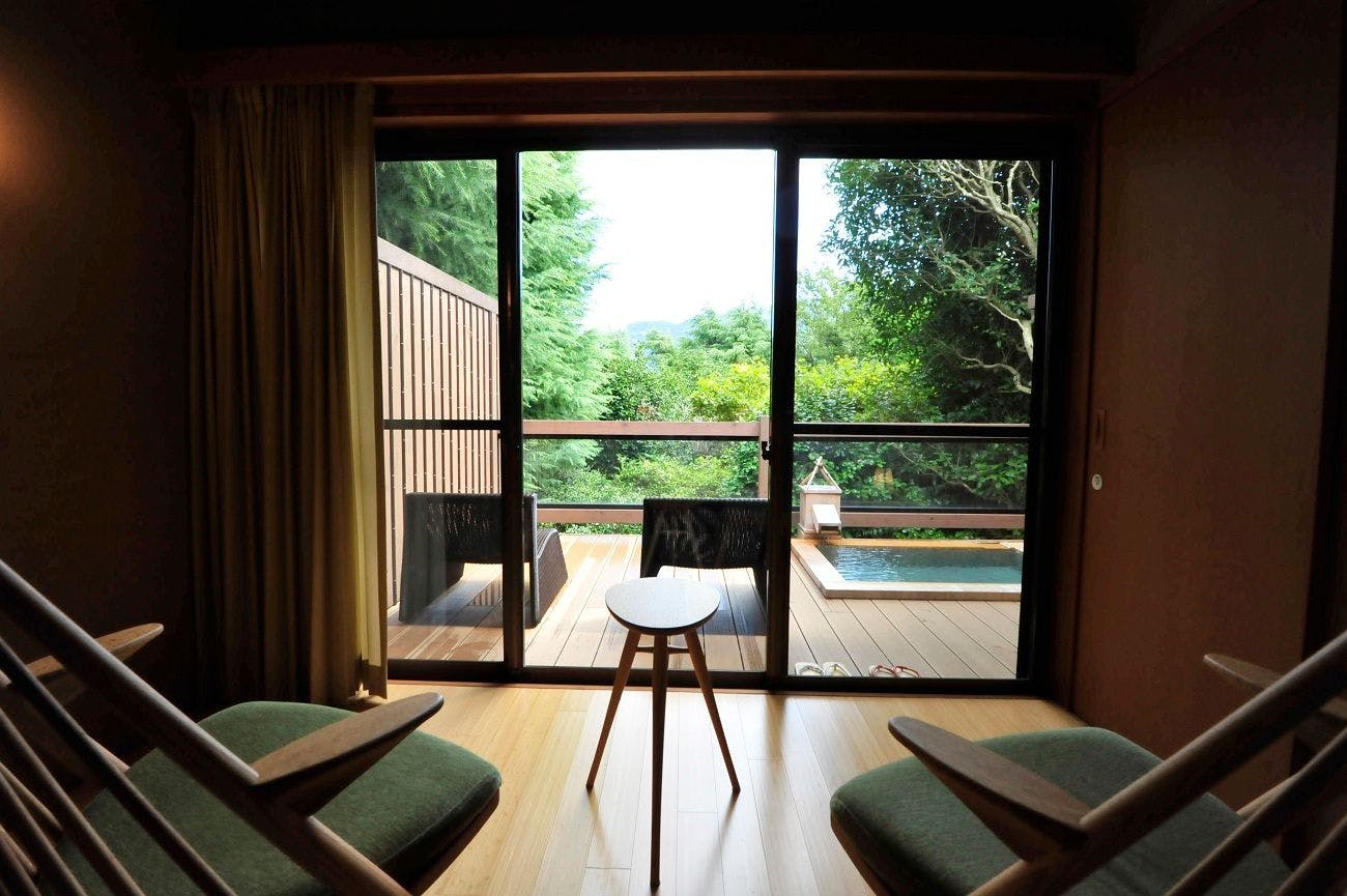 自然の借景を室内に取り込む採光性豊かな大窓、心地よさを追求した厳選の銘家具数々、趣ある設えとアメニティをご用意しております。