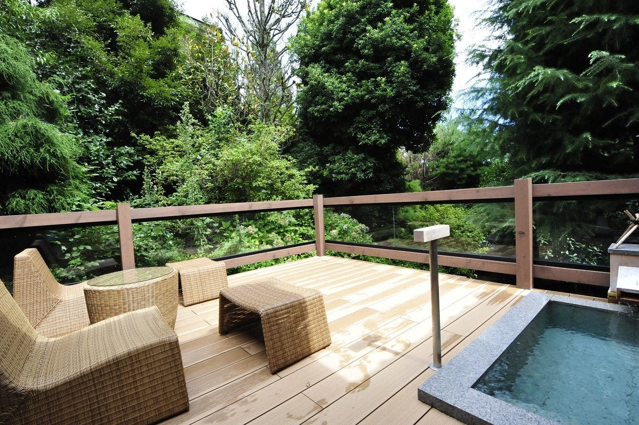 夜には幻想的にライトアップされる主庭園を見下ろし、遠くに箱根連山の稜線を見晴らす解放感たっぷりのデッキ。