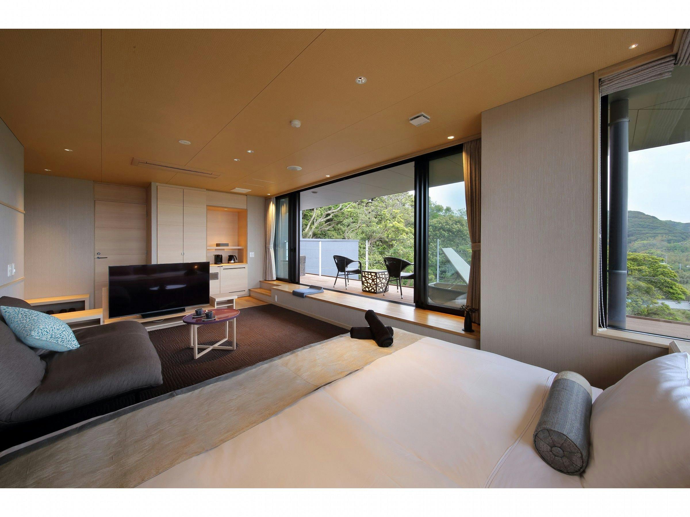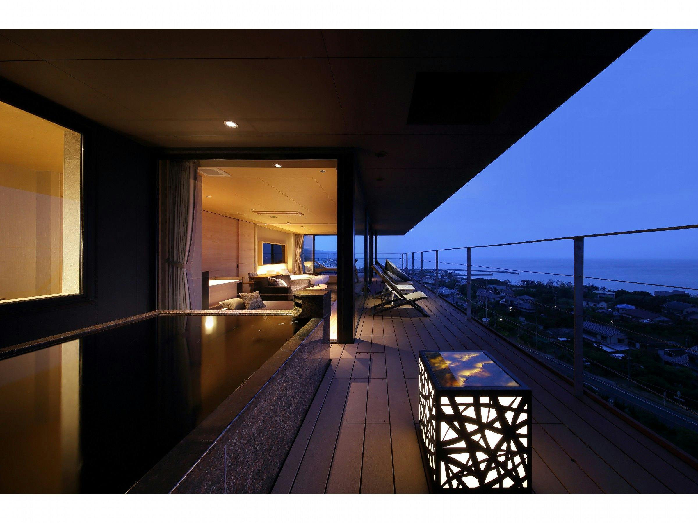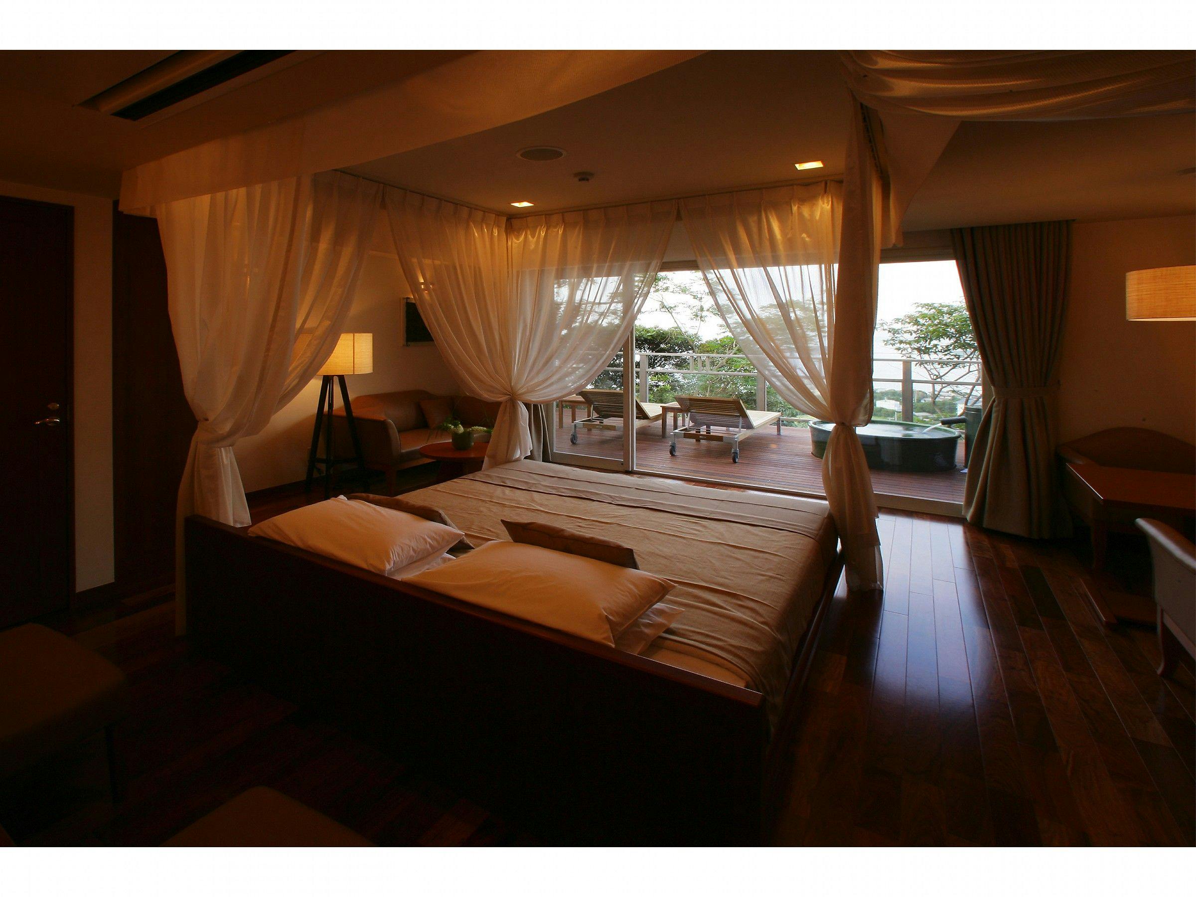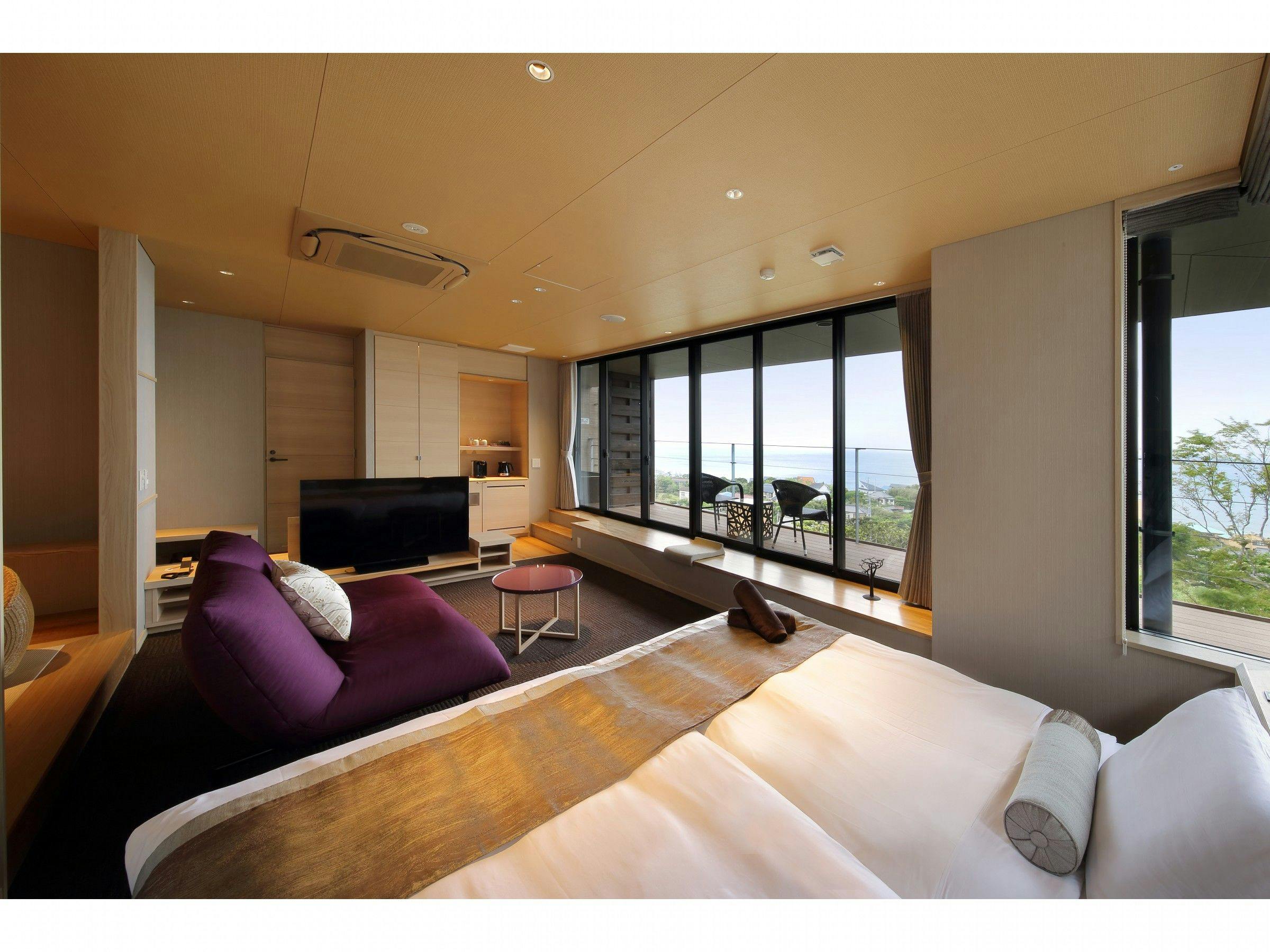 最大定員 4名様211平米【テラス含む】リビング、ウォークインクローゼット、専用ダイニング、ベッドルーム(2室)、温泉露天風呂、シャワーブース、トイレ、海眺めのテラスシモンズ社製ベッド
