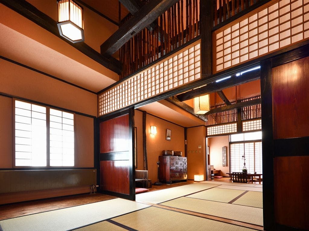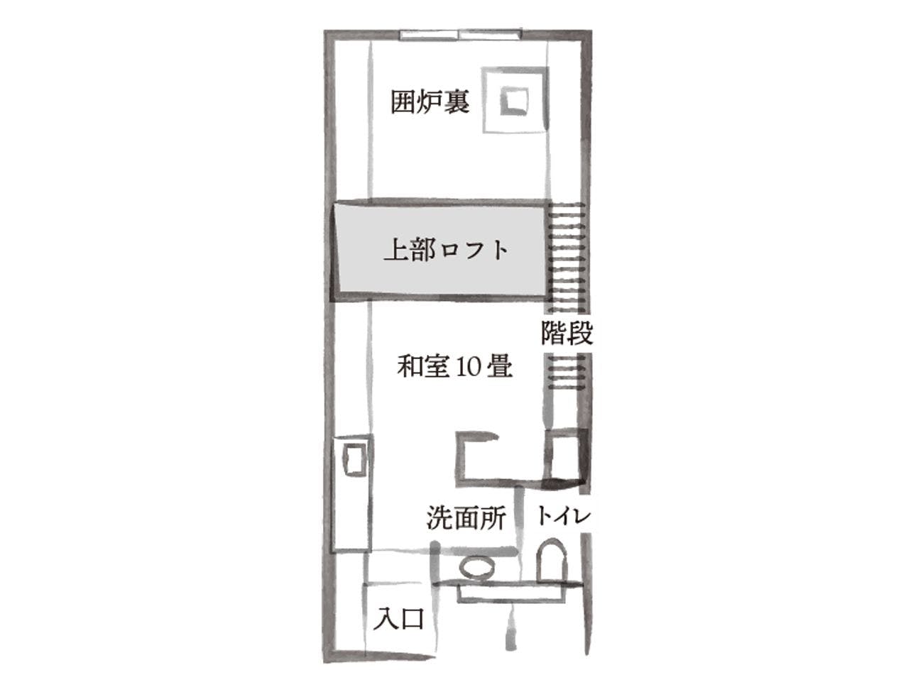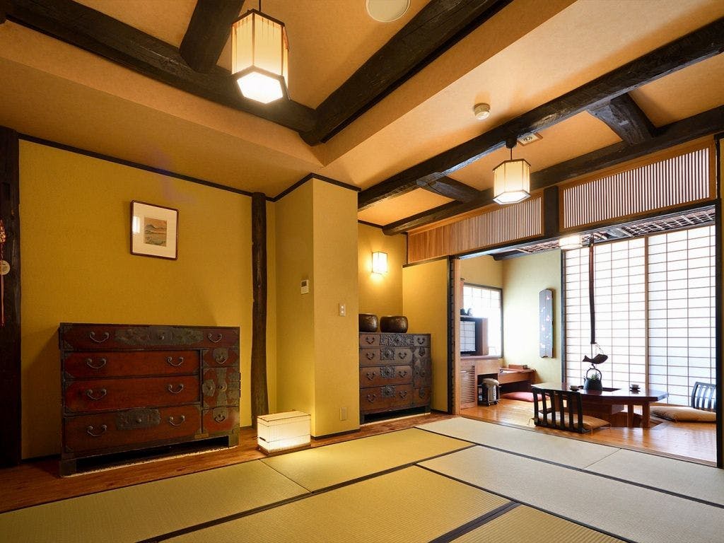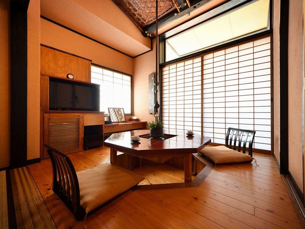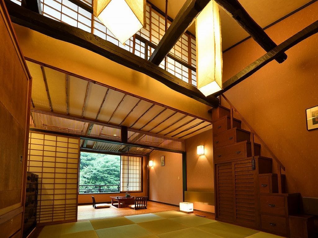 囲炉裏の間+和室+ロフト付の贅沢なつくりです。メゾネットタイプのお部屋です。※全ての客室を禁煙とさせていただいております。(電子たばこも含む)お煙草を吸われるお客様は、館内指定の場所にて喫煙をしていただきますよう、ご理解ご協力の程お願い申し上げます。