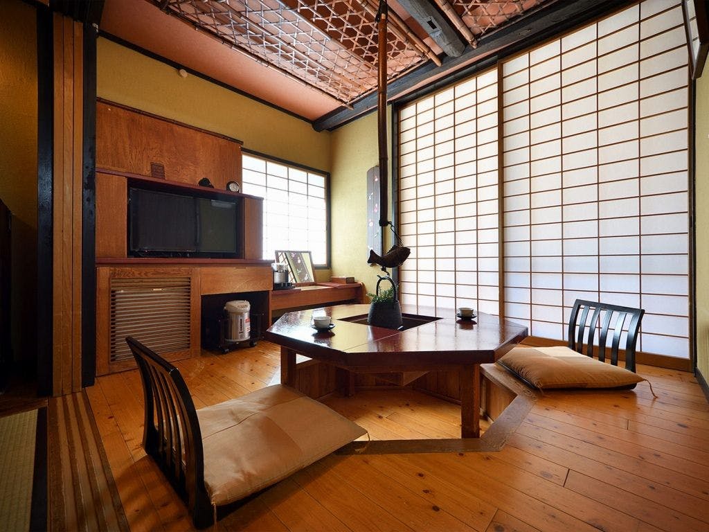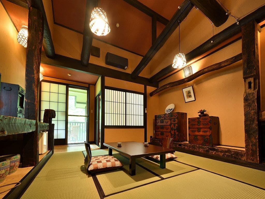 和室と囲炉裏の間二間つづきの旅籠ではスタンダードな客室タイプです。客室にはテレビ2台、床暖房が設備され、快適性を求めたつくりとなっております。窓を開けると温川が眼下に見渡せ、窓外には鳥のえさも設置され、翌日は鳥のさえずりで目が覚めるかもしれません。※全ての客室を禁煙とさせていただいております。(電子たばこも含む)お煙草を吸われるお客様は、館内指定の場所にて喫煙をしていただきますよう、ご理解ご協力の程お願い申し上げます。